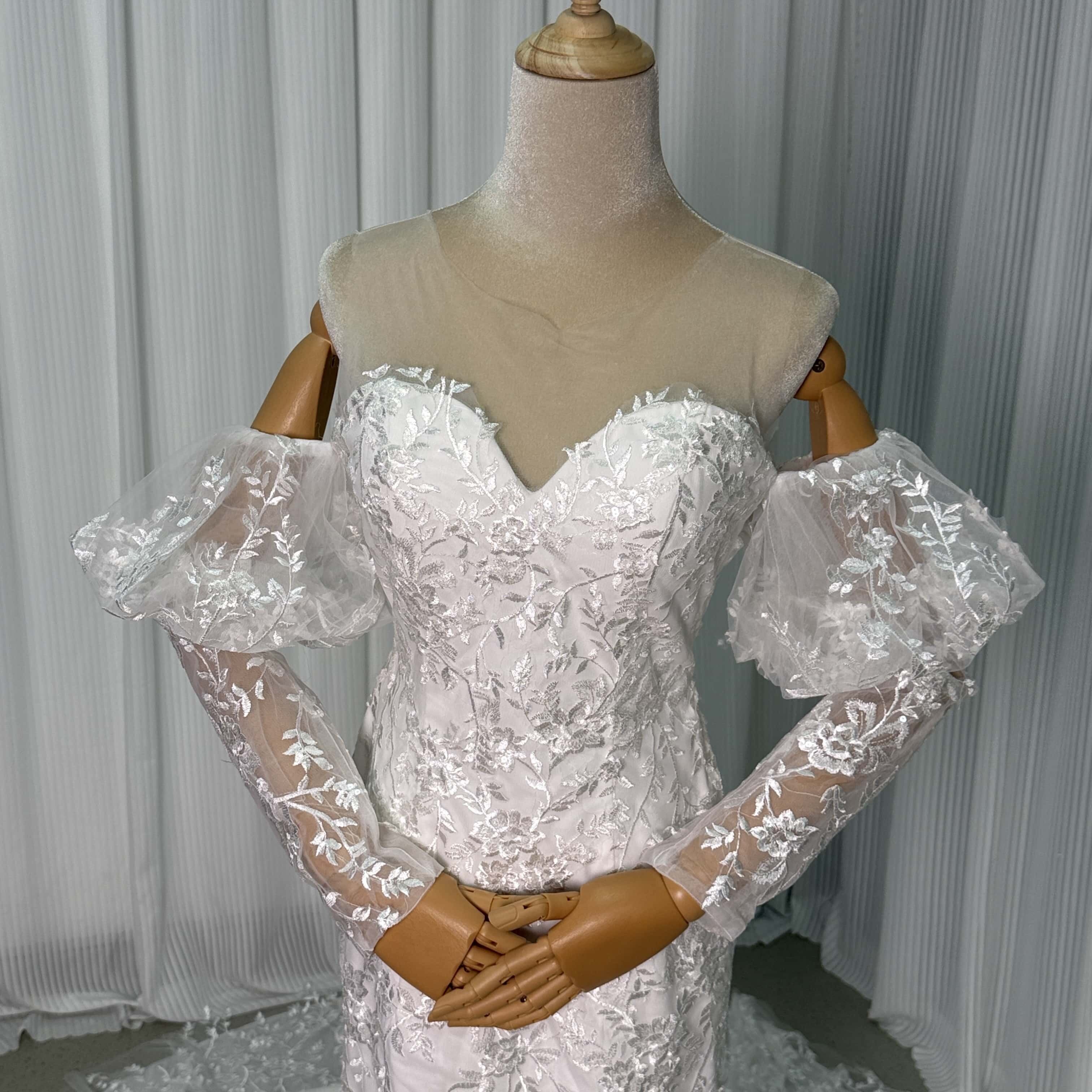 豪華!ウエディングドレス マーメイドライン パフスリーブ 贅沢な総レース 華やかなトレーン 前撮り