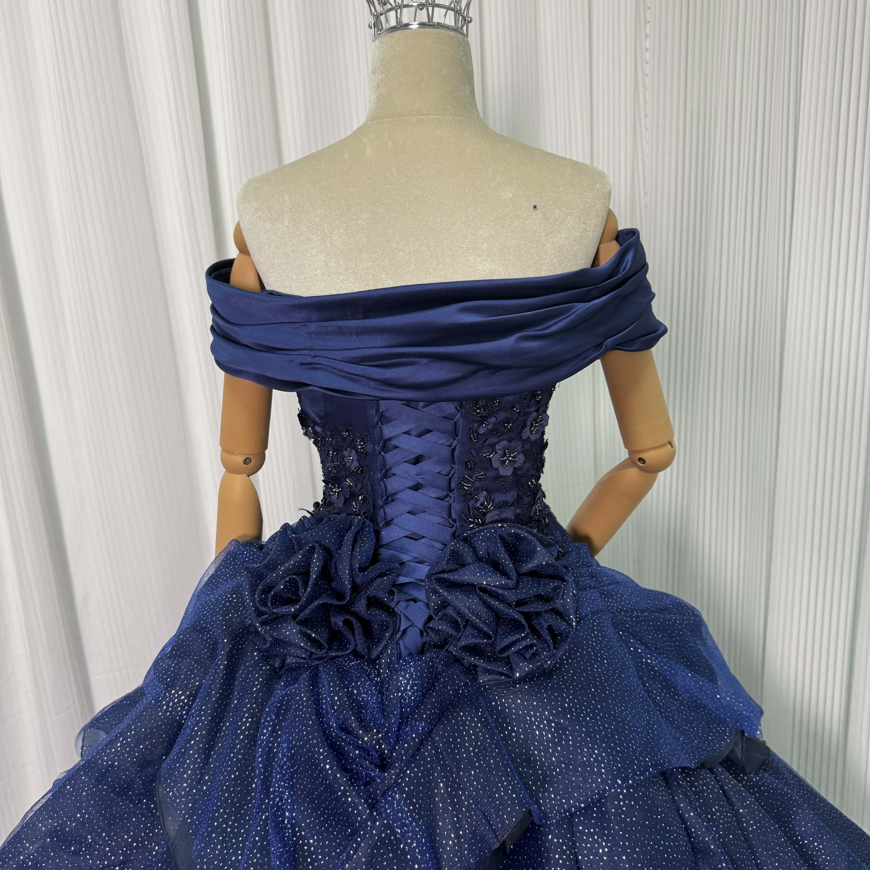 豪華!カラードレス ネイビー ティアードのドレス オフショルダー 3D立体レース刺繍 キラキラチュール ボリュームドレス 花嫁