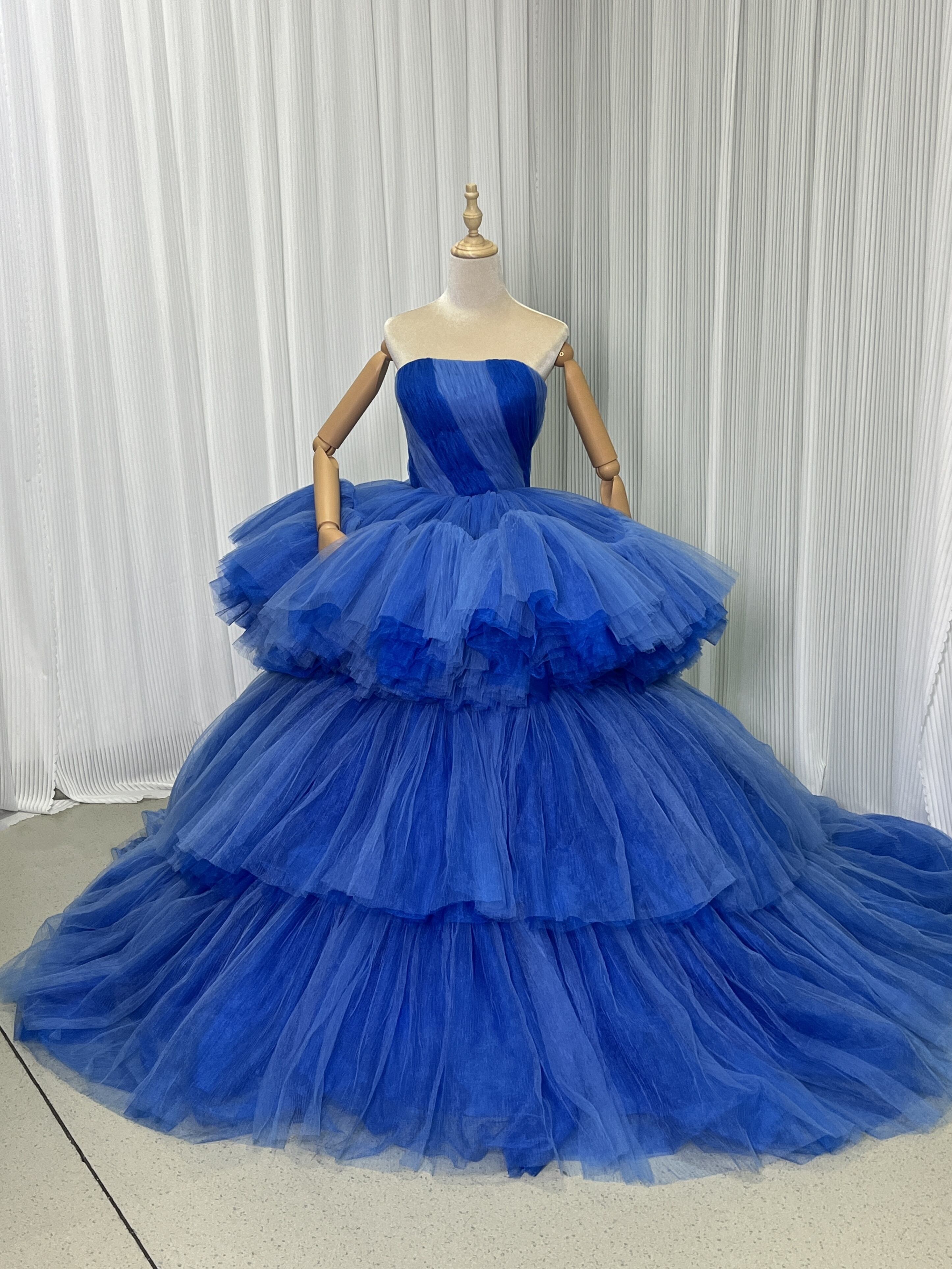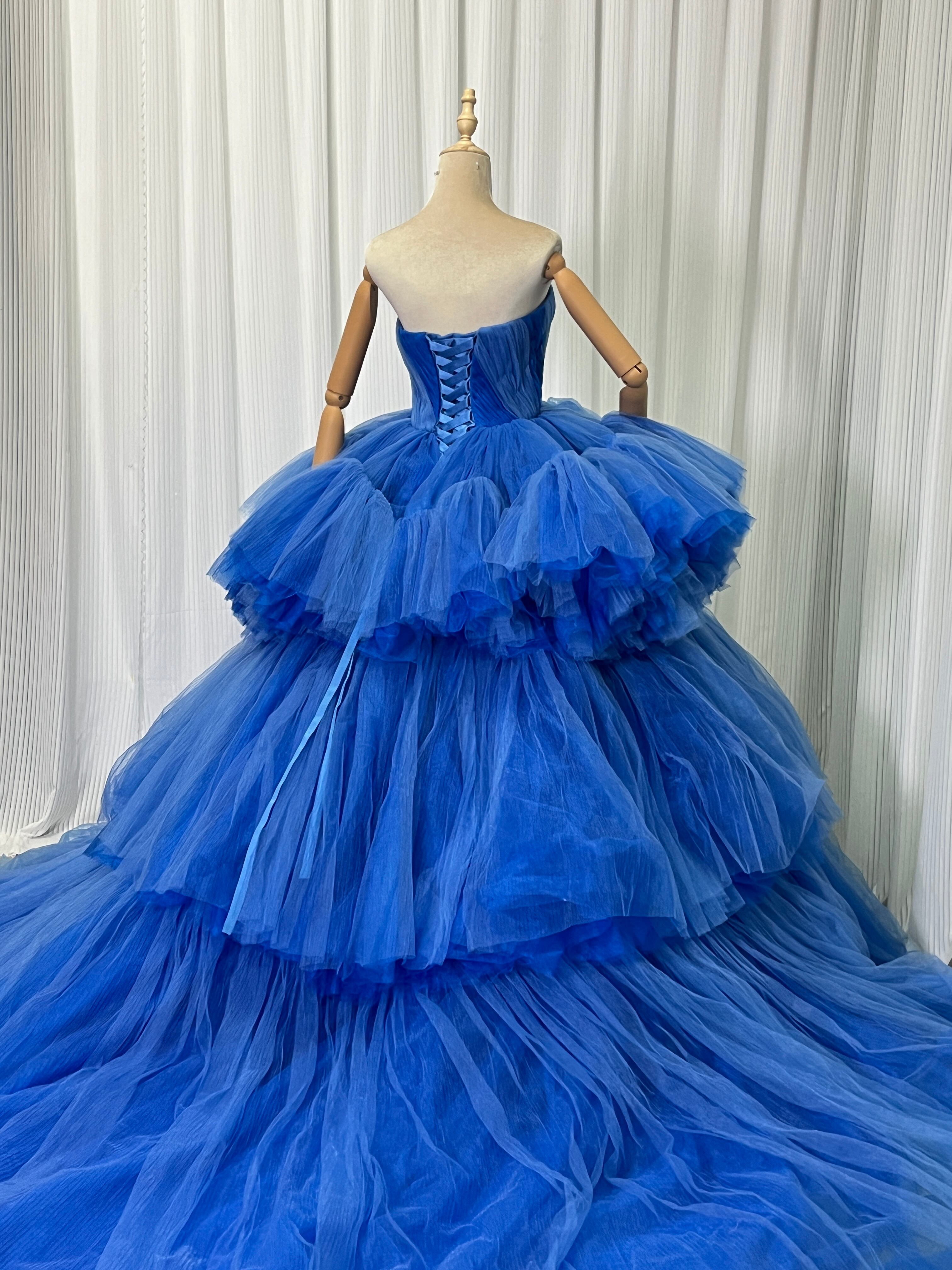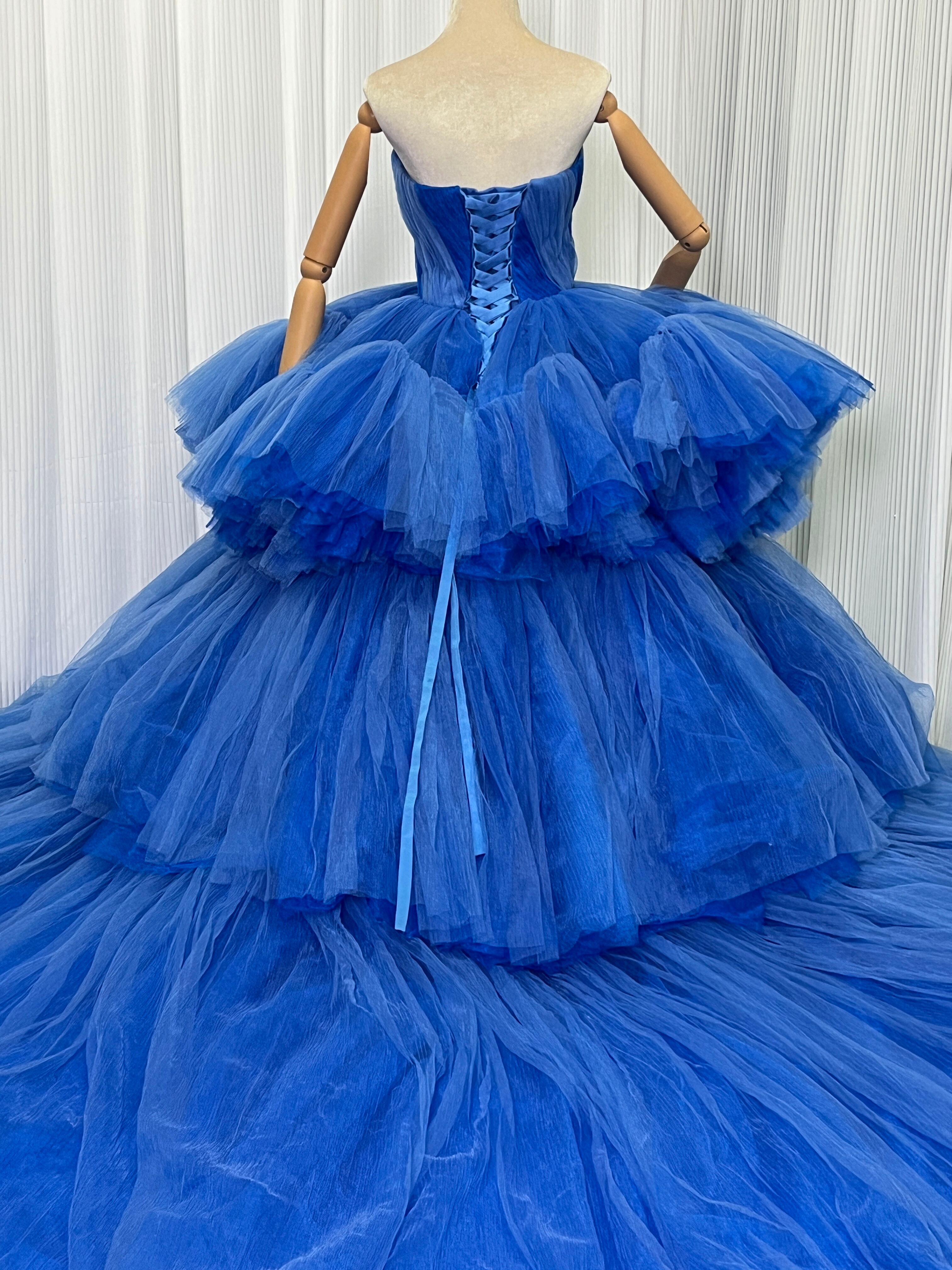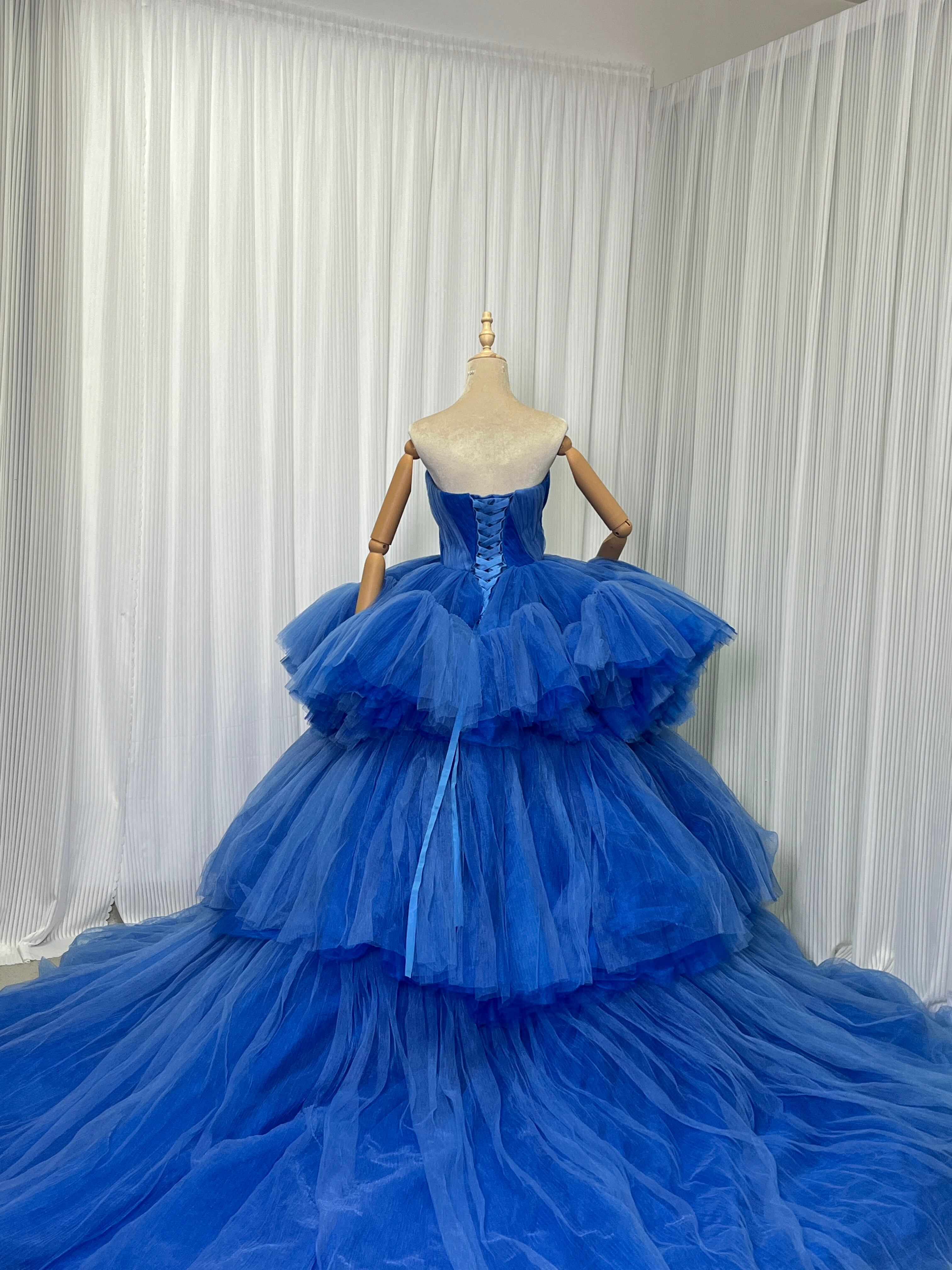 カラードレス ボリュームドレス ブルー ベアトップ プリンセスライン グラデーション 編み上げ 花嫁