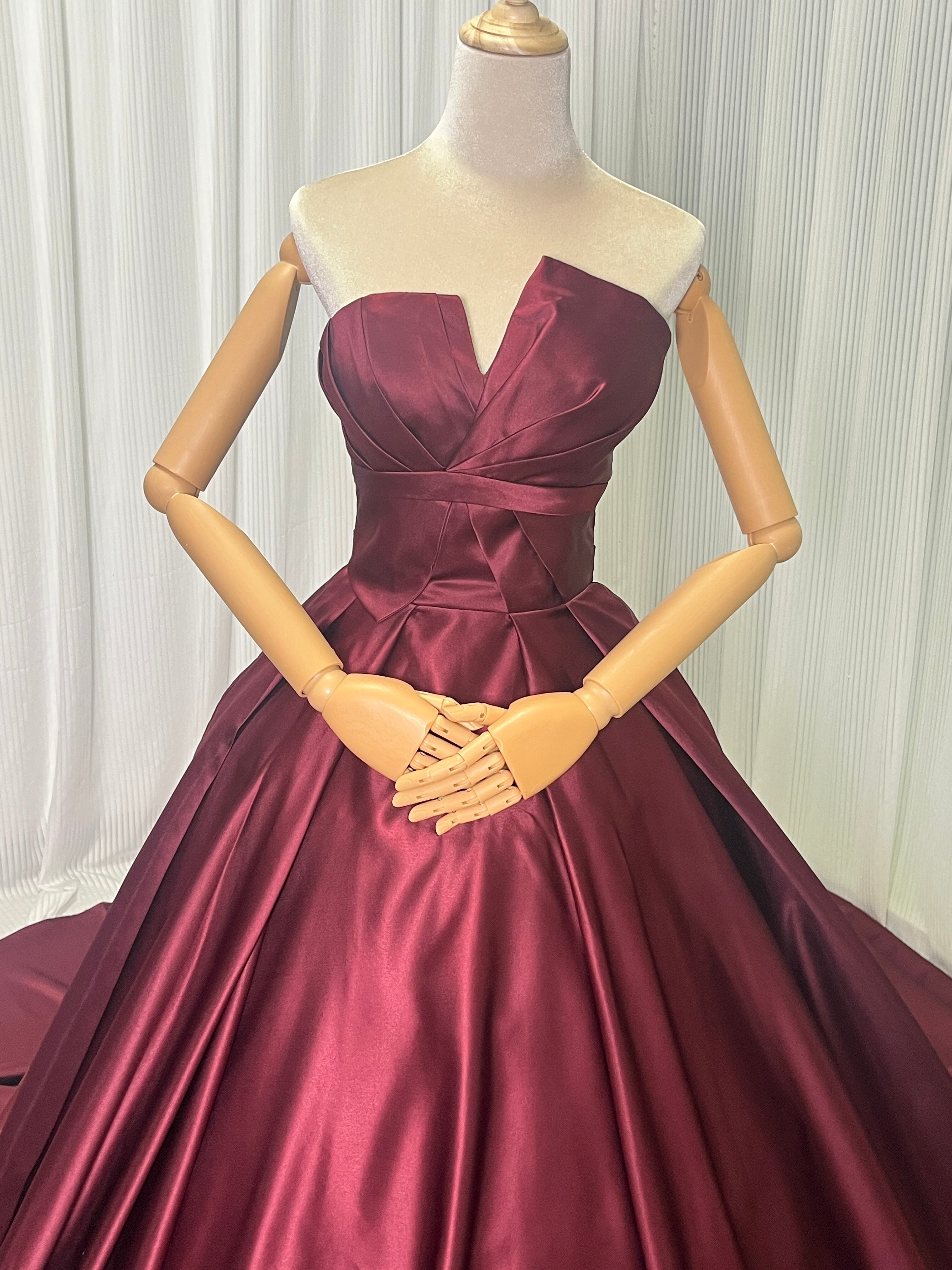 エレガント ボルドー色 カラードレス 光沢サテン ベアトップ スリット 演奏会/音楽会 ロングトレーン