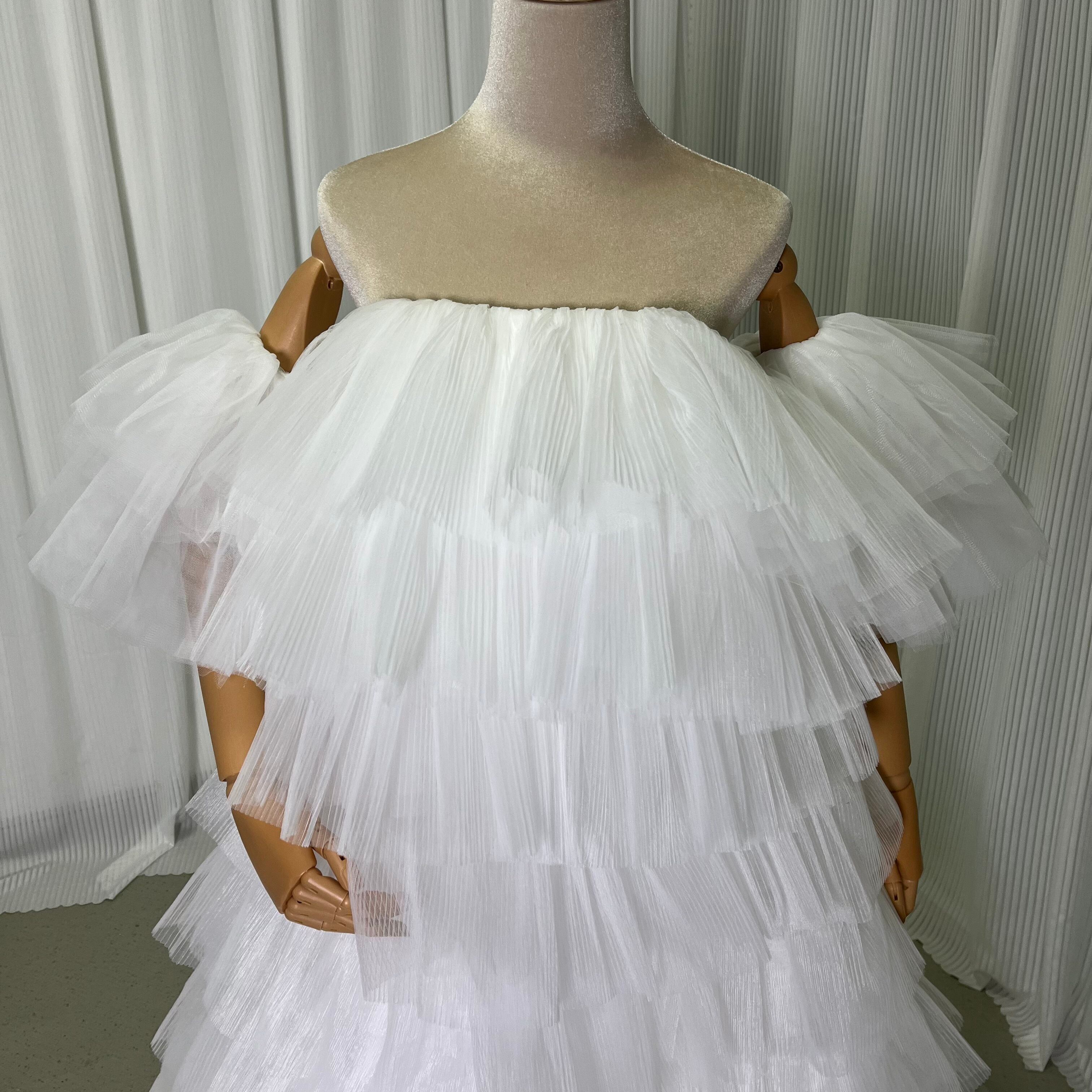 人気上昇!ウェディングドレス ベアトップ ふわふわ袖 リボン 柔らかく重ねたチュールスカート 可愛い