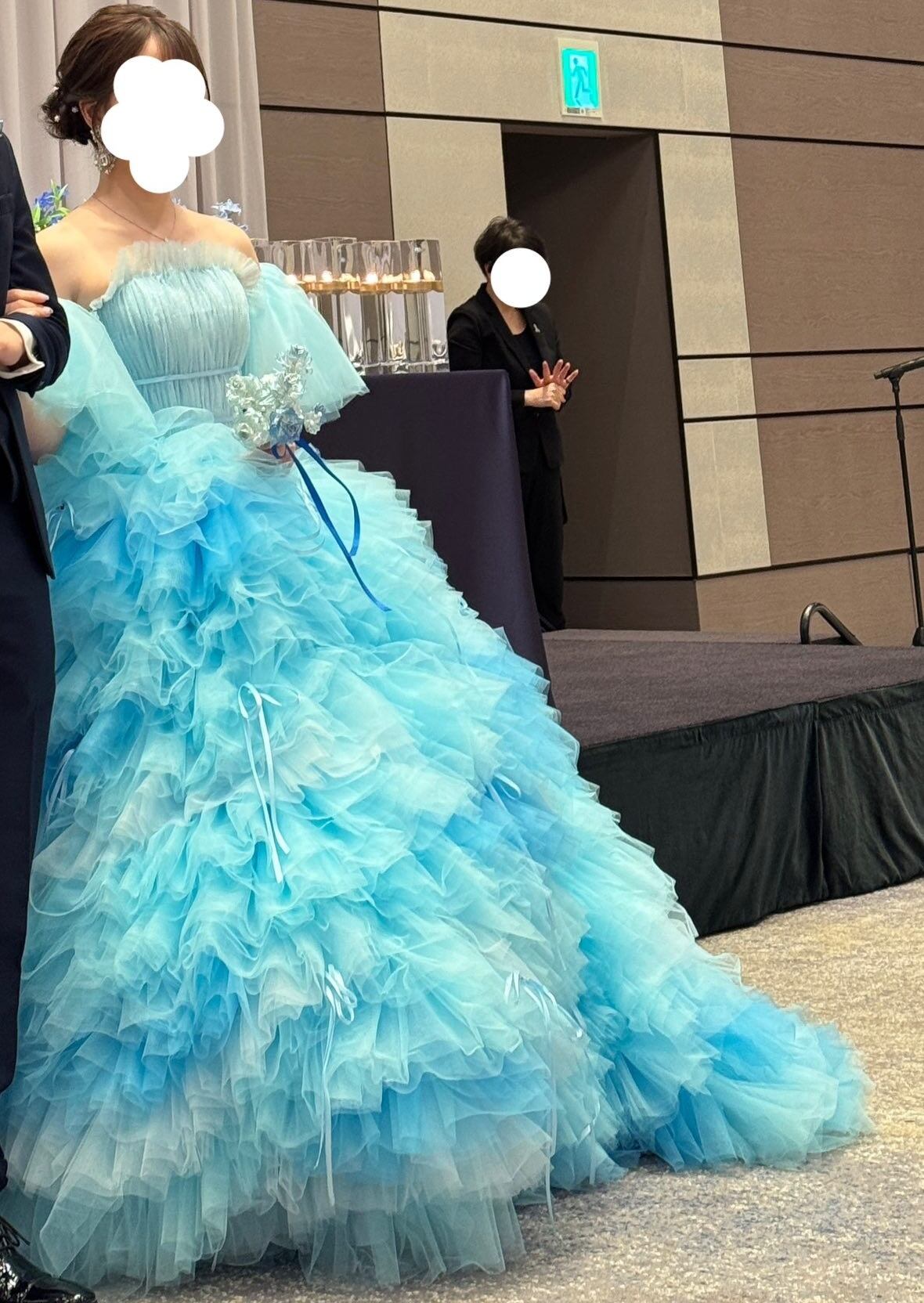 実例写真!ボリュームカラードレス ブルー グラデーション リボン パフスリーブ トレーン もこもこ ふわふわ 韓国風