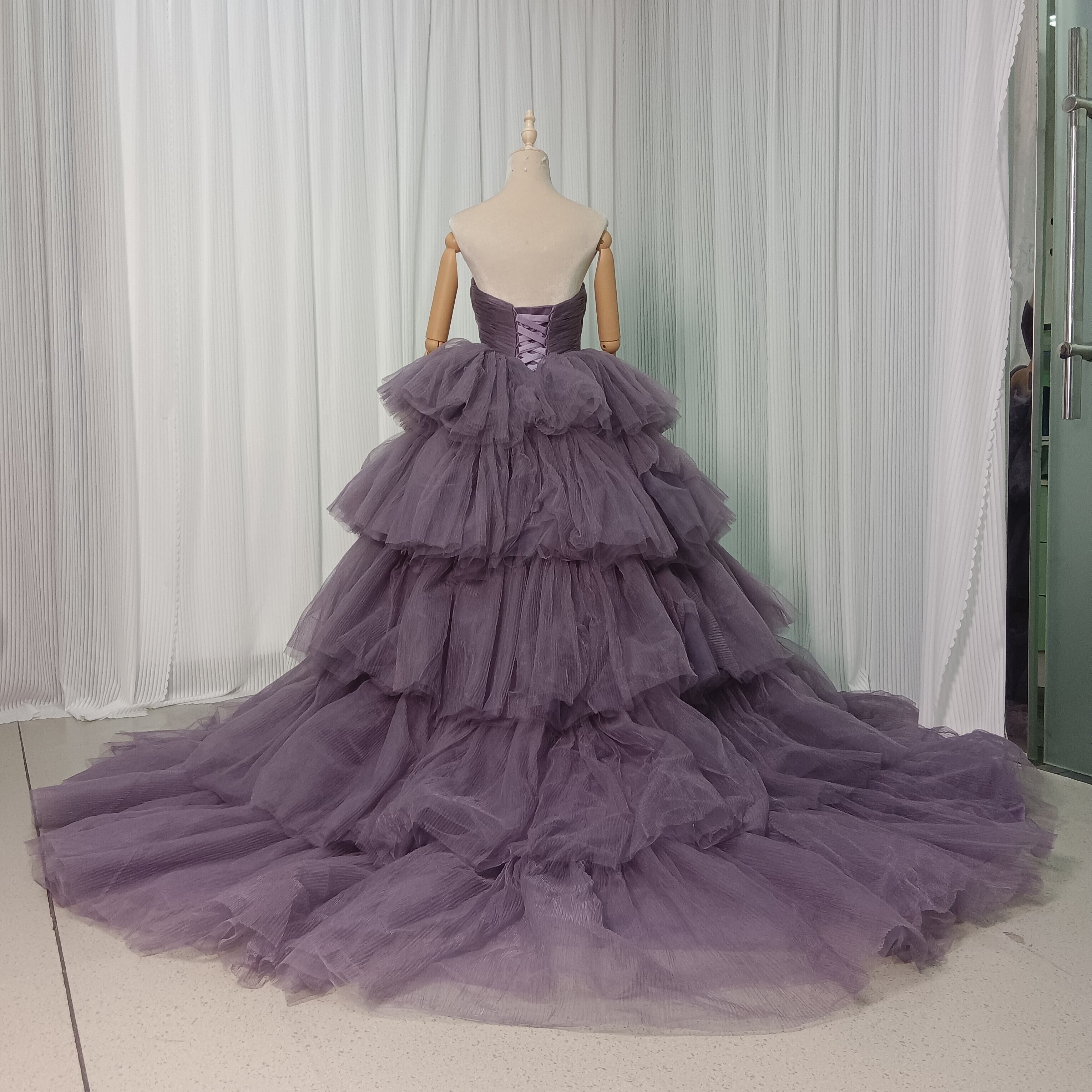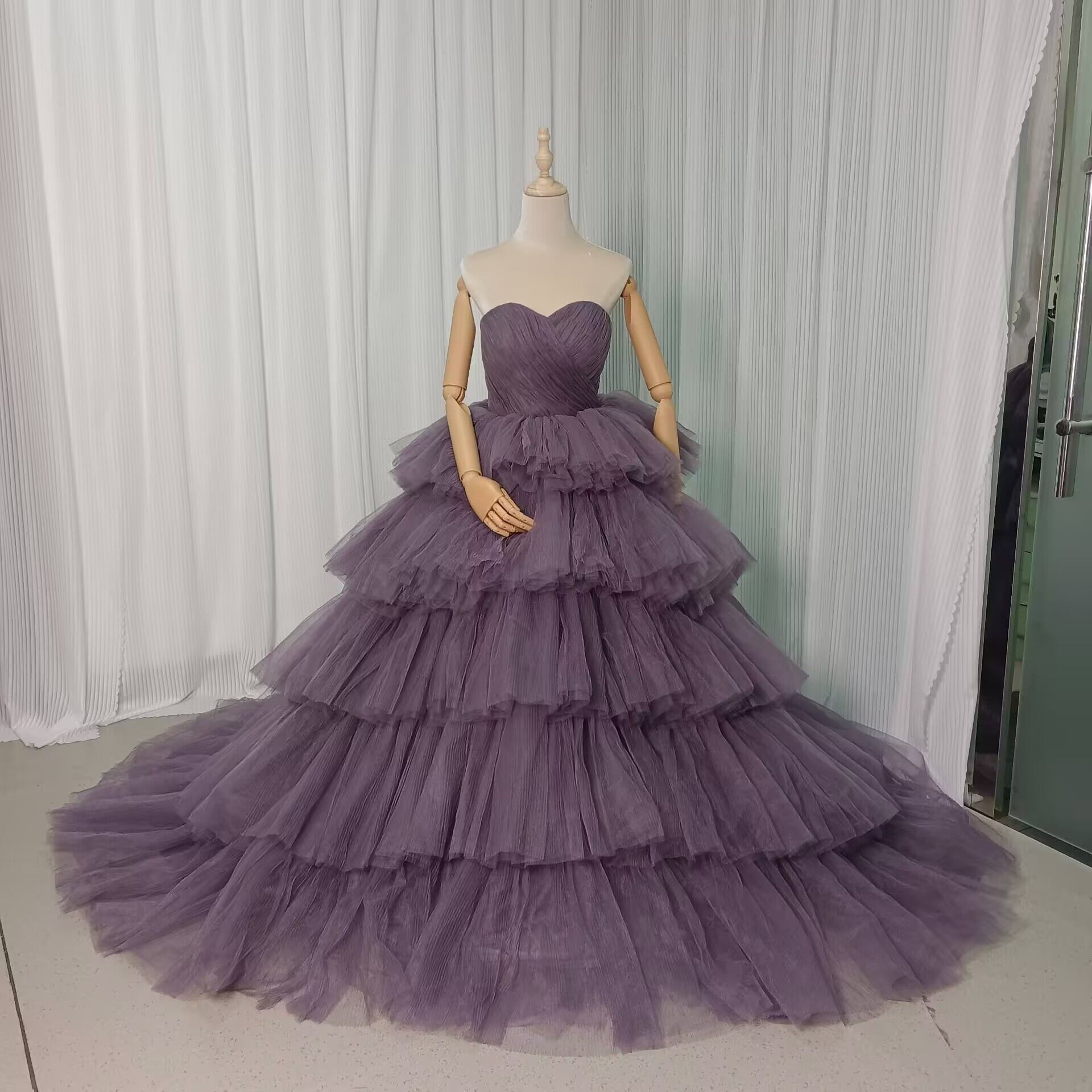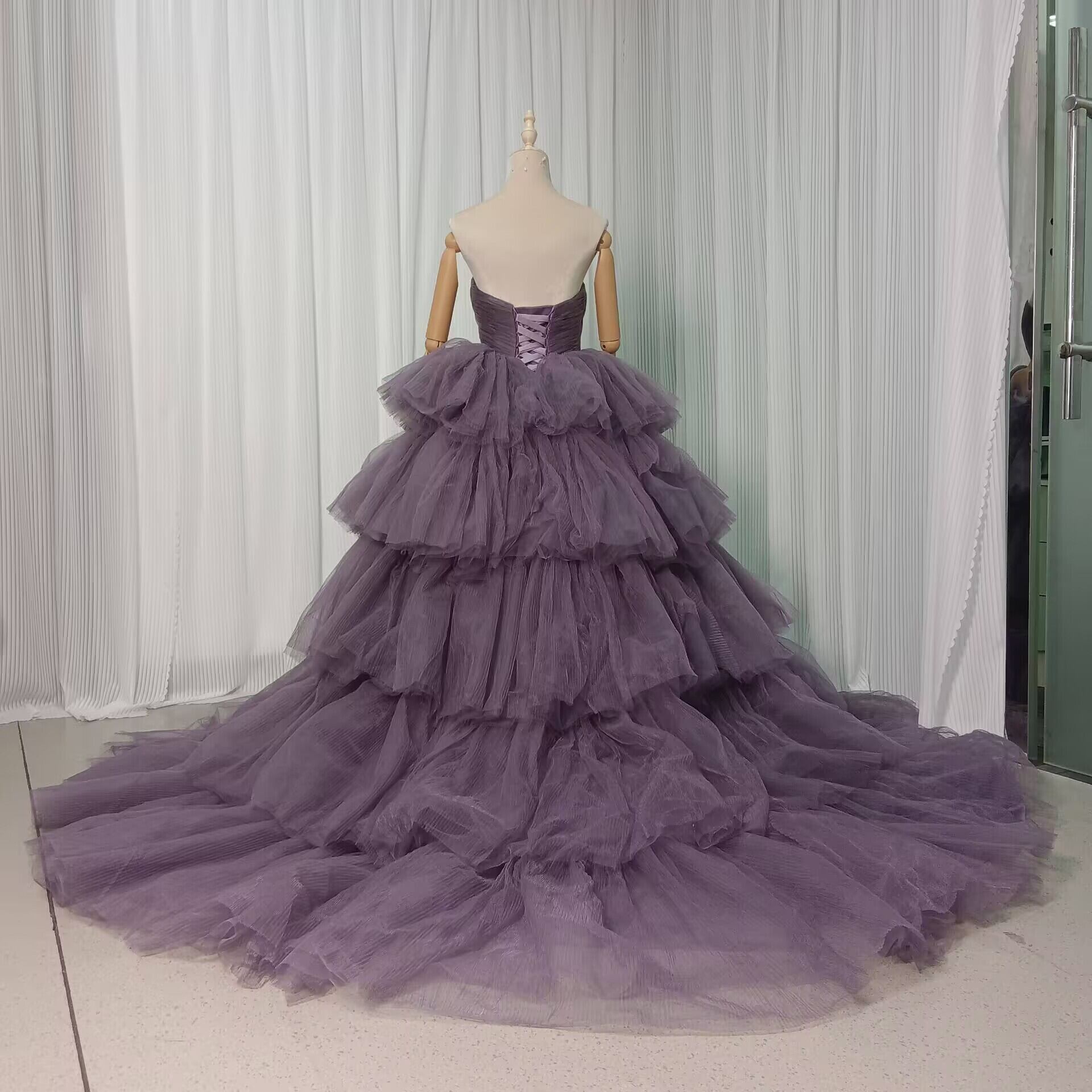 豪華!カラードレス パープル ベアトップ 柔らかく重ねたチュールスカート 編み上げ 披露宴 可愛い