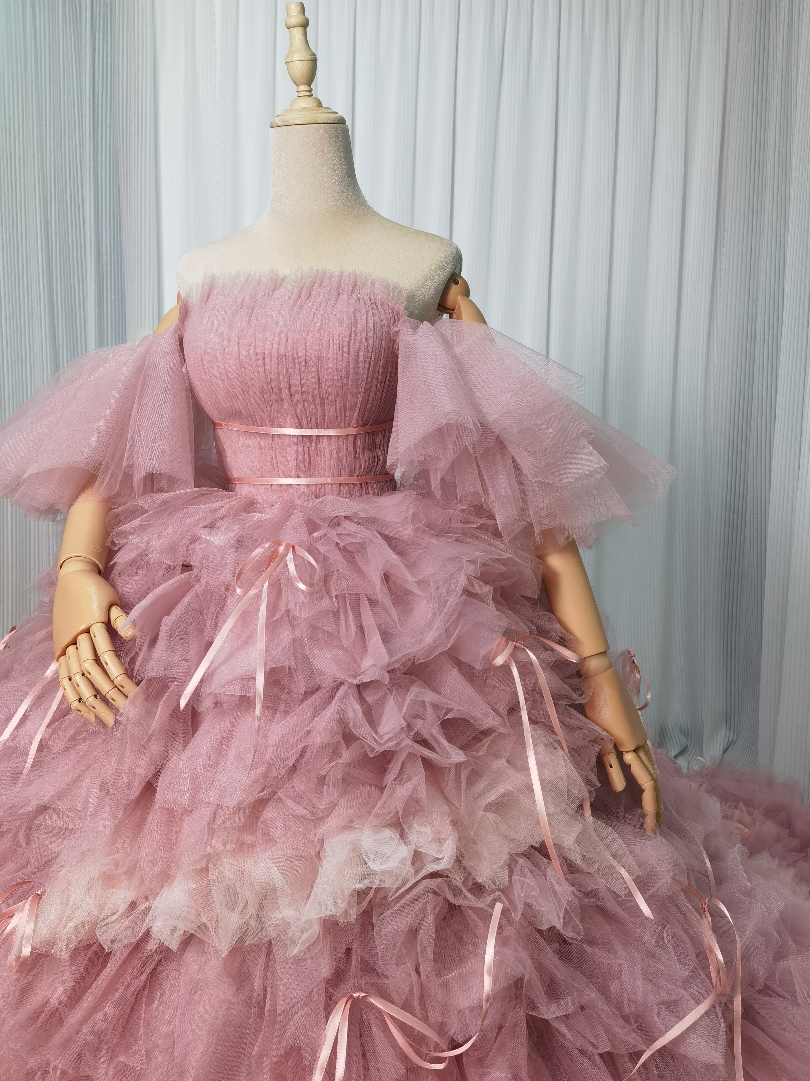 豪華!カラードレス ピンク 柔らかく重ねたチュールスカート リボン ベアトップ ふわふわ袖 花嫁 可愛い
