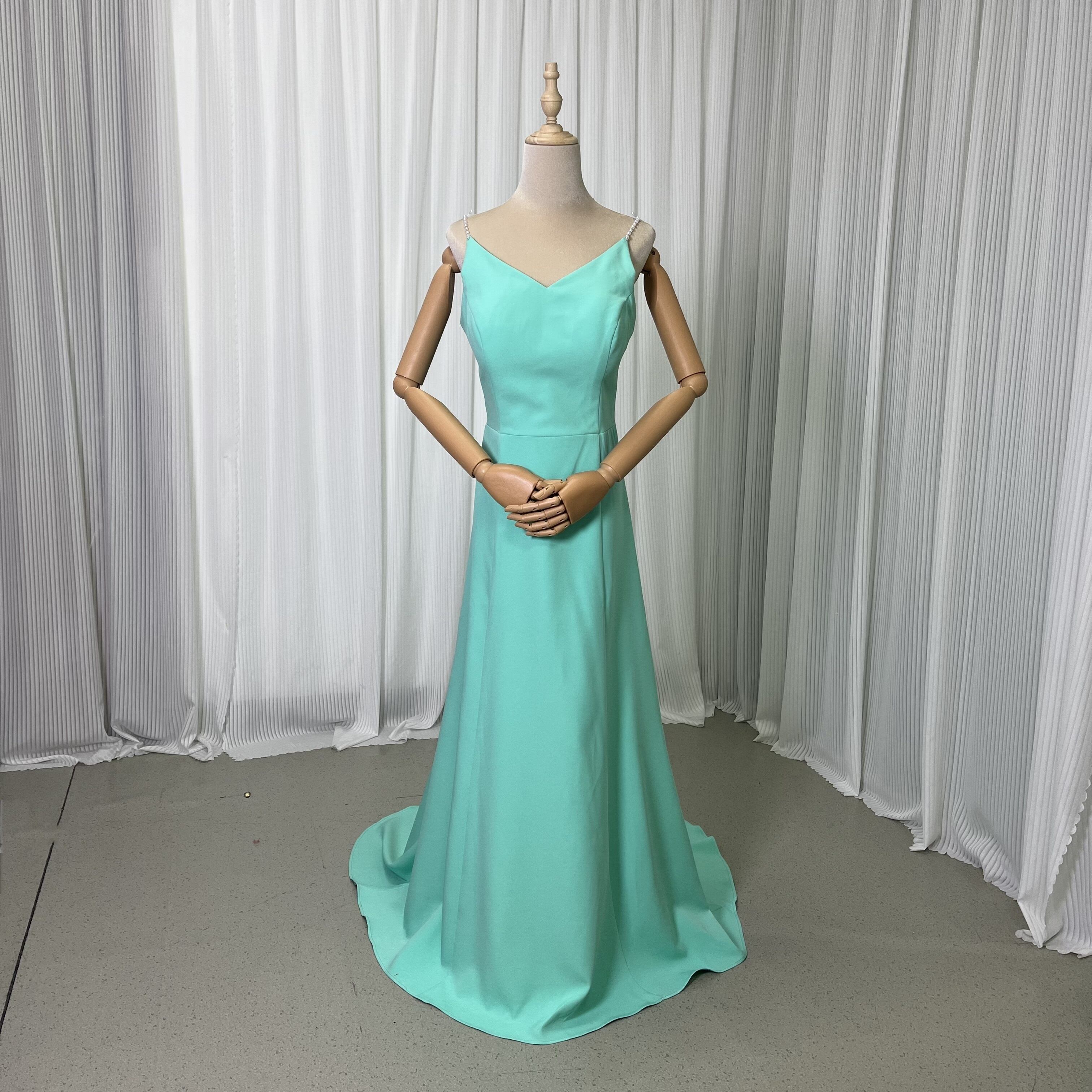 ブルー シンプルスレンダーカラードレス パール紐 Vネック ファスナー 前撮り