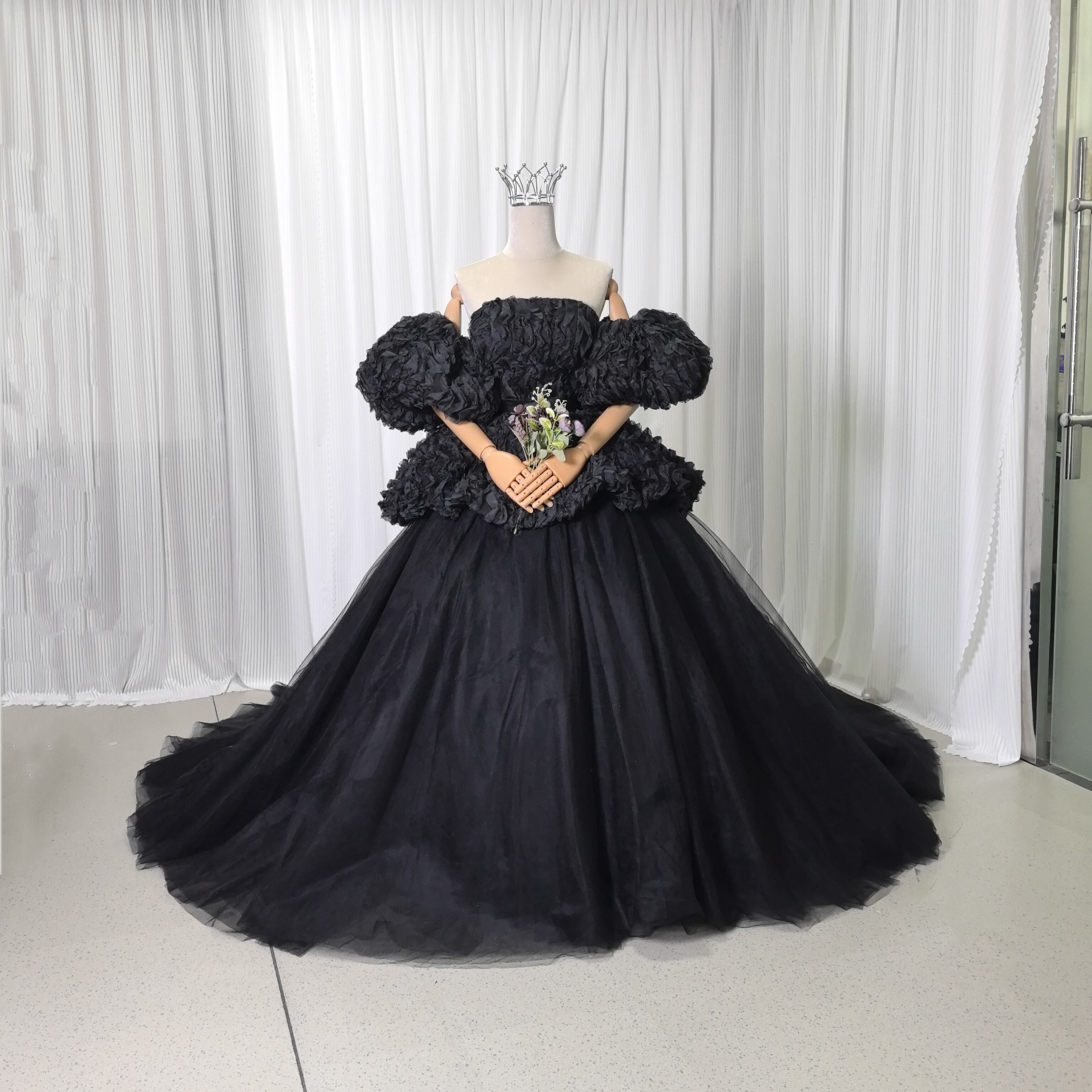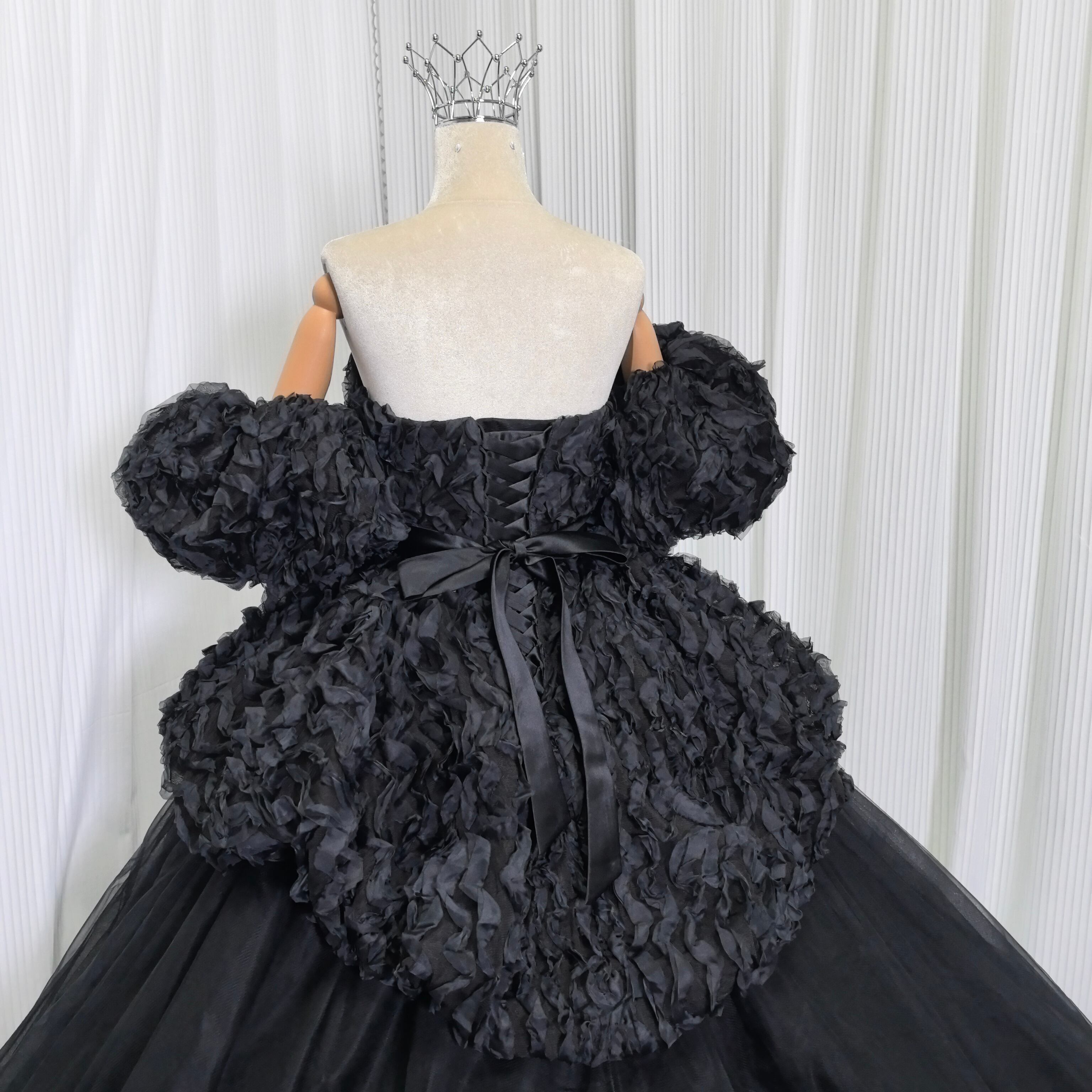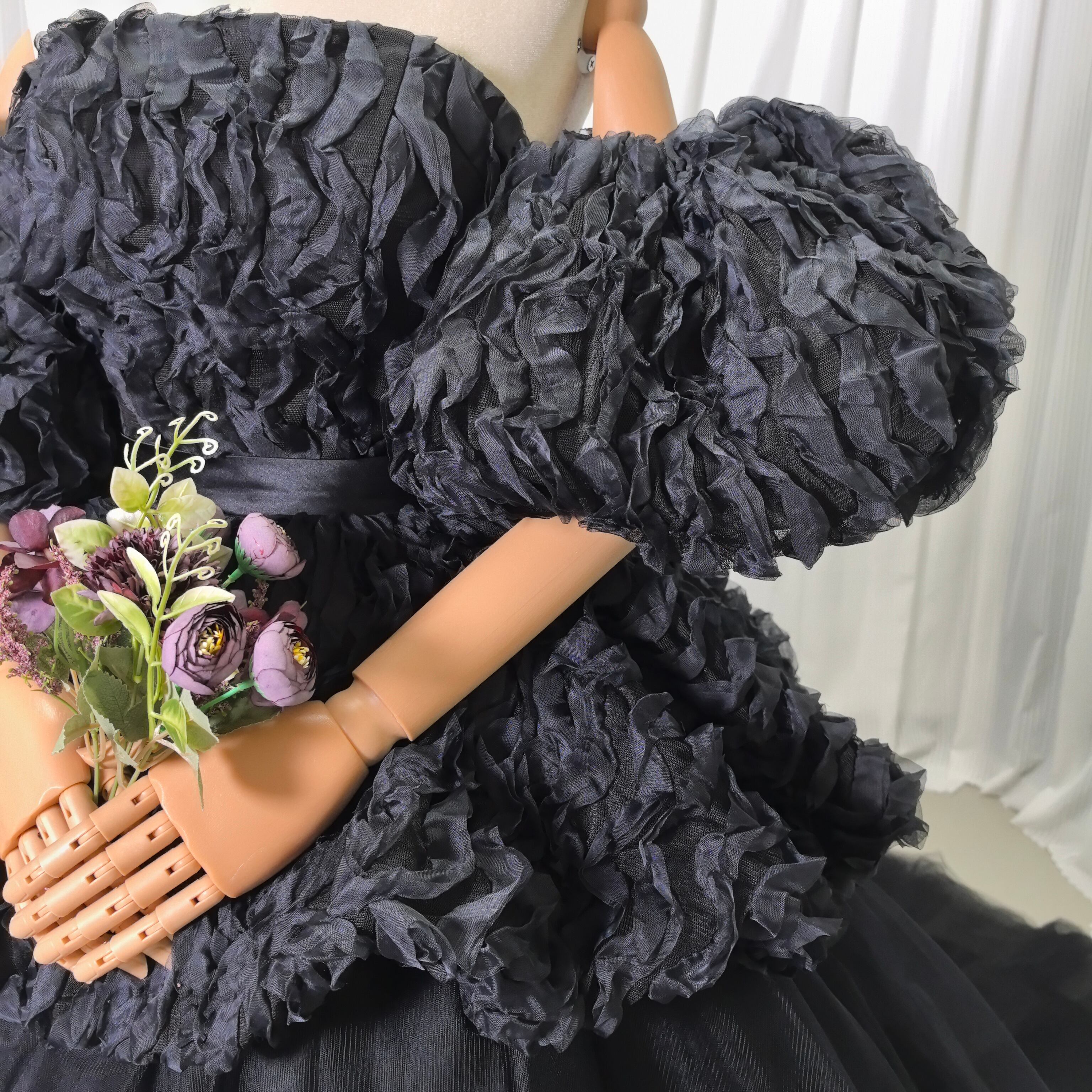 豪華!優しい パーティードレス ブラック ベアトップ パフスリーブ ウェーブ デザイン感 可愛い 花嫁 披露宴