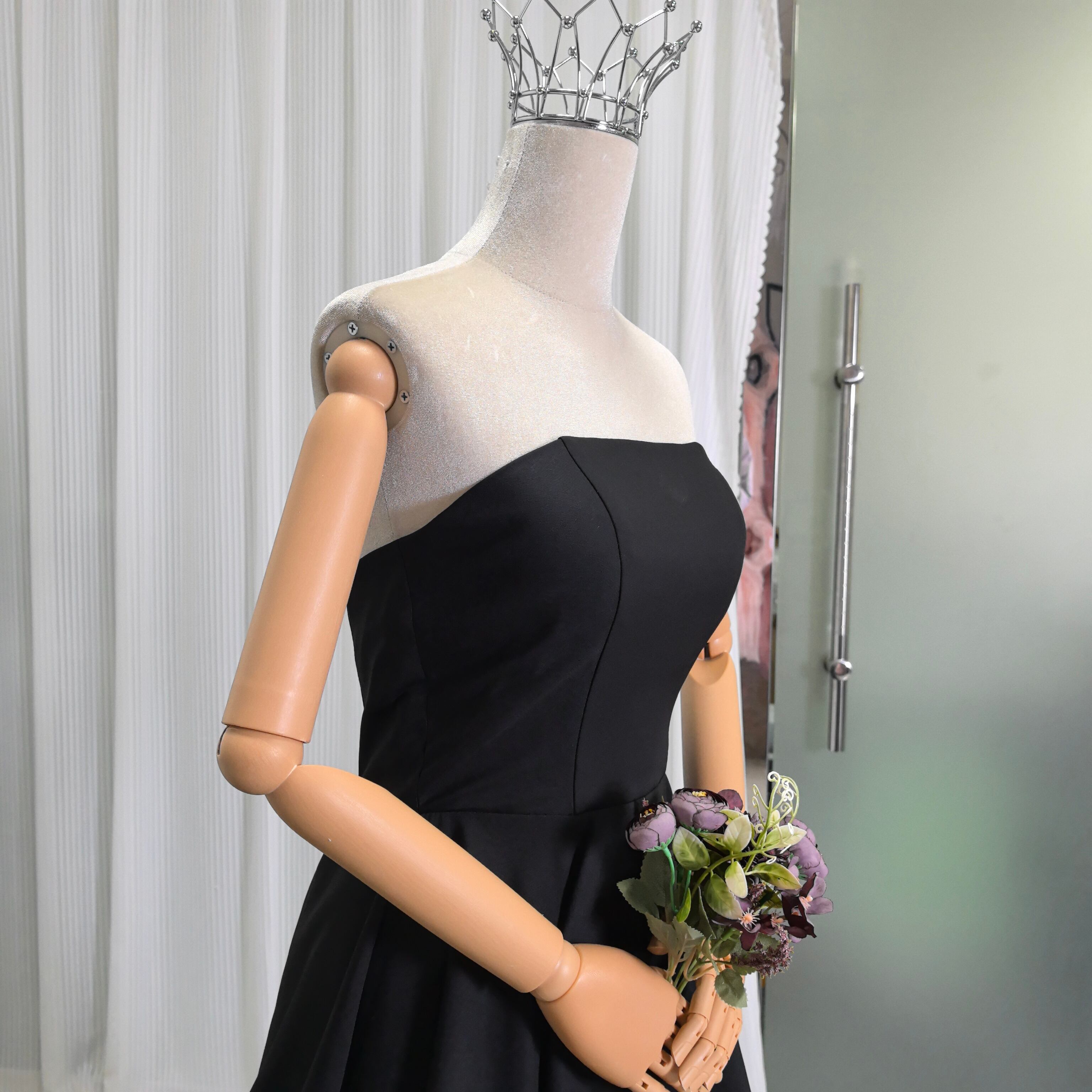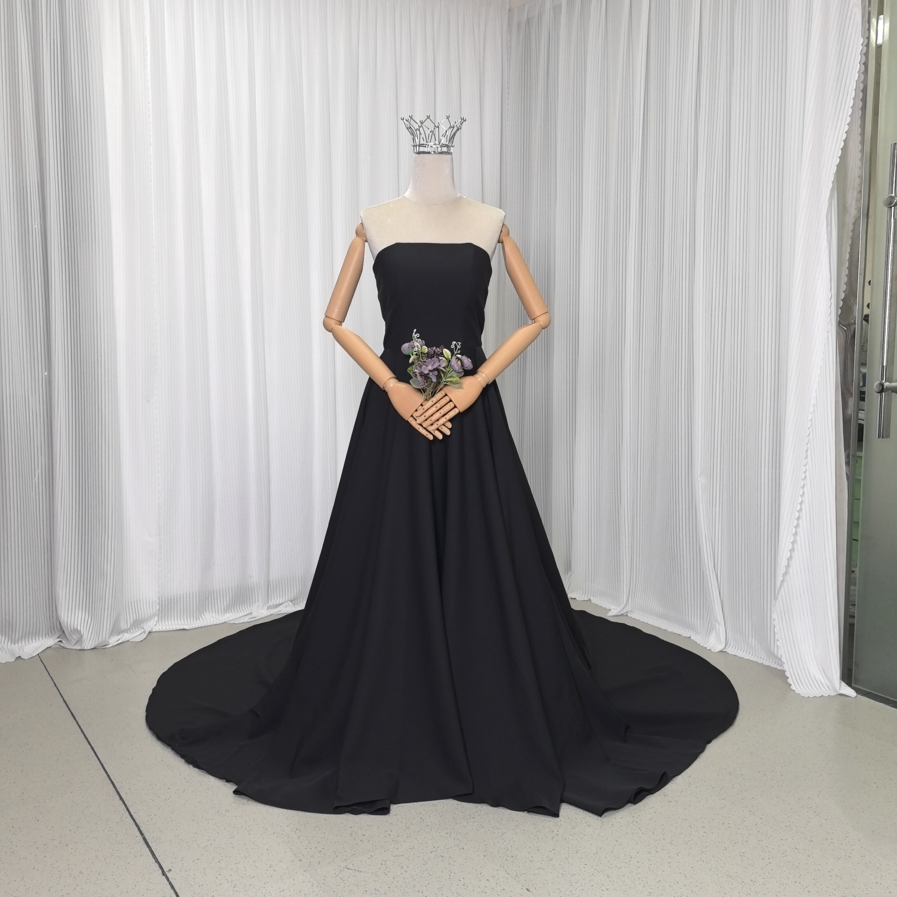 エレガント パーティードレス ブラック ベアトップ クレープ生地 スレンダーライン 編み上げ 前撮り