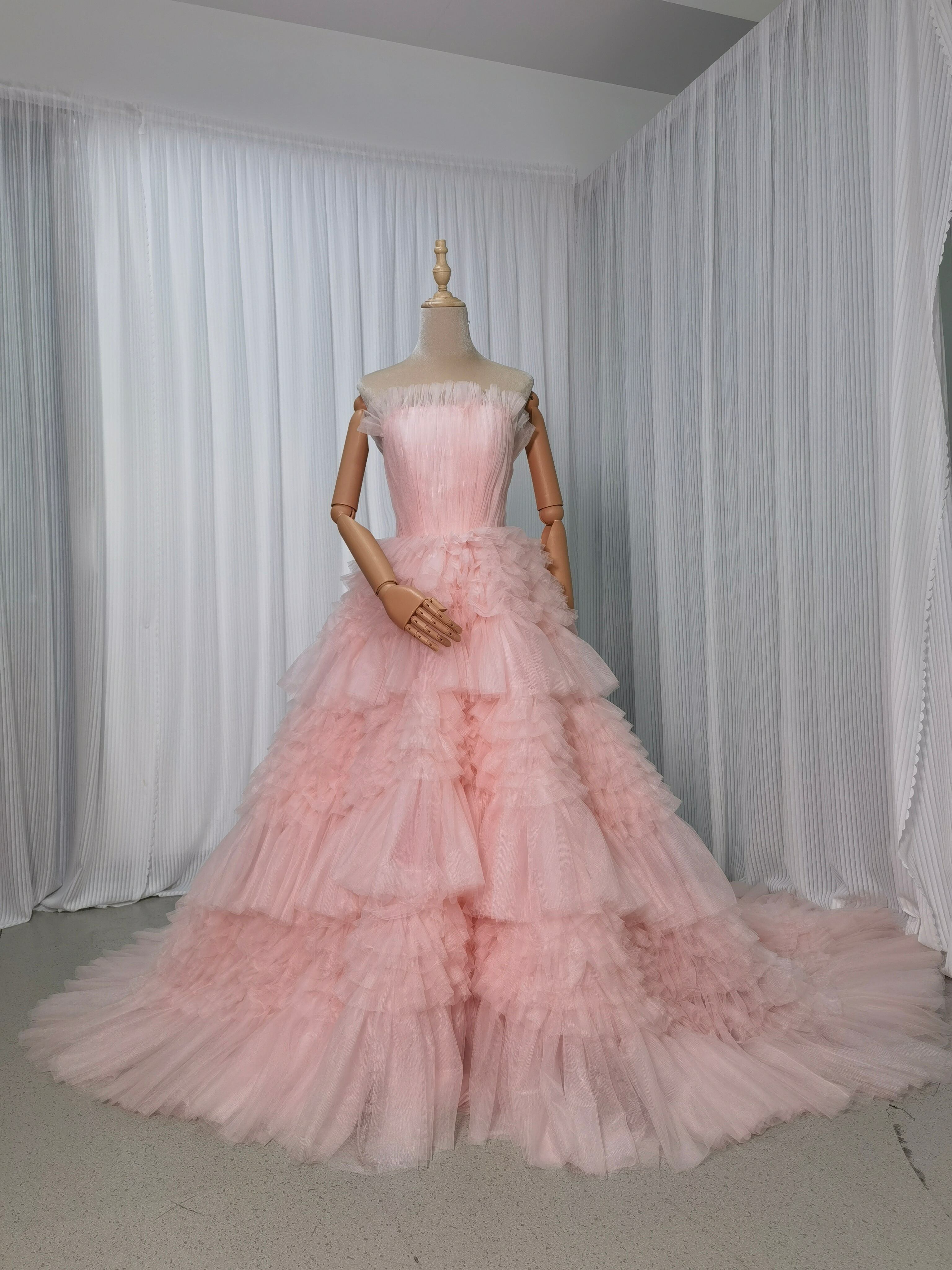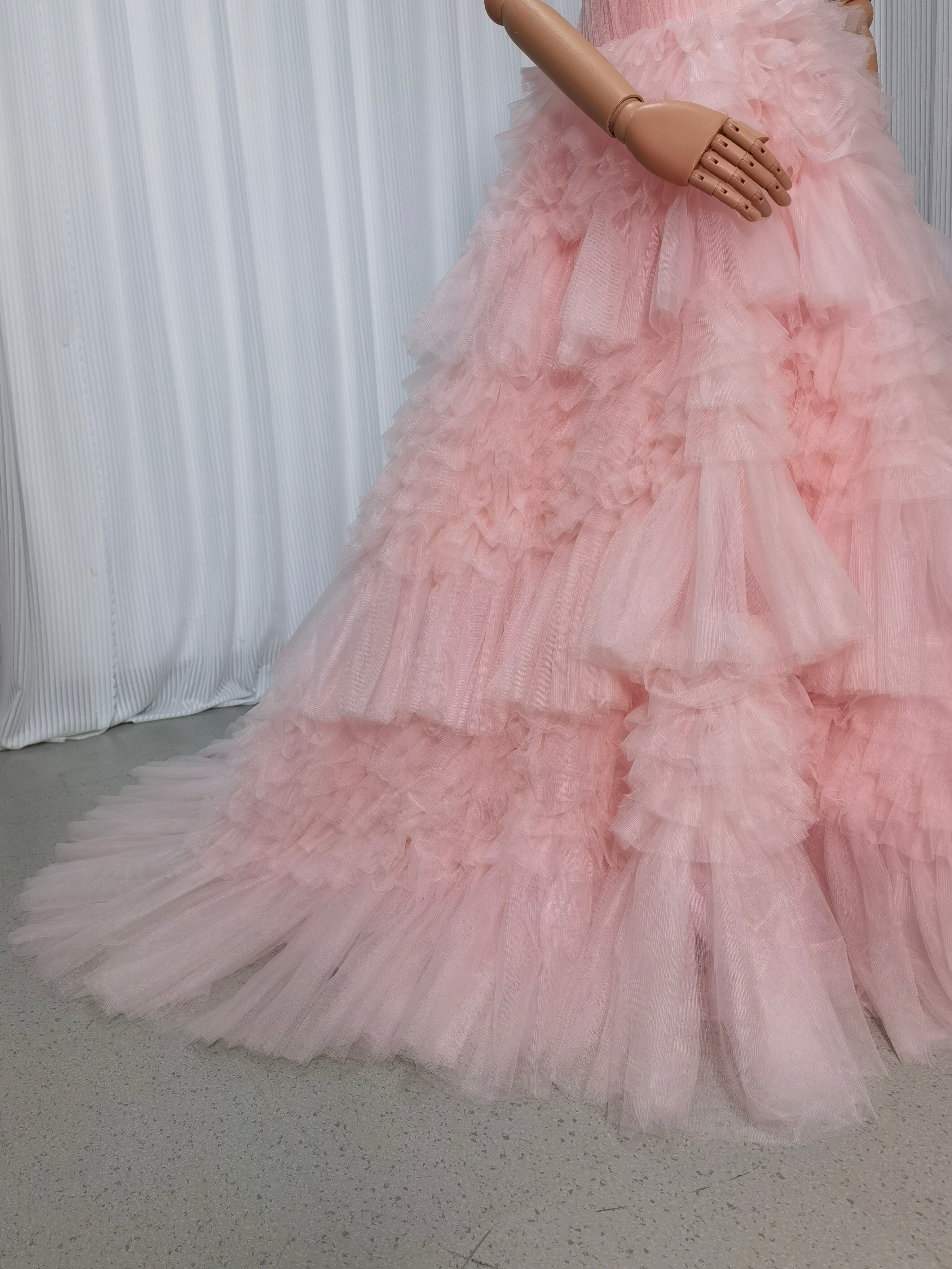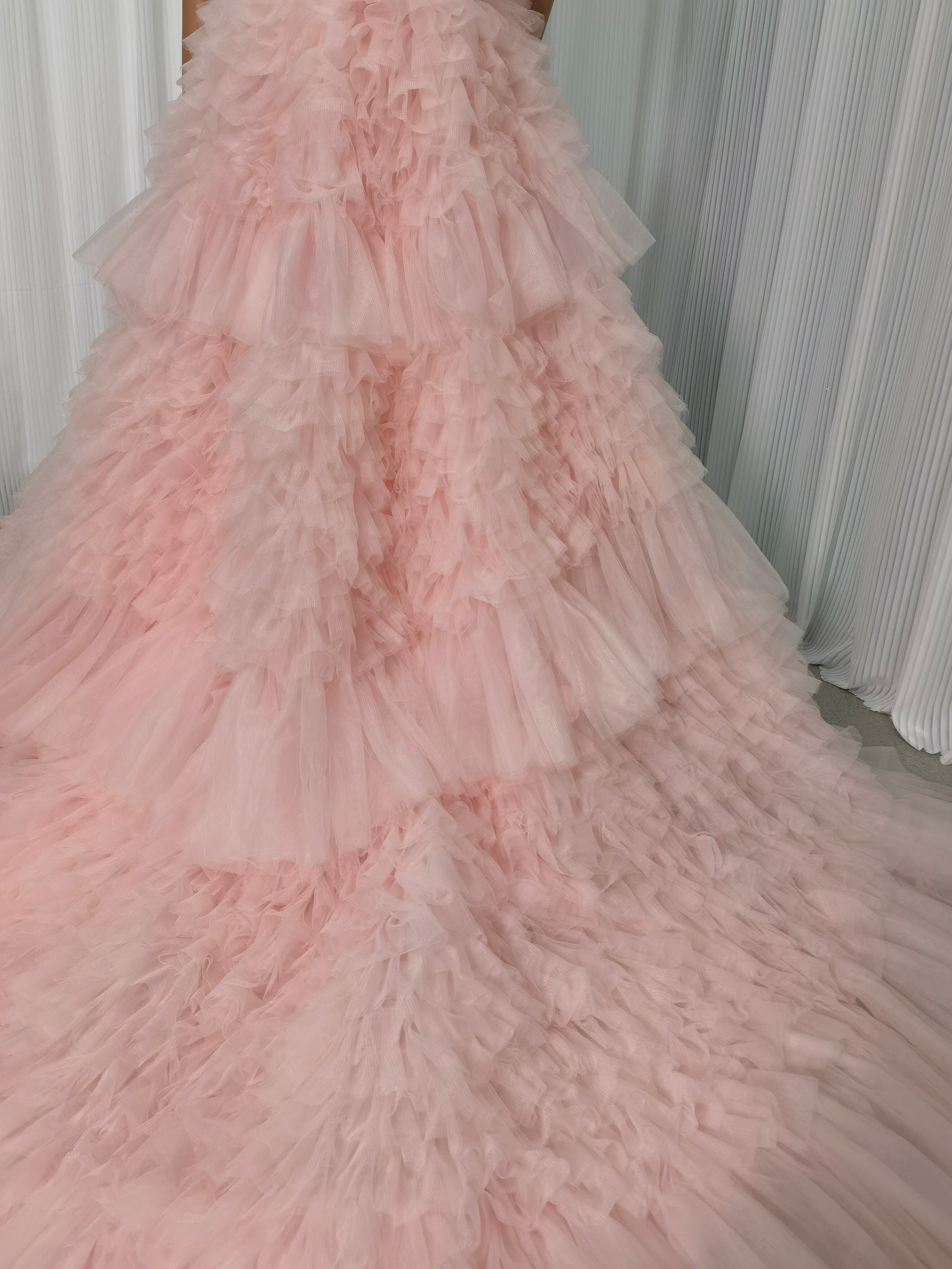 人気上昇!カラードレス ピンク ベアトップ ふわふわ袖 柔らかく重ねたチュールスカート 可愛い 花嫁