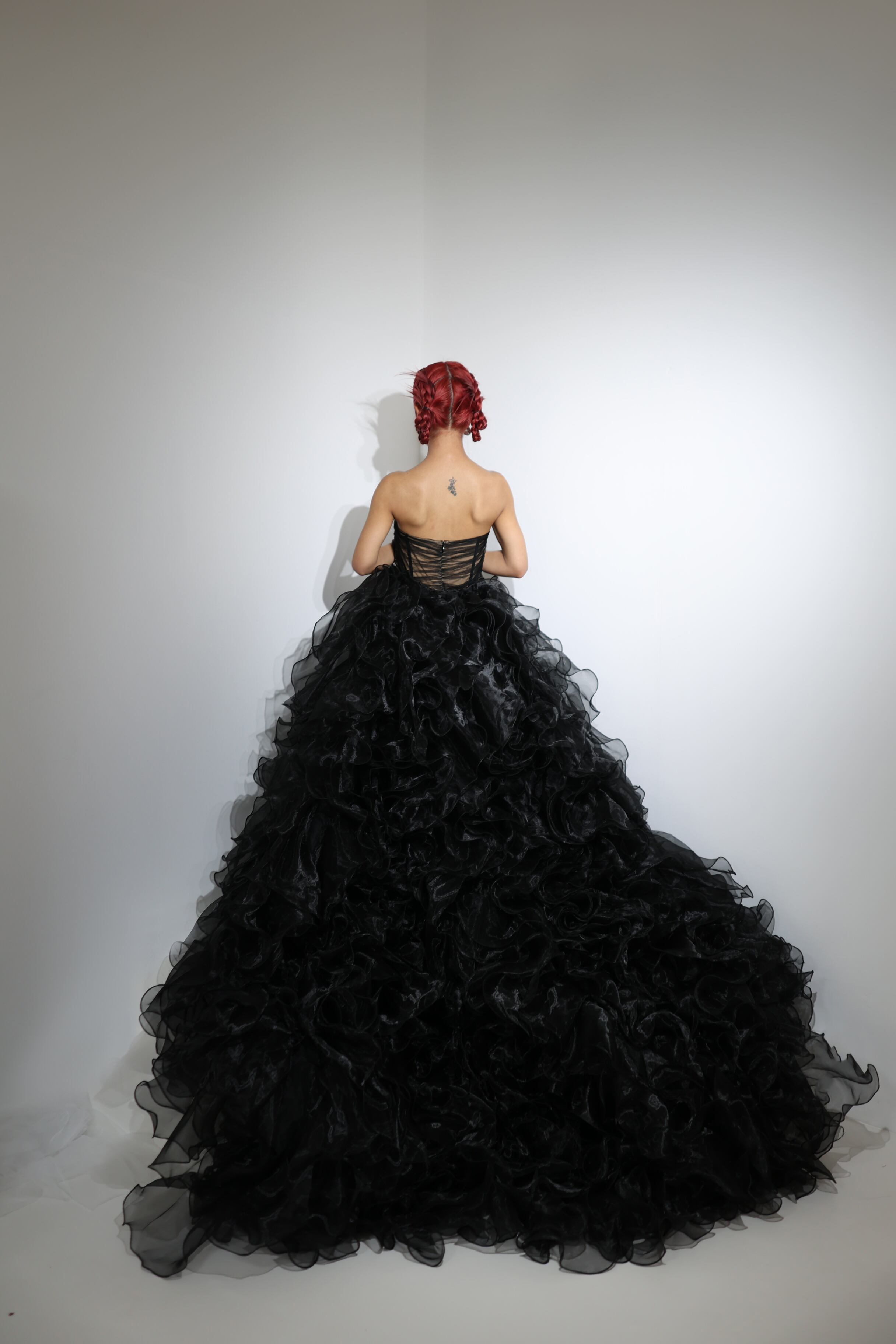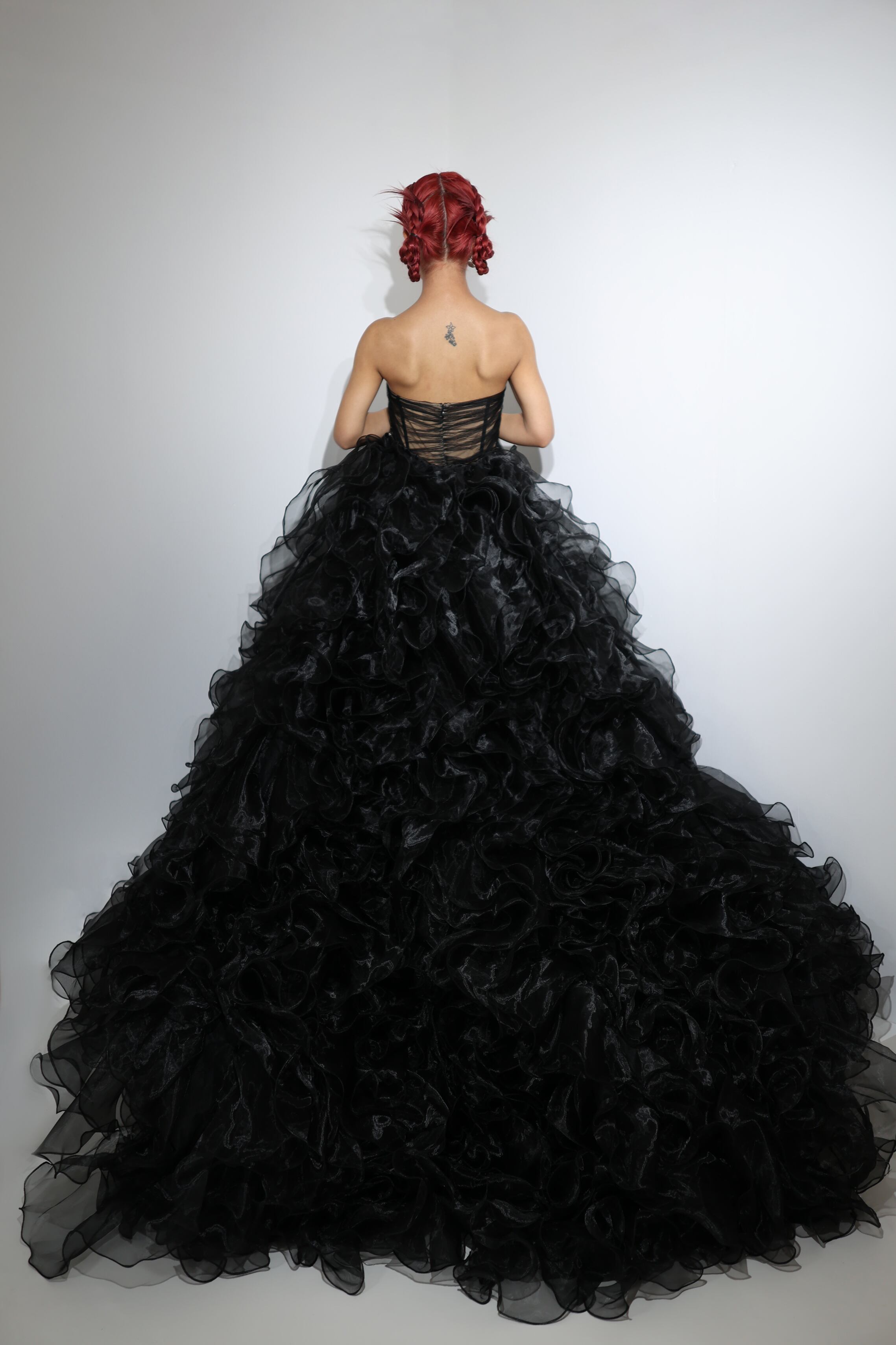 華やかなトレーン ブラック 上質オーガンジー ラッフルフリル 取り外し 绮丽な ふわふわ 前撮り