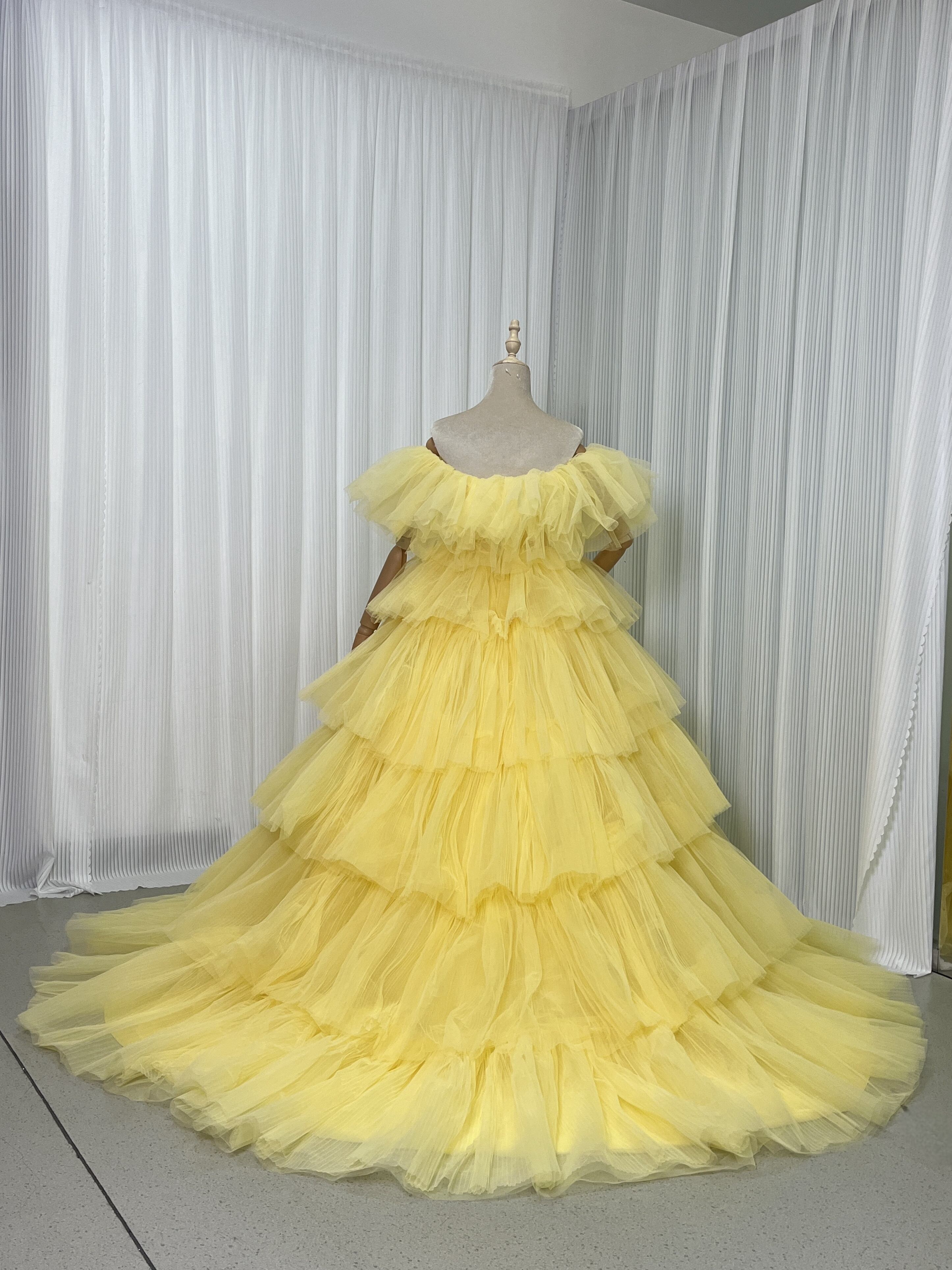 豪華!カラードレス イエロー 取り外しオフショルダー 柔らかく重ねたチュールスカート ファスナー 演奏会 前撮り