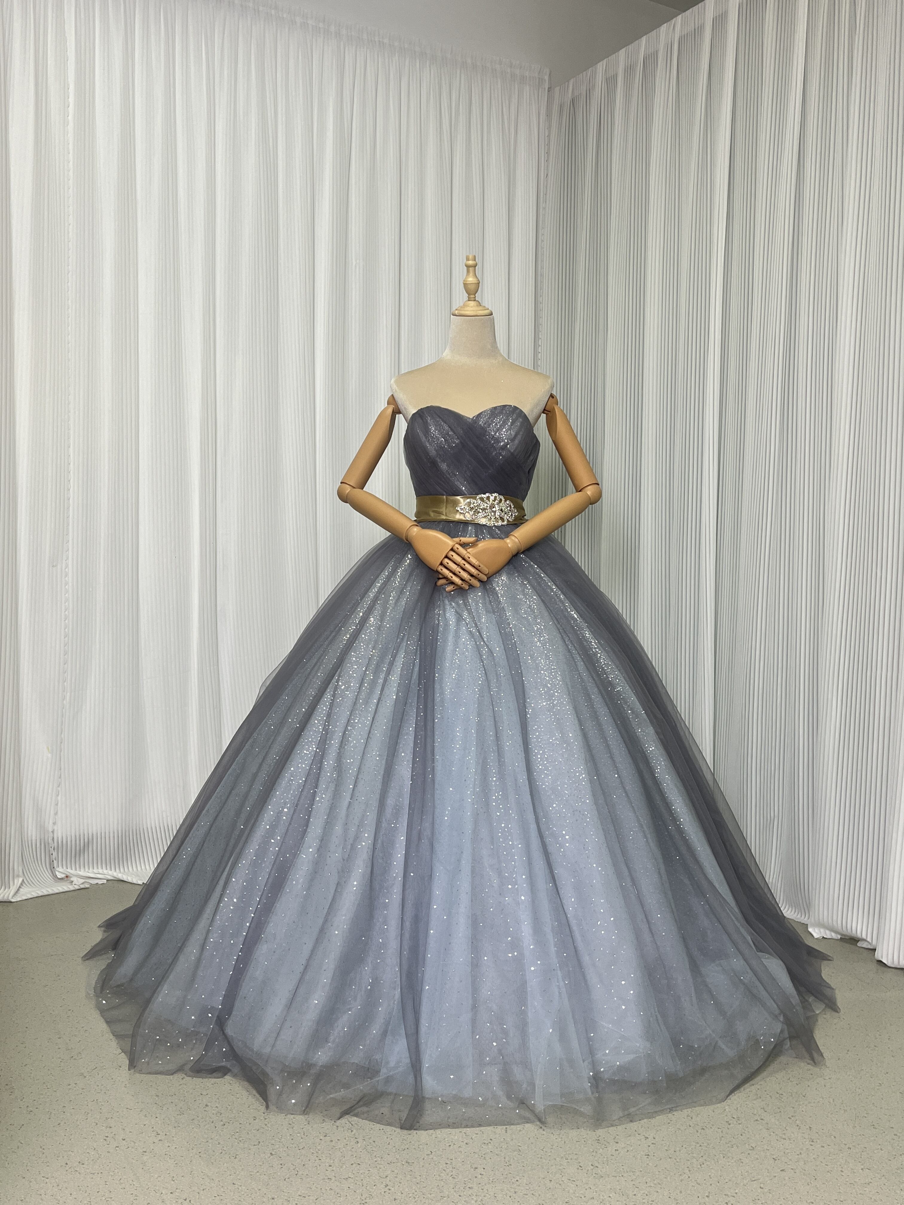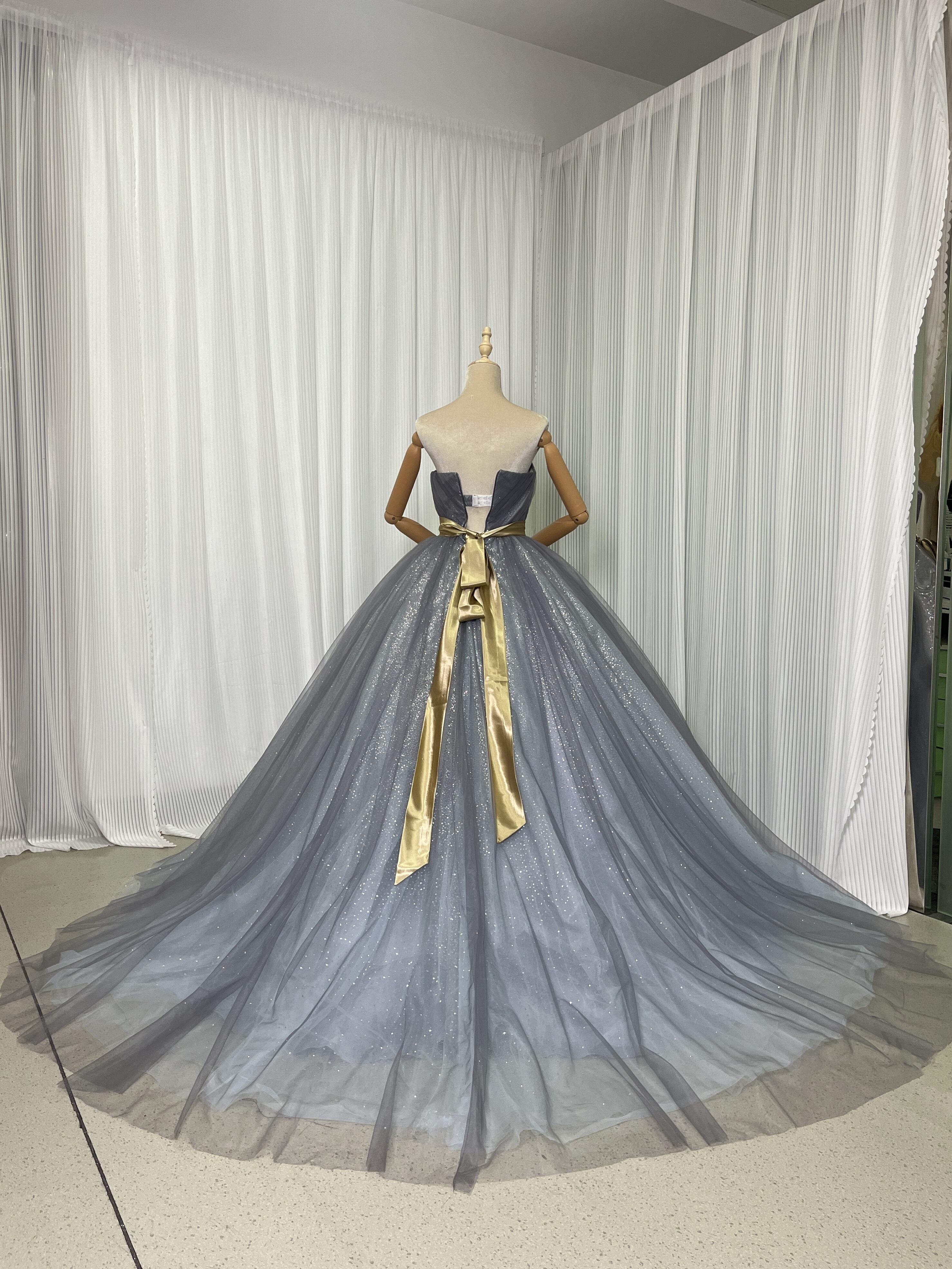 クラシカル ブルーグレー カラードレス ベアトップ キラキラチュール サッシュベルト ファスナー 披露宴