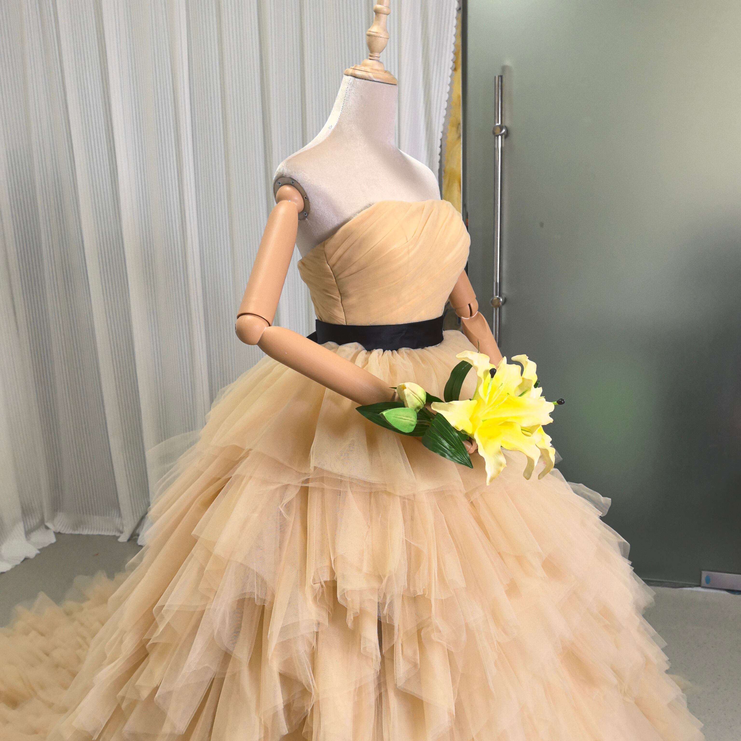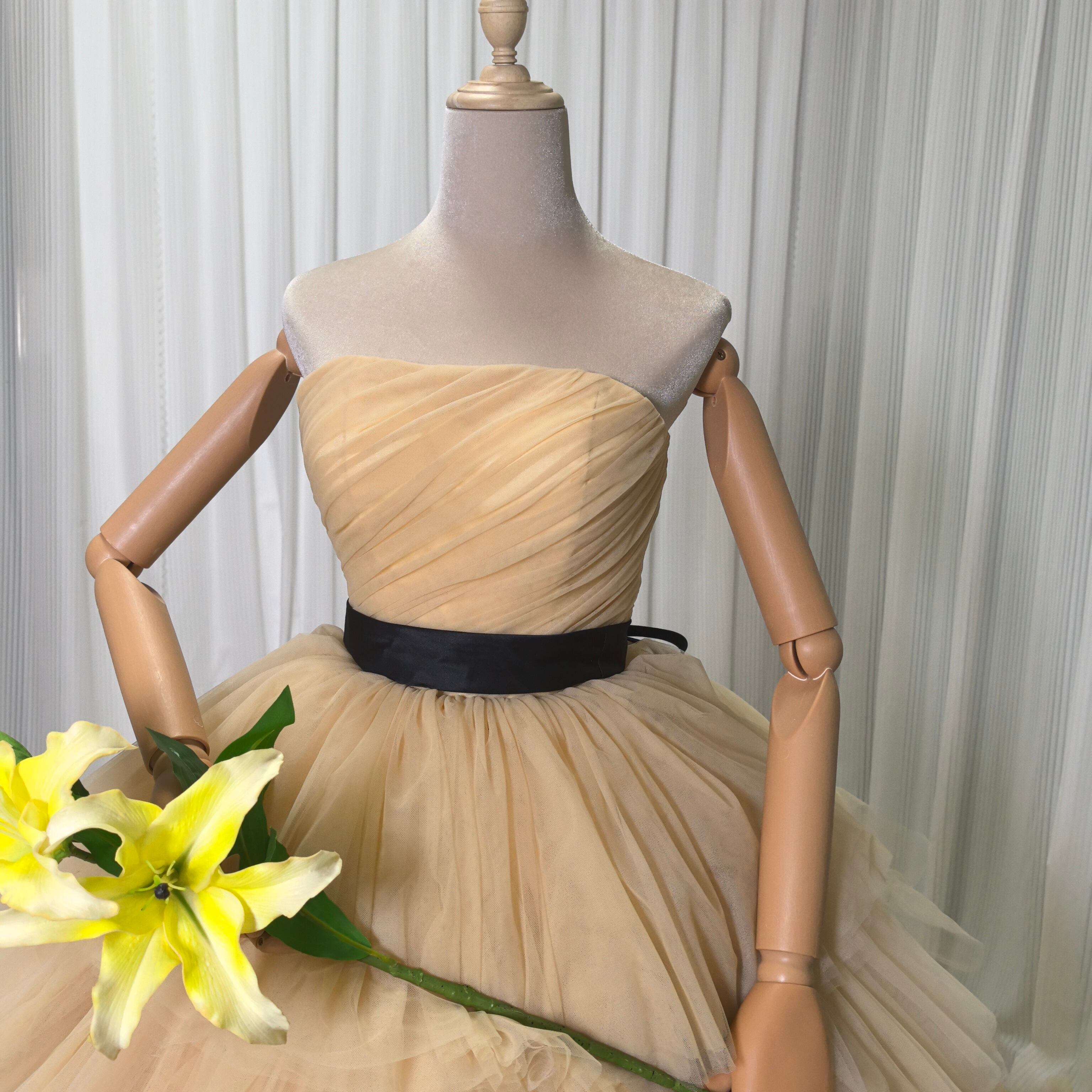 カラードレス ベージュ ベアトップ サッシュベルト 柔らかく重ねたチュールスカート 編み上げ 結婚式