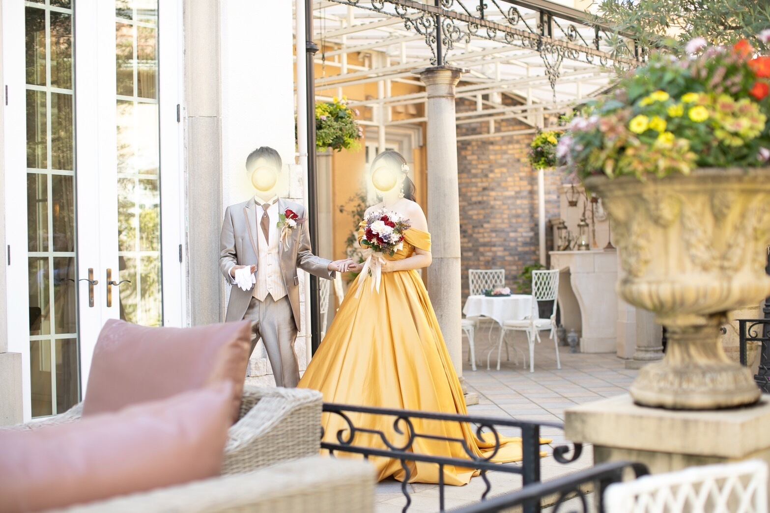 実例写真!イエロー カラードレス オフショルダー 光沢サテン 編み上げ Aライン 披露宴