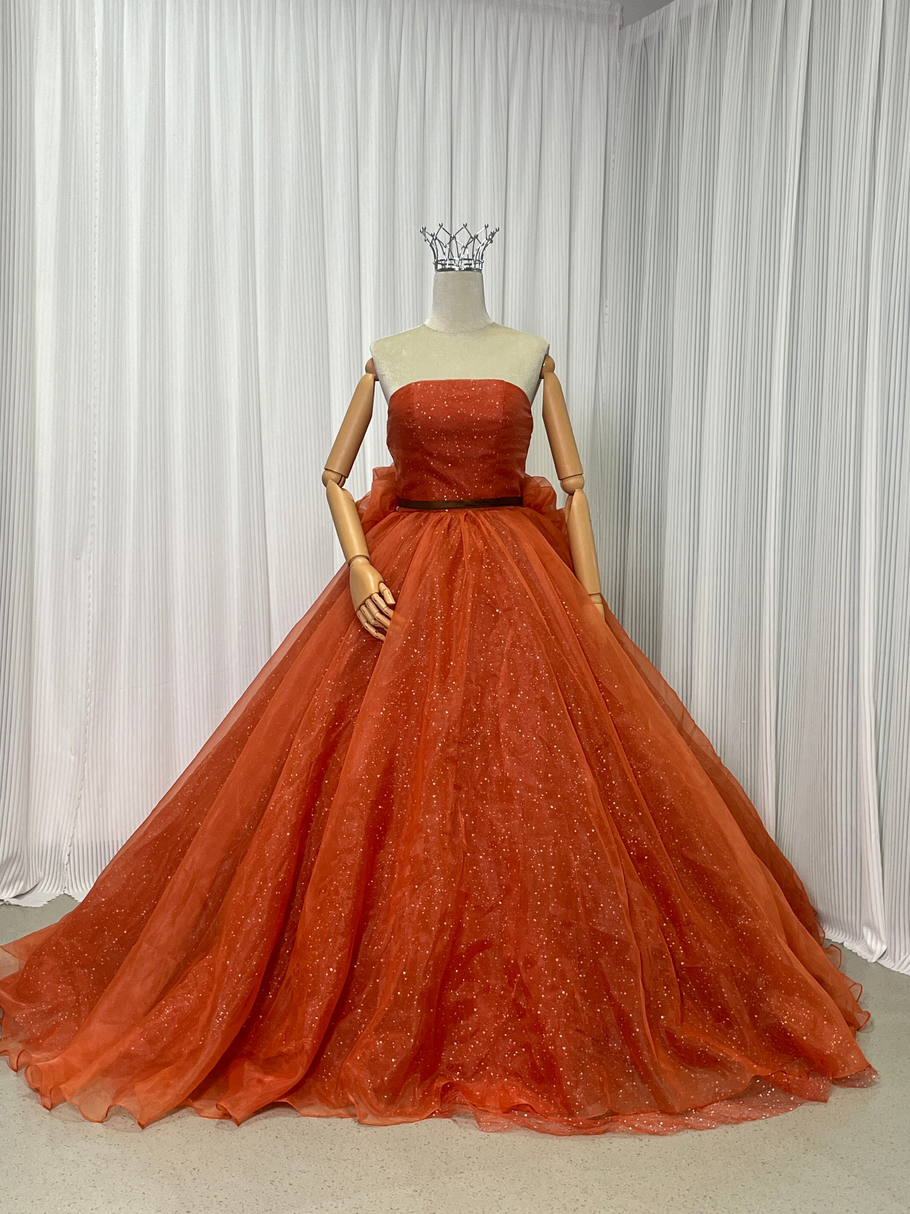 カラードレス オレンジ キラキラチュール ベアトップ ベルト 編み上げ 豪華なバックリボン 披露宴 演奏会