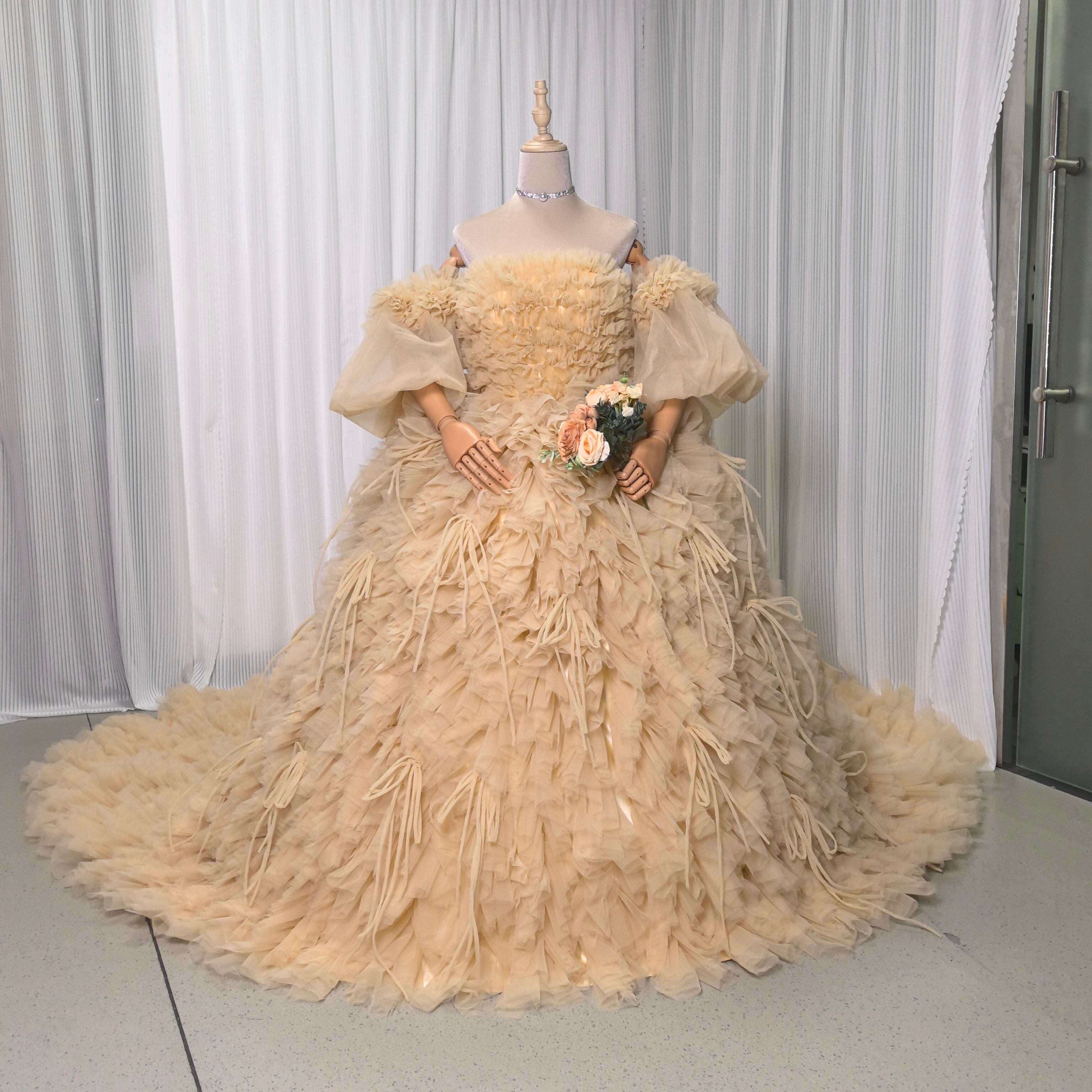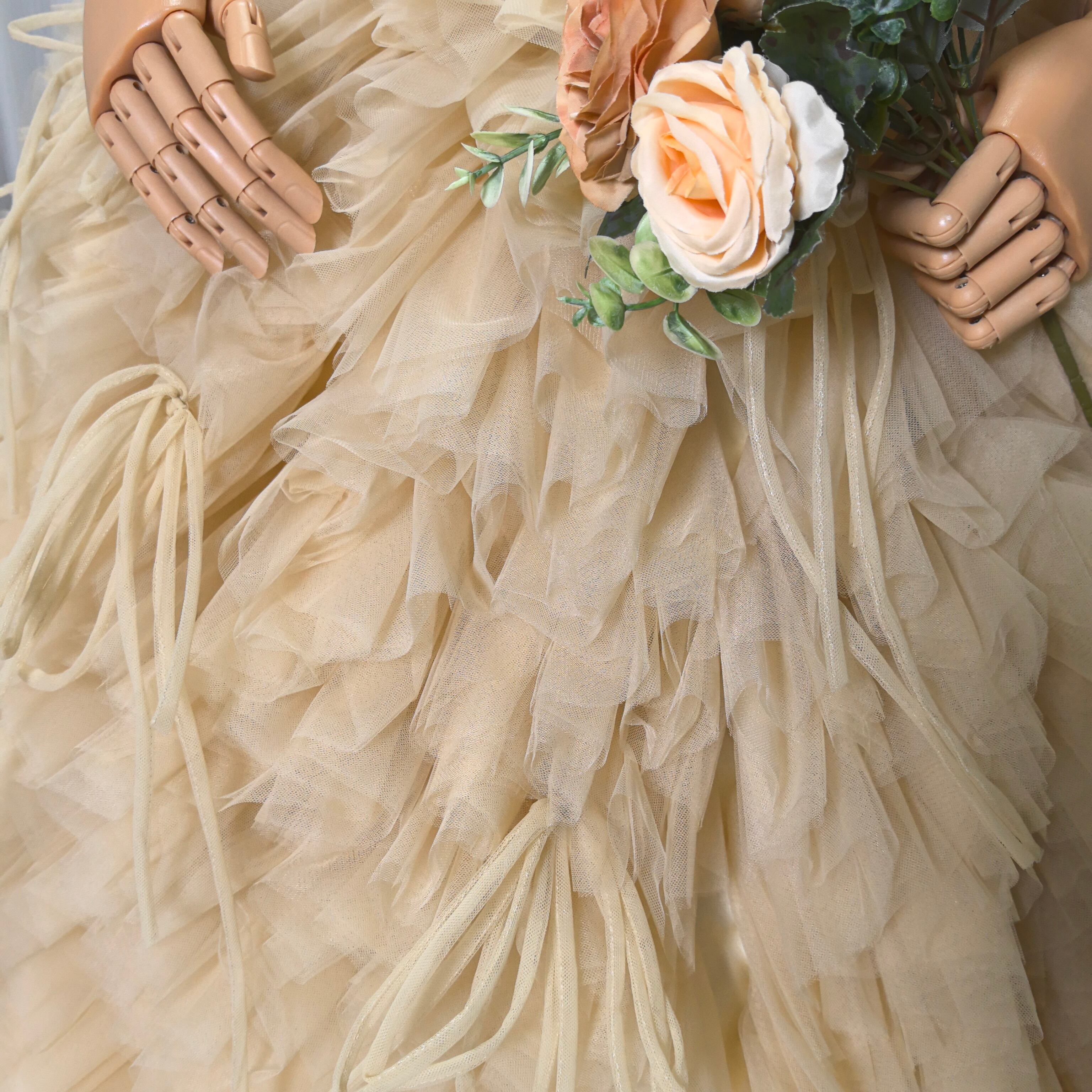 豪華!カラードレス イエロー ベアトップ 取り外し袖 リボン もこもこドレス 可愛い プリンセスライン 花嫁