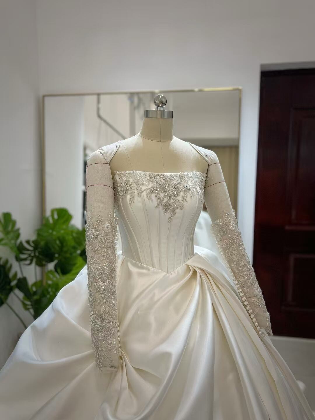 ウェディングドレス ベアトップ ラッフルフリル 取り外し袖 キラキラのハンドビーディング プリンセスライン