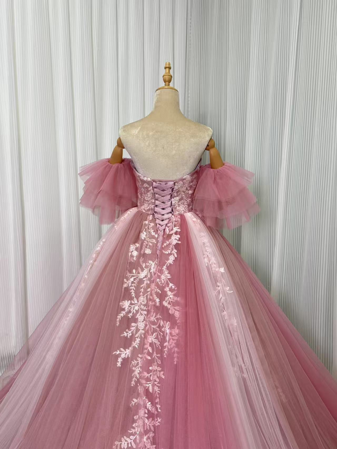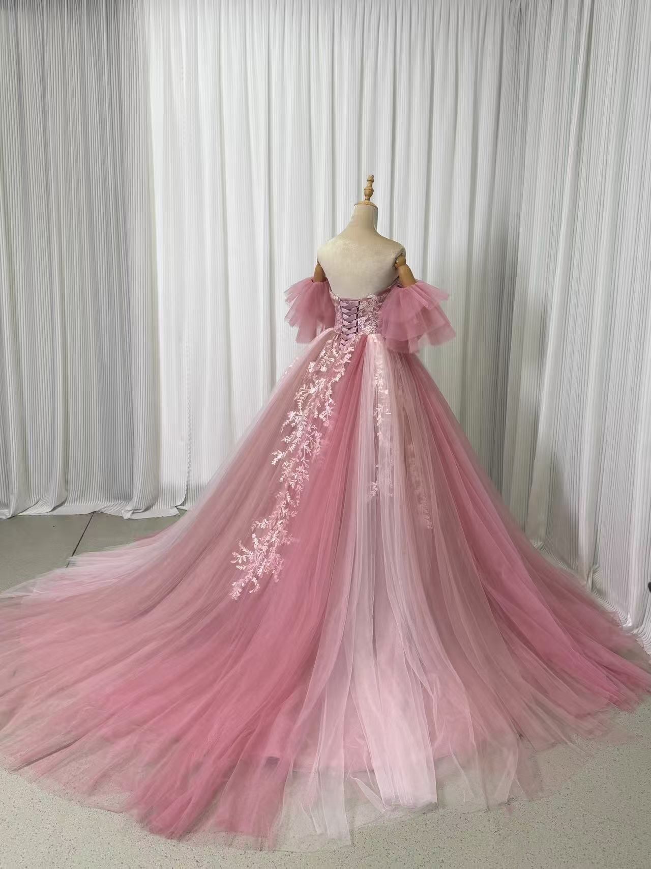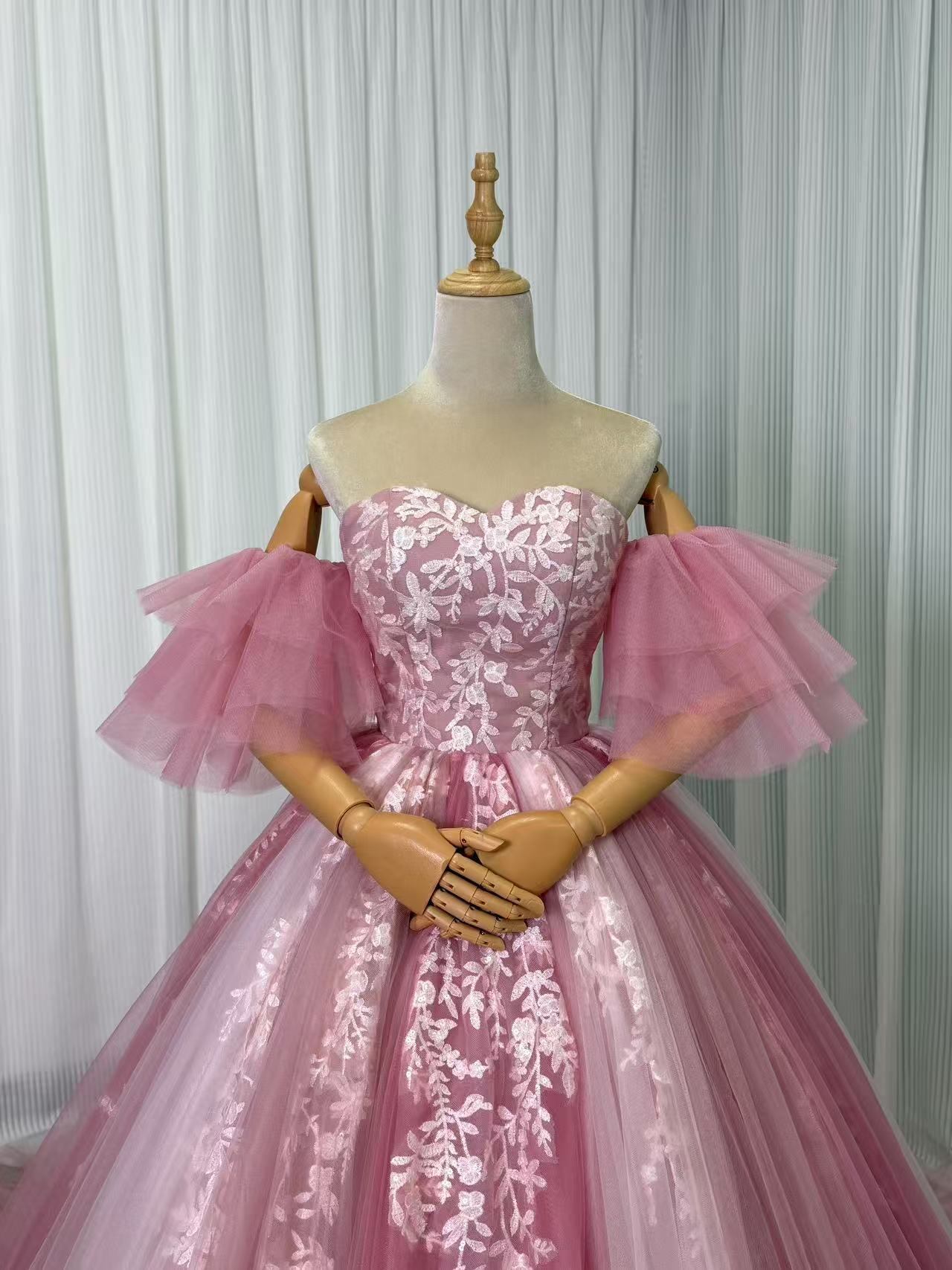 美品!カラードレス ピンク ベアトップ フリル袖 グラデーション 繊細レース 編み上げ 前撮り