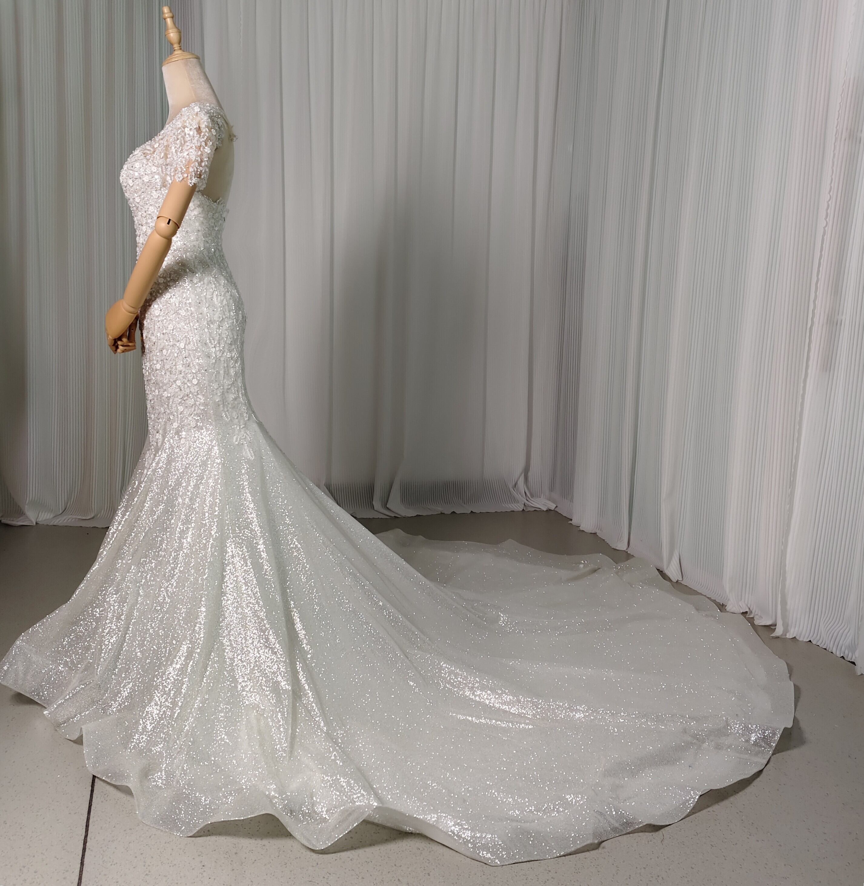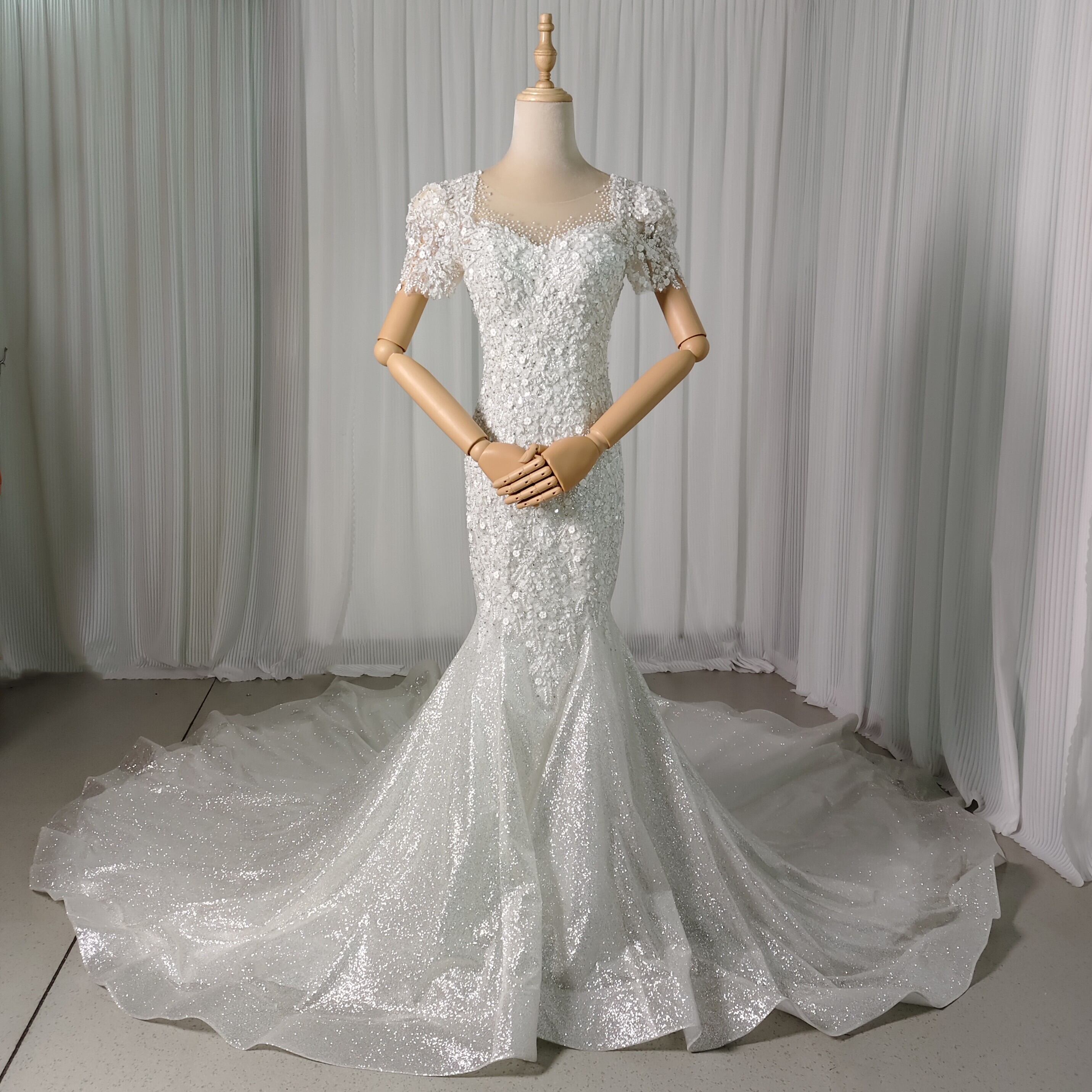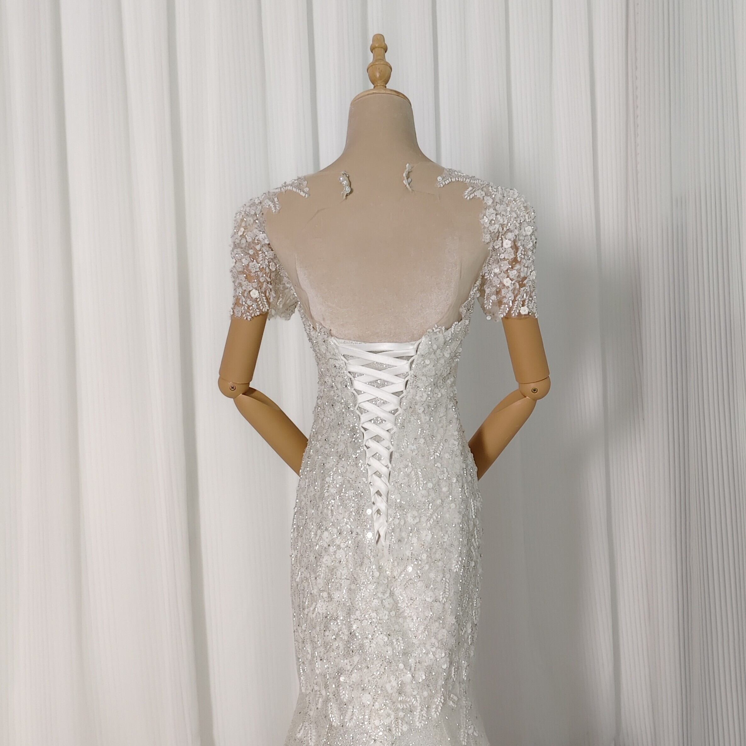豪華!ウェディングドレス ビジュー 短袖 編み上げ 韓国風ドレス マーメイド グリッタードレス 結婚式