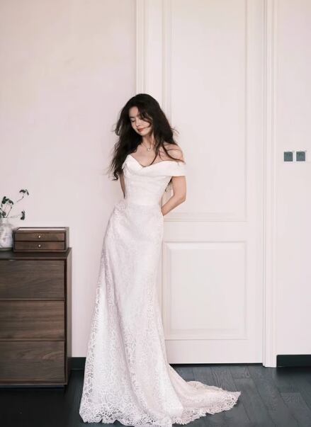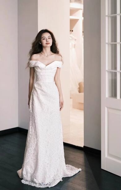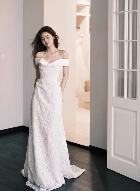 エレガント ウェディングドレス オフショルダー 大人っぽい スレンダーライン 2次会/合コン