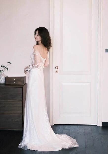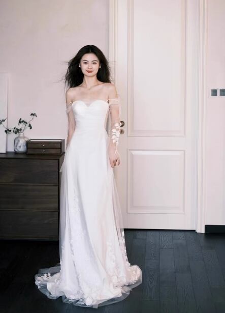 ウェディングドレス シースルー袖 ベアトップ 上品レース スレンダーライン 結婚式