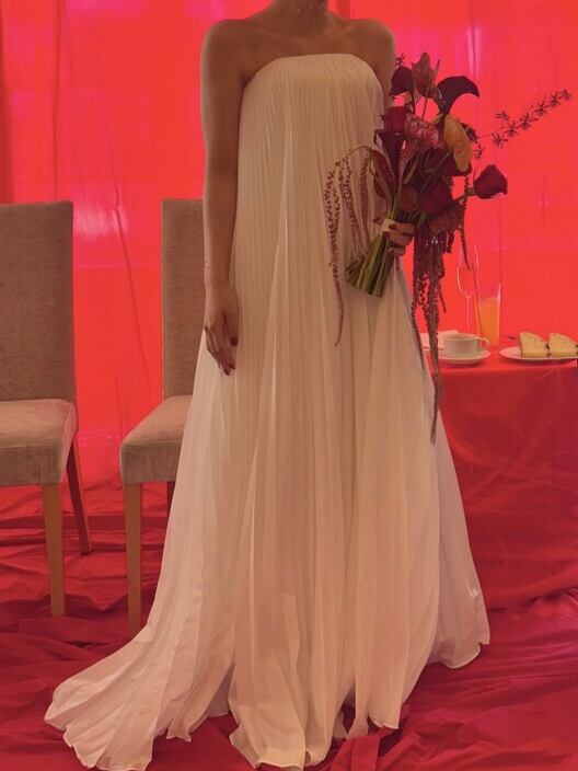 実例写真!パーティードレス オフホワイト ベアトップ ワンピース ふわふわ ファスナー 二次会