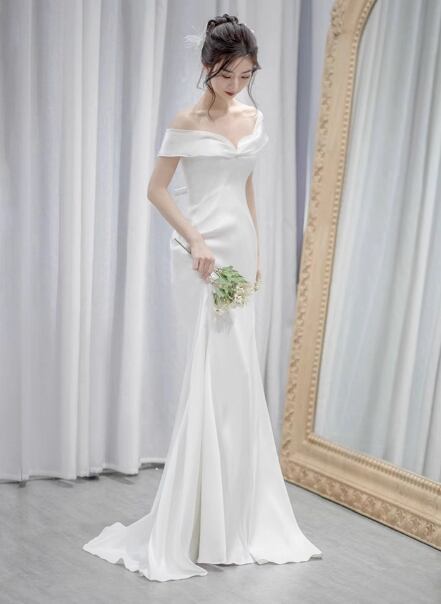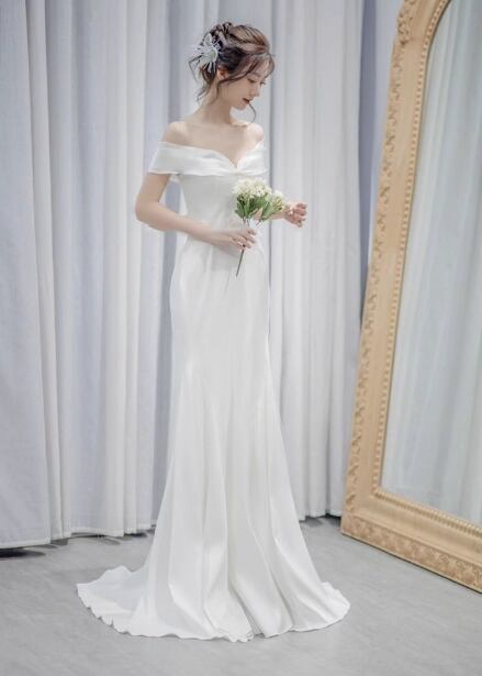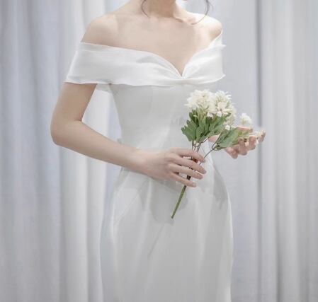 エレガント ウェディングドレス オフショルダー 細見えシルエット ミニトレーン 二次会