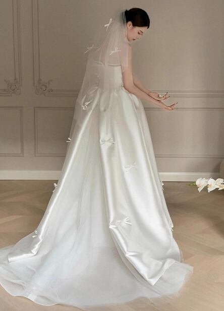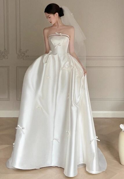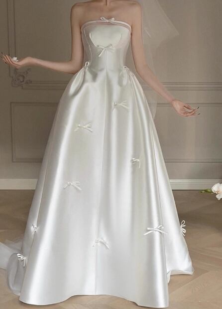 ウェディングドレス ベアトップ リボン 可愛い ロイヤルサテン 短トレーン 結婚式