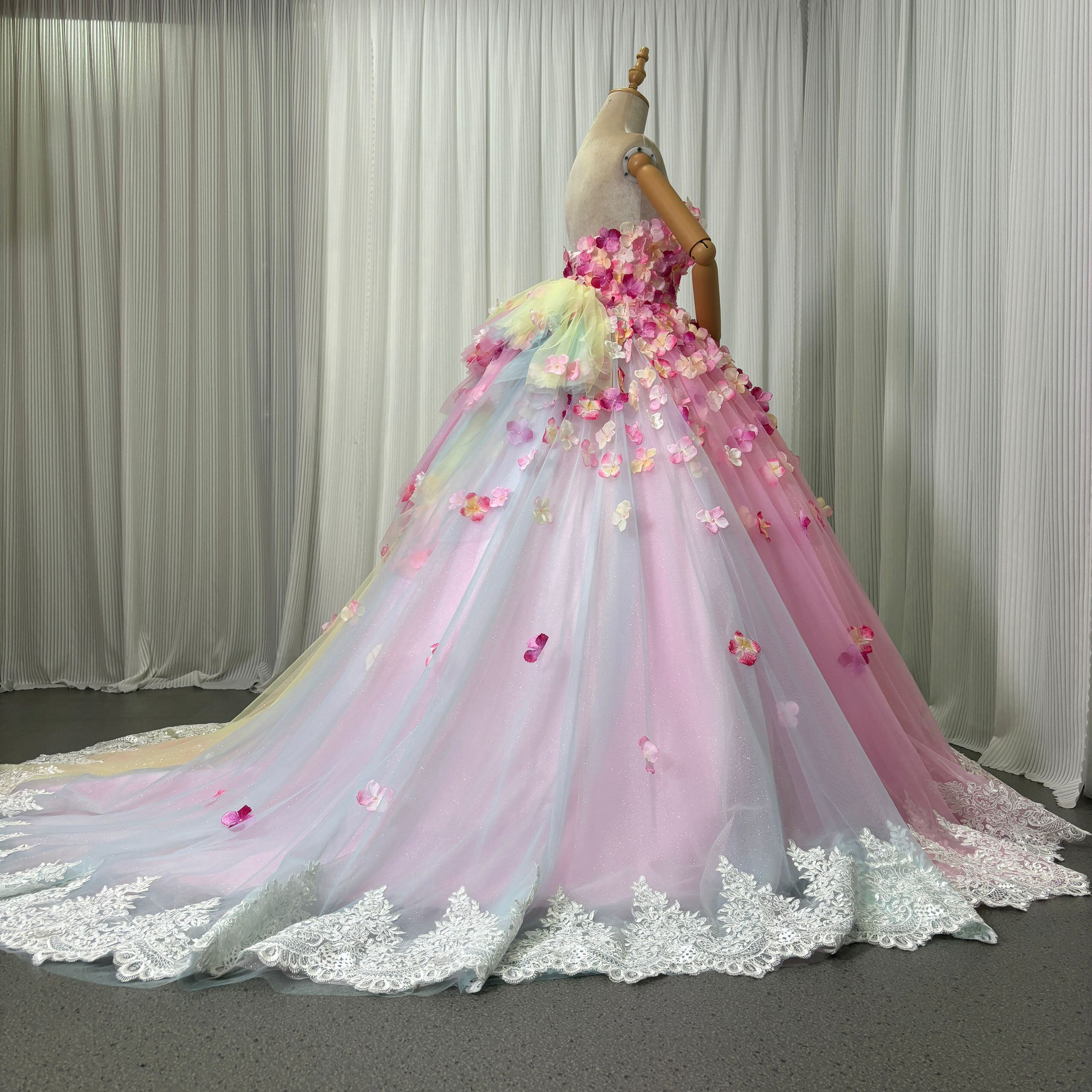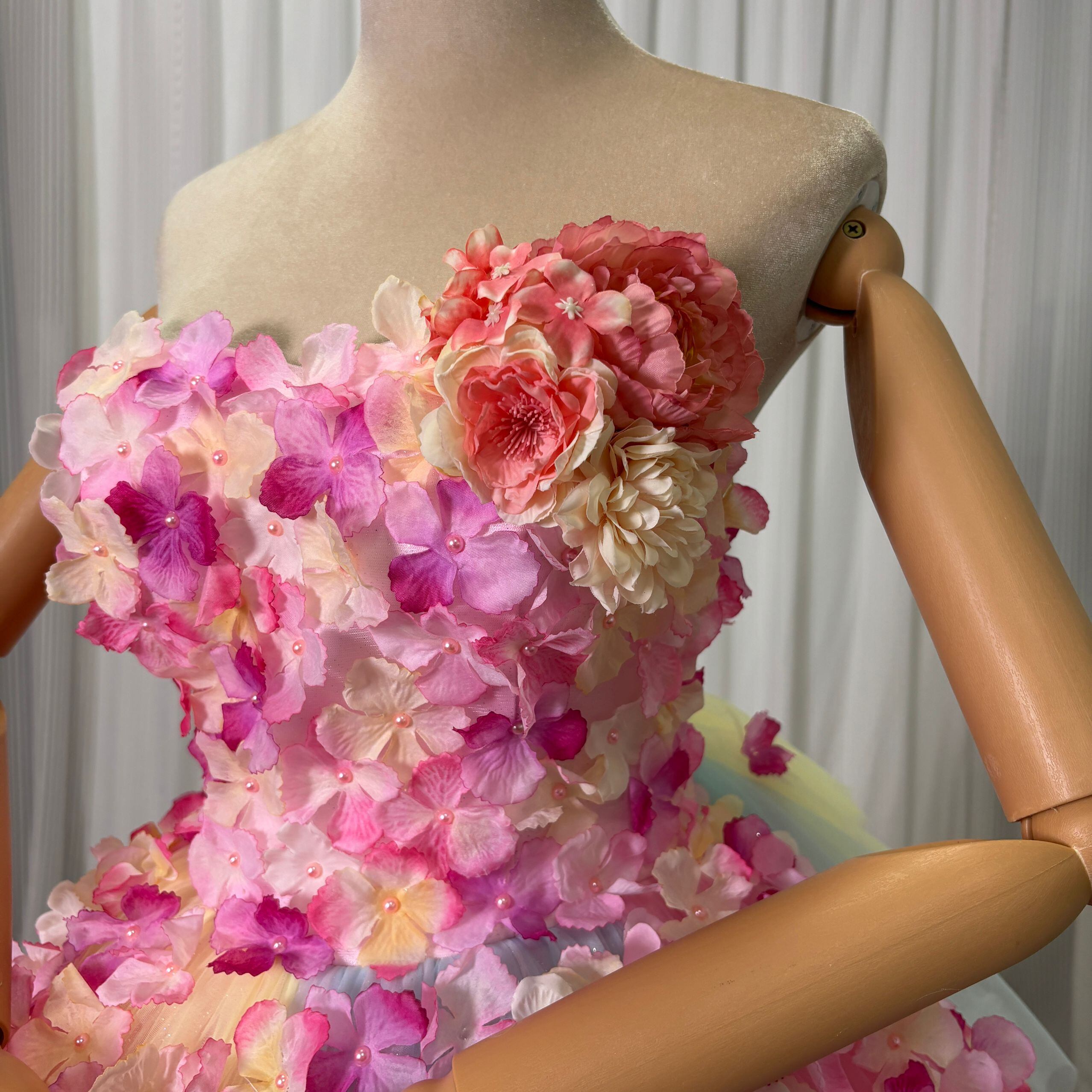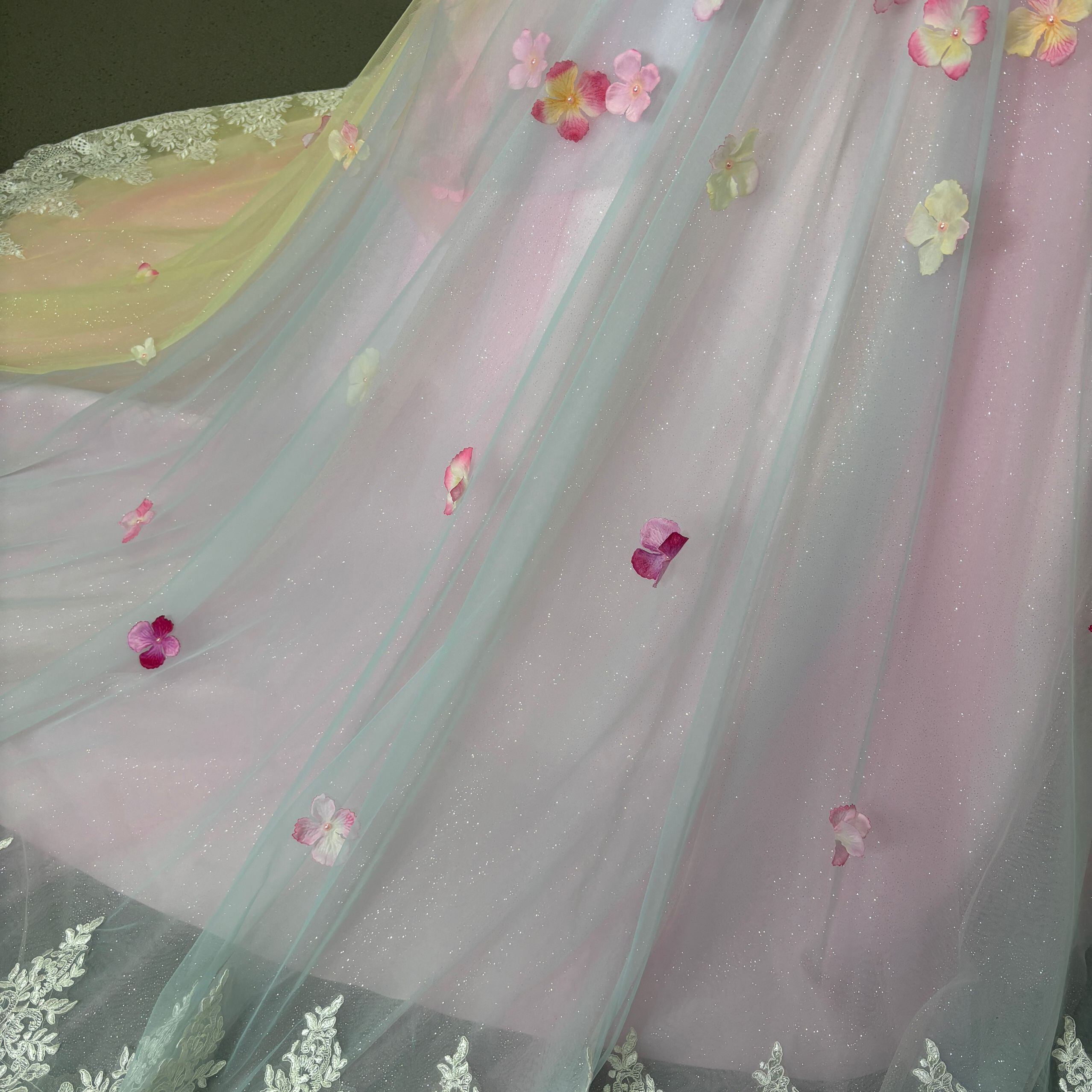 カラードレス レインボー 花モチーフ キラキラチュール 立体レース刺繍 裾に繊細レースをあしらった 結婚式
