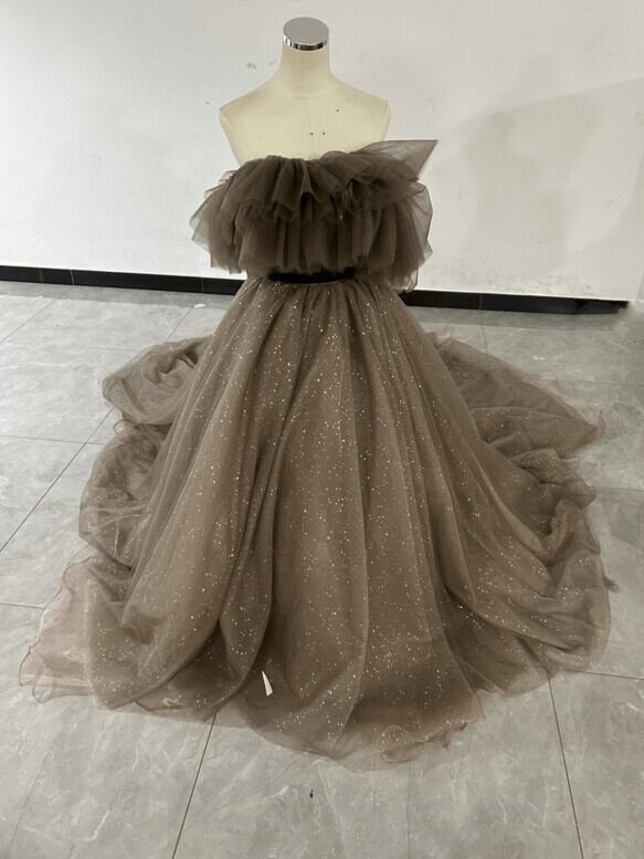 実例写真!カラードレス ブラウン オフショルダー キラキラグリッターチュール ベルト 編み上げ 披露宴