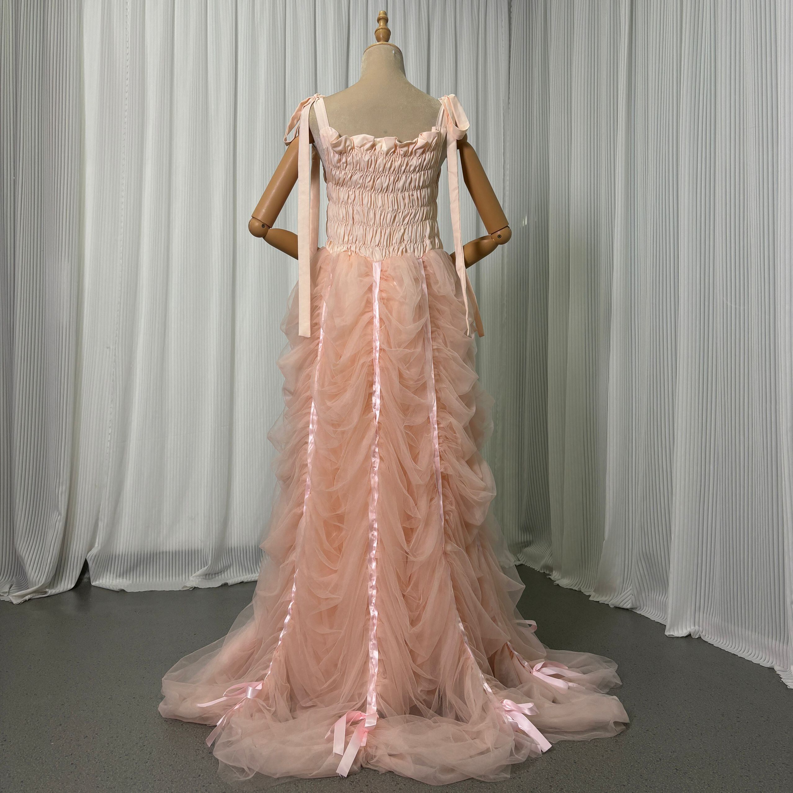 カラードレス 薄桃色 キャミソール 肩のリボン 細見えシルエット 可愛い 前撮り 二次会