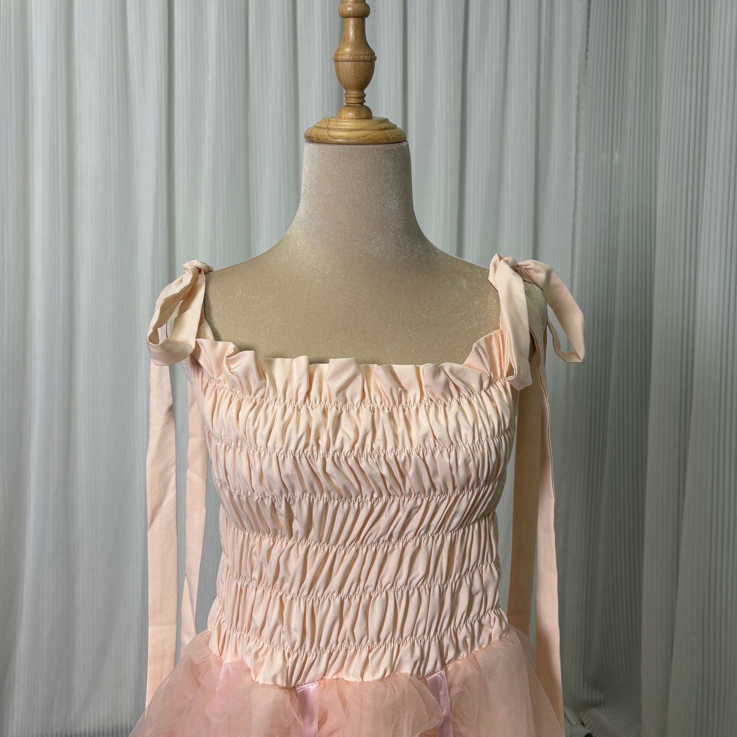 カラードレス 薄桃色 キャミソール 肩のリボン 取り外しオフショルダー 細見えシルエット 可愛い 前撮り 二次会