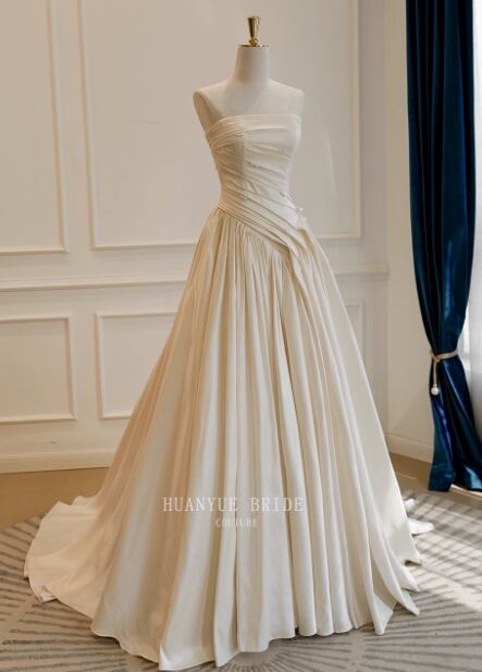 ウェディングドレス ベアトップ ハンドドレープ 大人っぽい Aライン シルクタフタ 結婚式