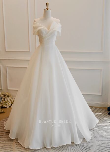 ウェディングドレス オフショルダー Aライン 上質オーガンジー ロング スレンダーライン 二次会