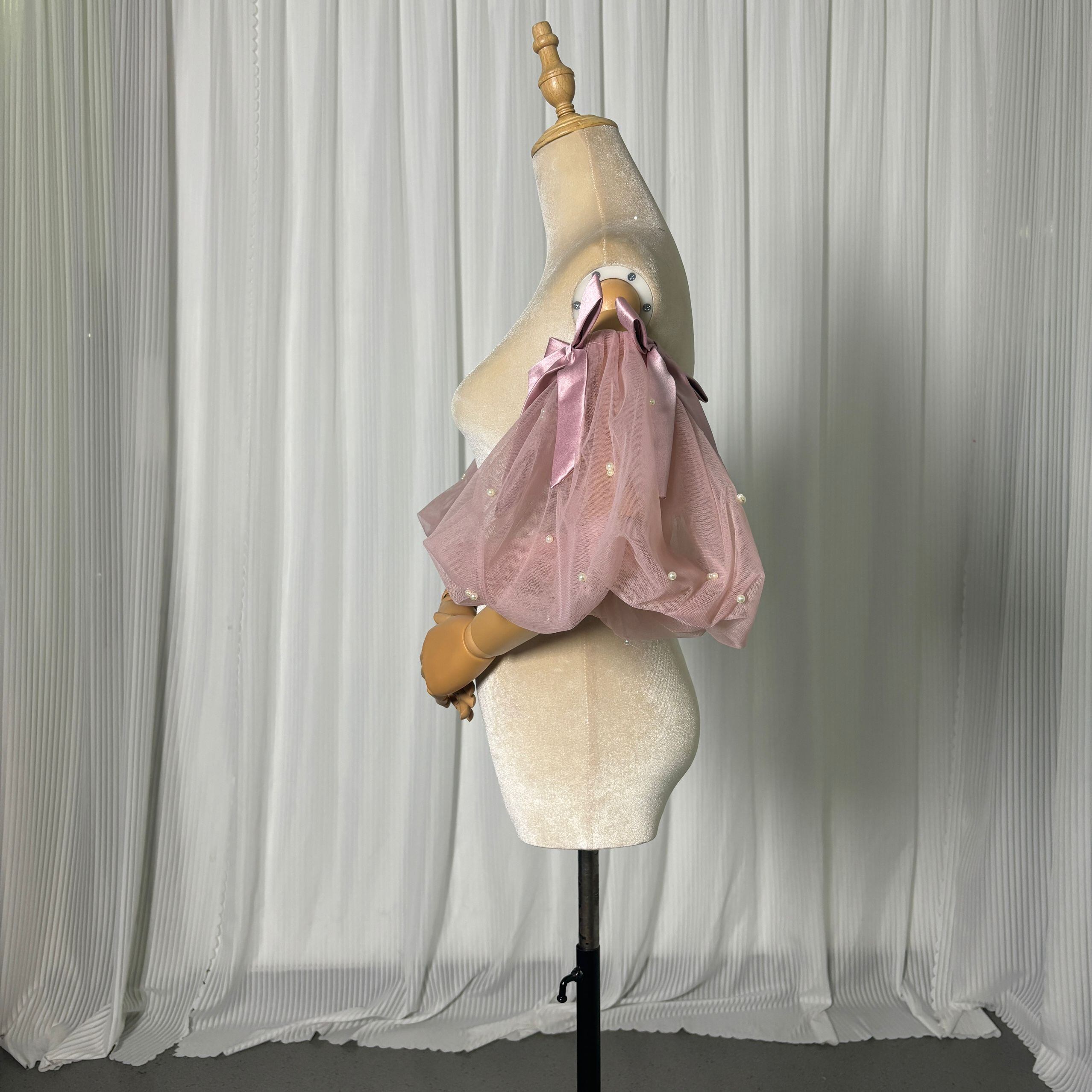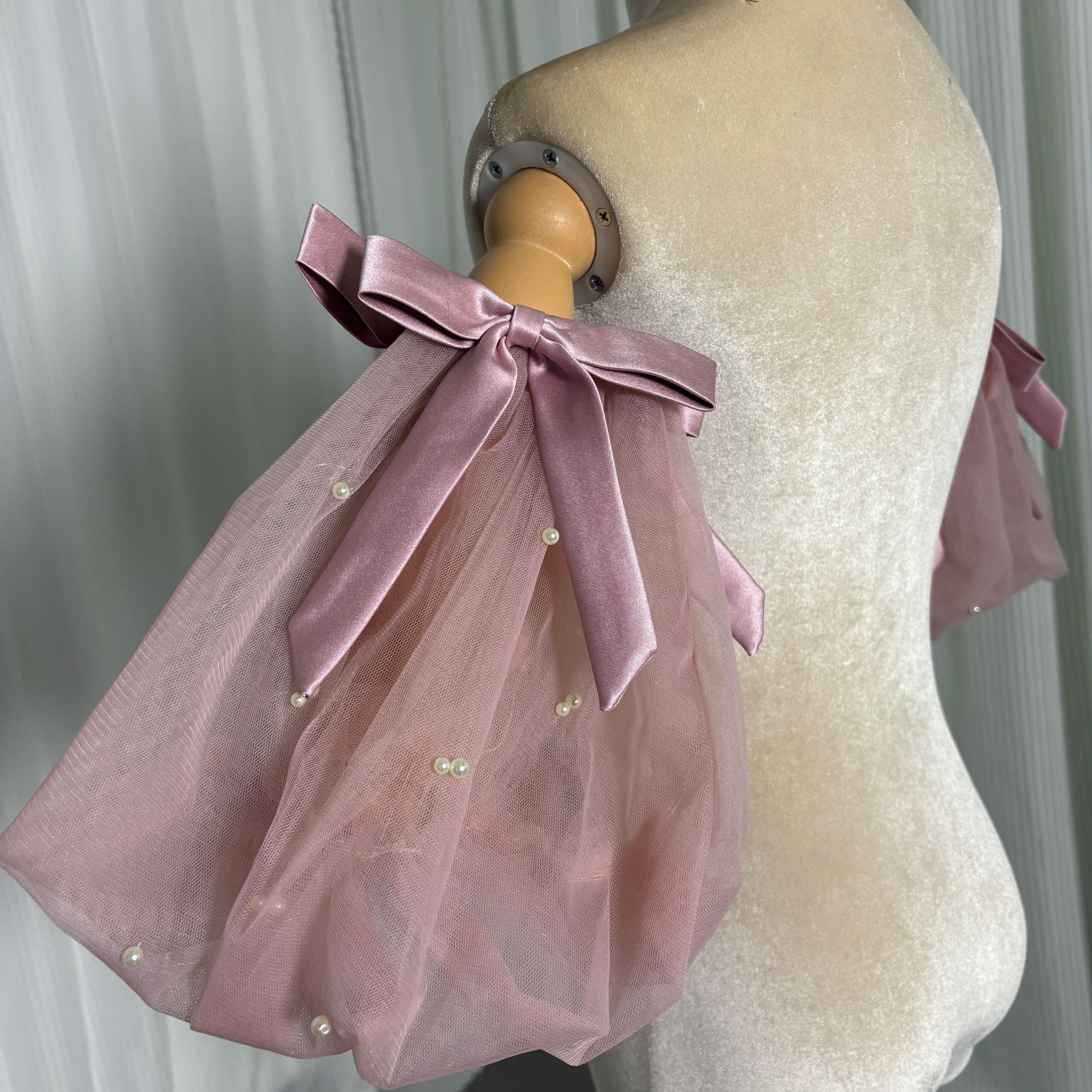 パフスリーブ ピンク 姫袖 パール リボン 可愛い ストレッチ ソフトチュール 花嫁/結婚式