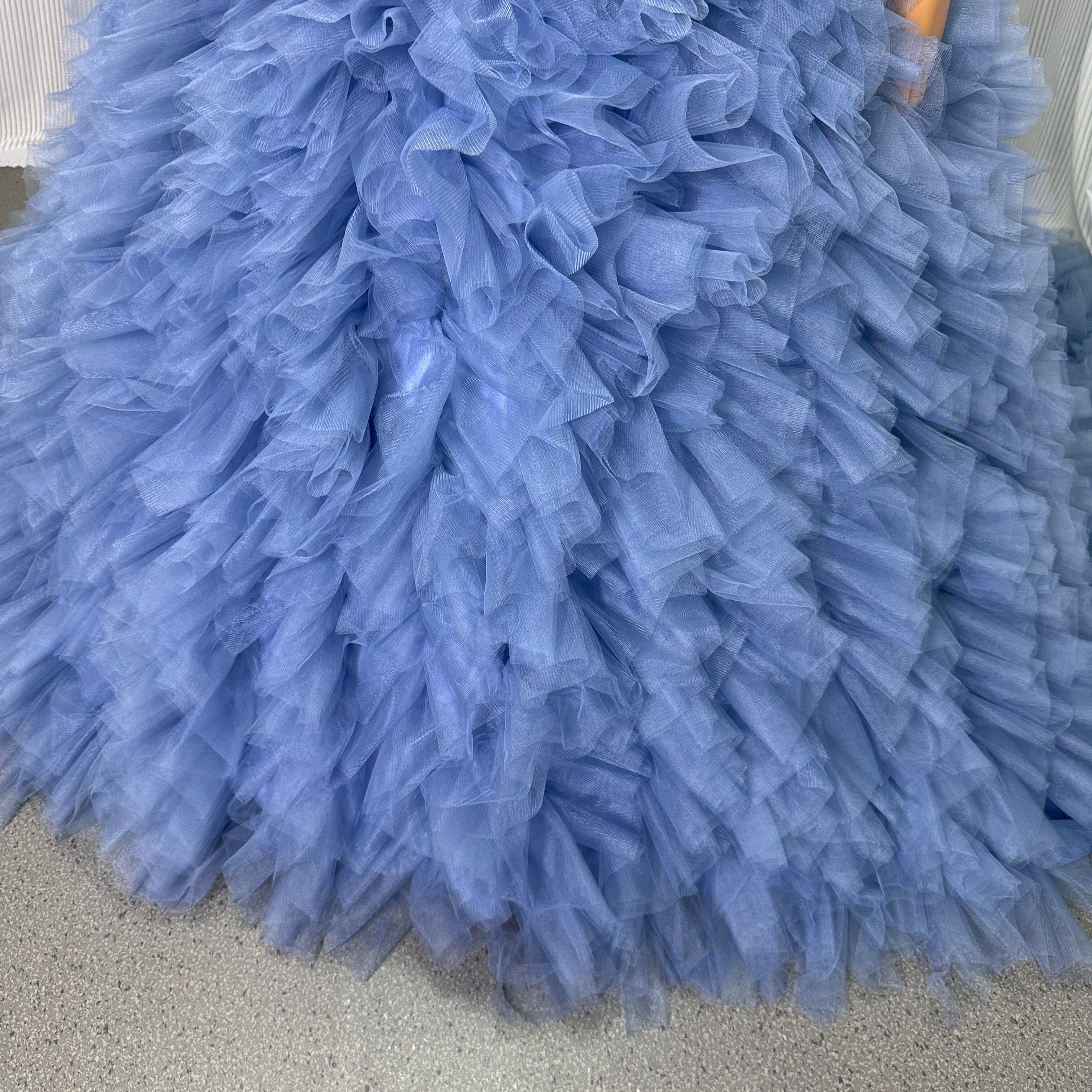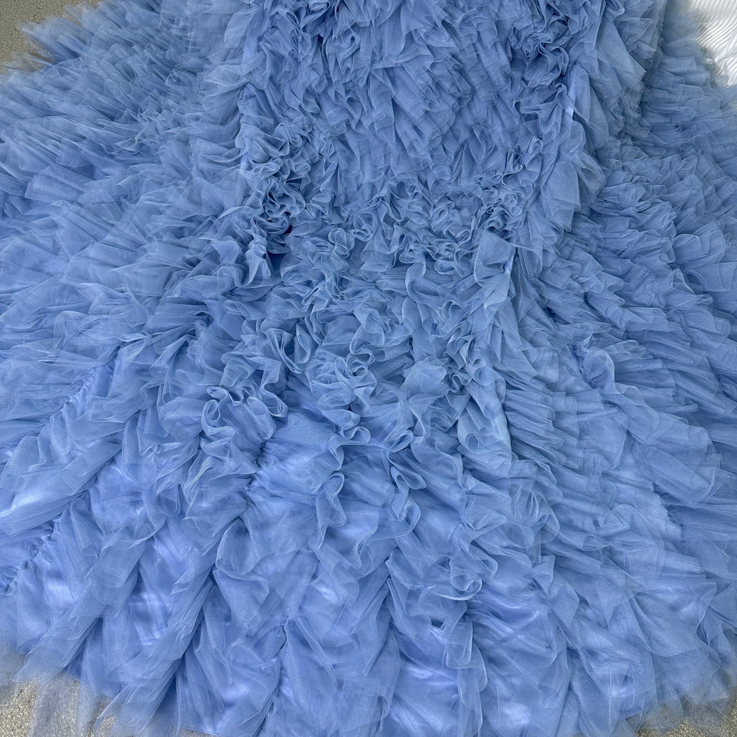 豪華!カラードレス ブルー ベアトップ フリル袖 もこもこドレス ロングトレーン 編み上げ 抜群のおしゃれ見え