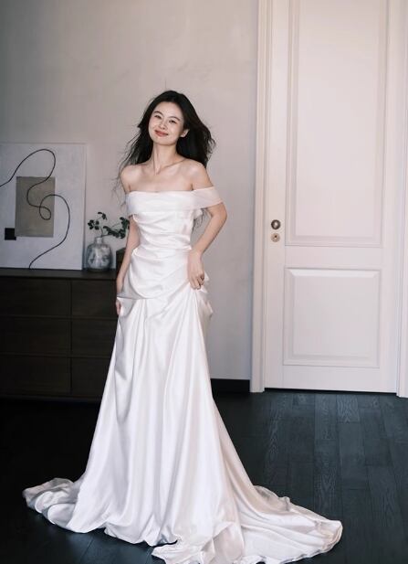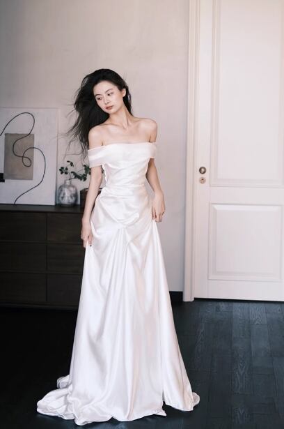 フランス風 ウエディングドレス オフショルダー 光沢サテン 優雅なシルエット 結婚式/披露宴