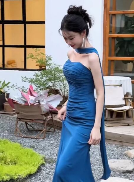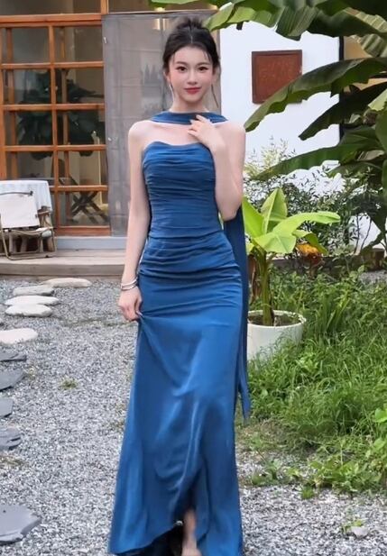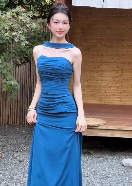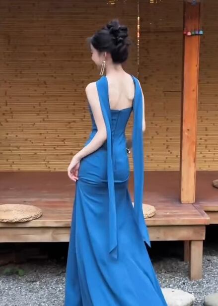 高品質!カラードレス ジュエルブルー ベアトップ マーメイドライン ファスナー ピアノ演奏会/音楽会