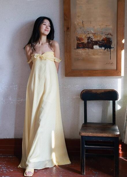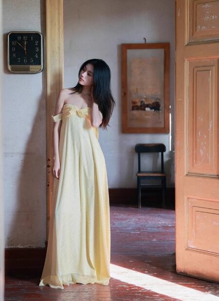 カラードレス イエロー オフショルダー 可愛い デザイン感 揺らめく裾 謝恩会