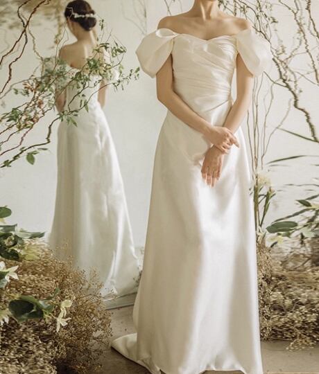 ウエディングドレス オフショルダー ロイヤルサテン ハンドドレープ 細見えシルエット 結婚式