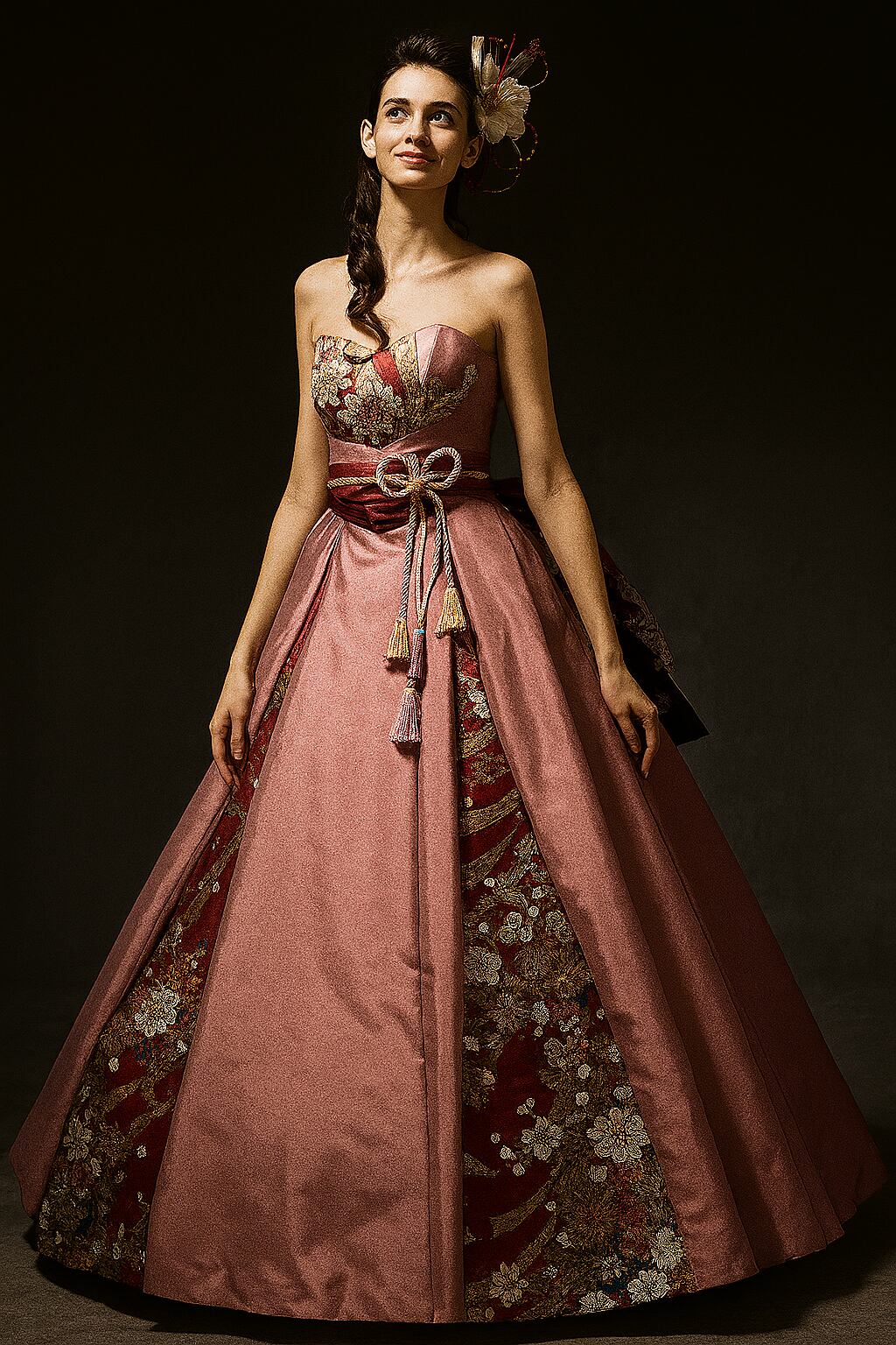 美品!着物ドレス、和ドレス ピンク ベアトップ 花柄モチーフで刺繍が美しい 花嫁