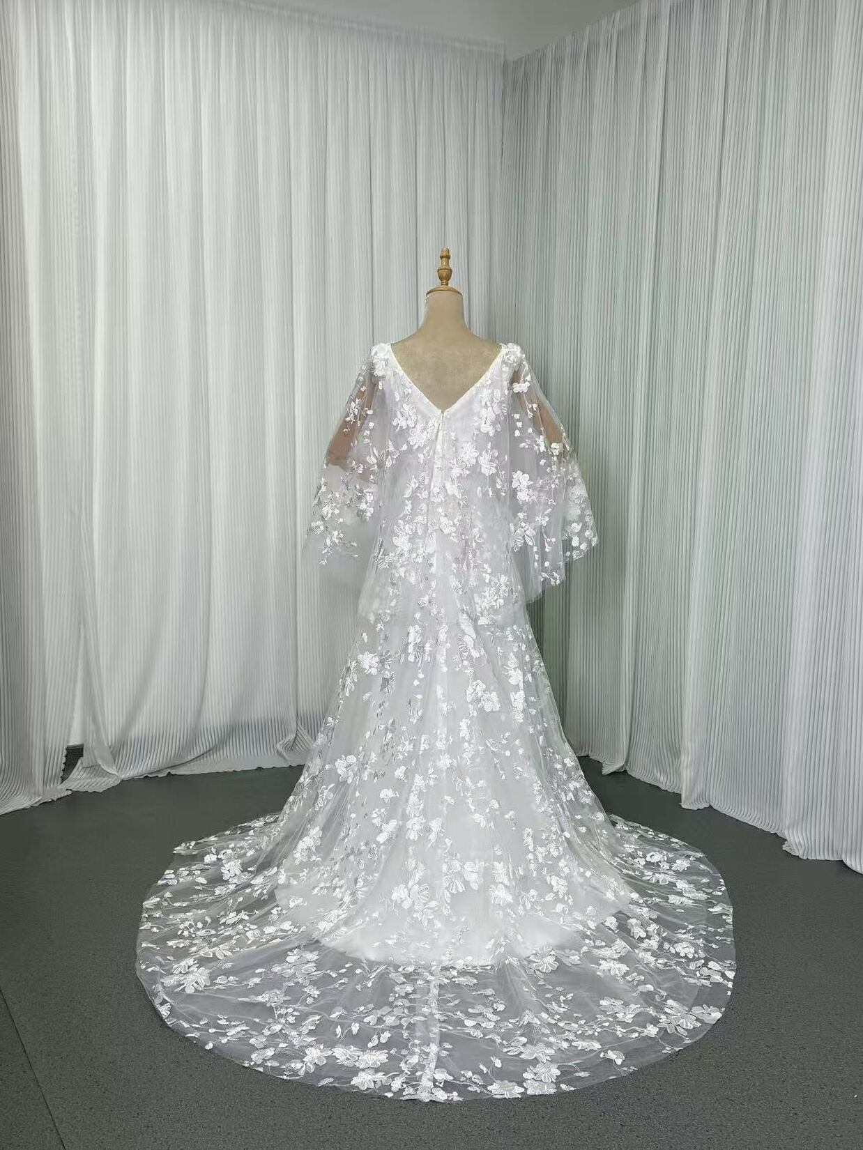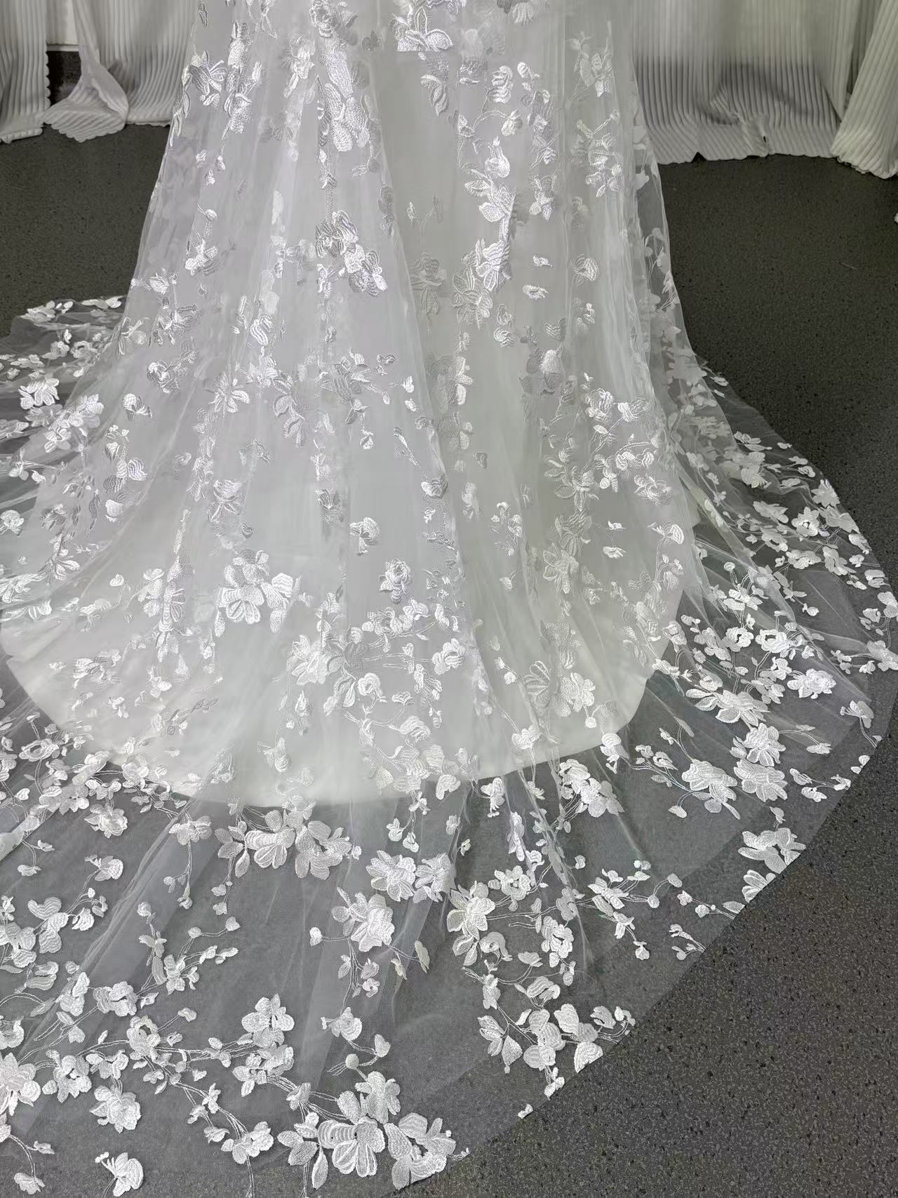 ウェディングドレス Vネック 背中見せ 贅沢な小花総レース 華やかなトレーン ふわふわ袖 結婚式/披露宴