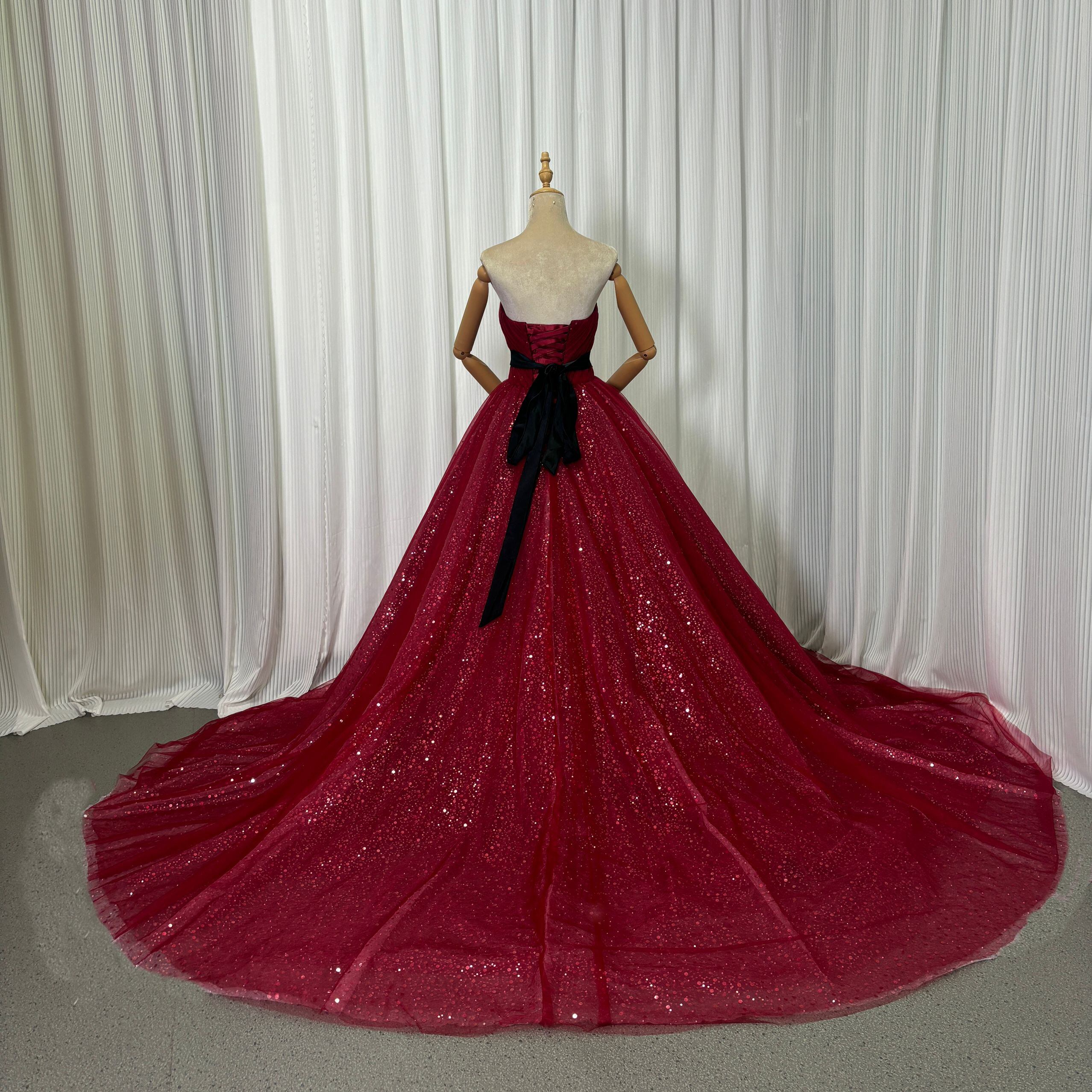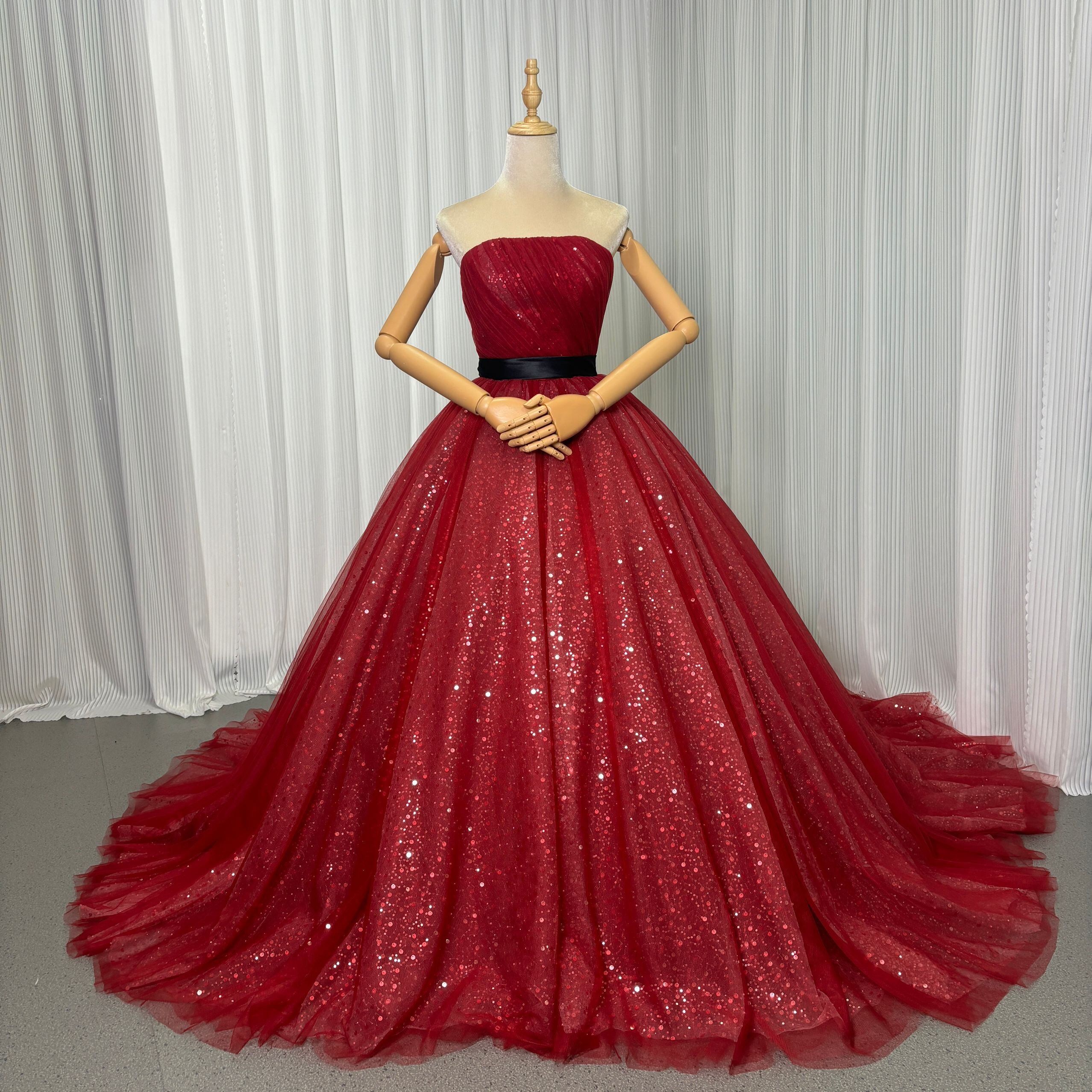 カラードレス ボルドー色 ベアトップ キラキラスパンコール ロングトレーン 花嫁