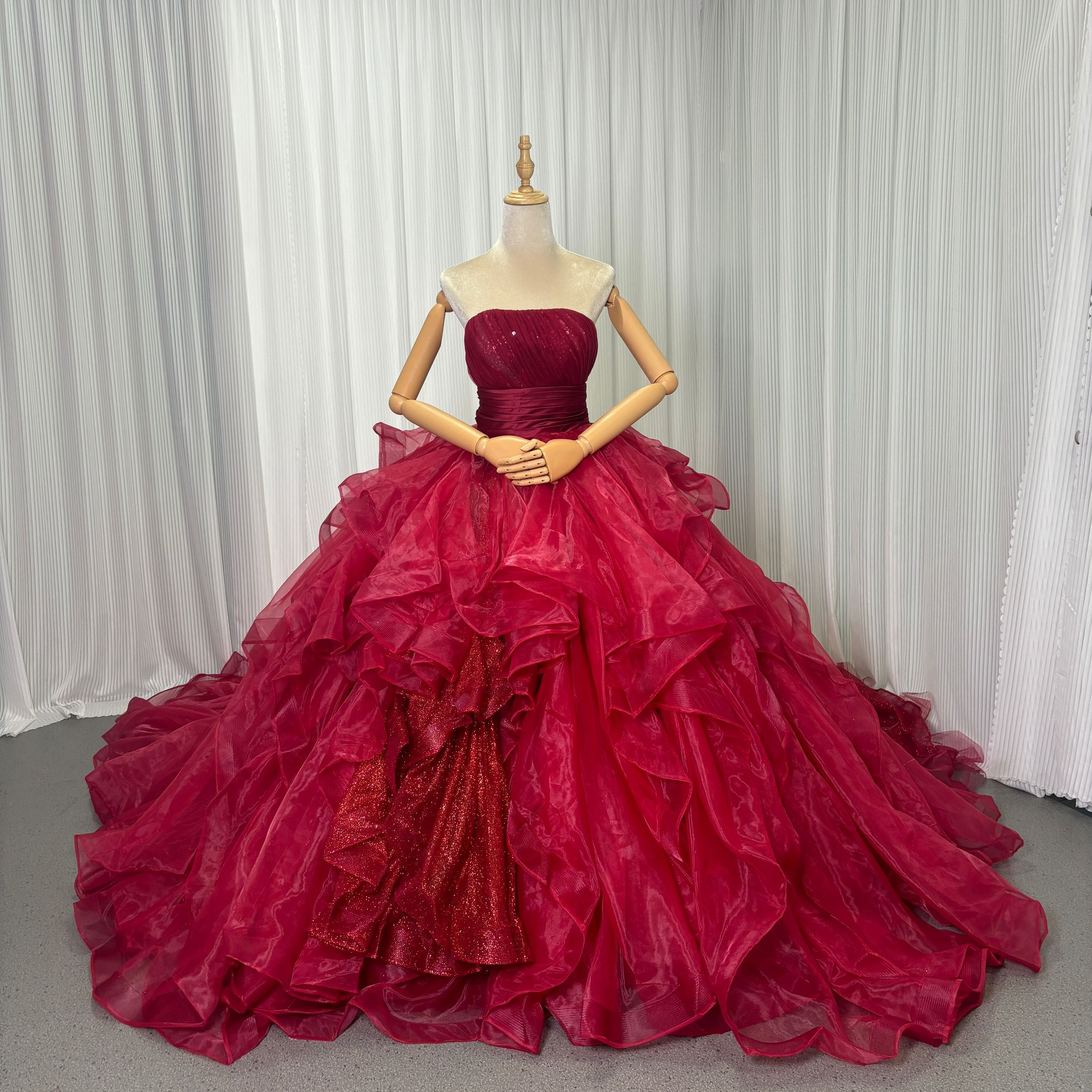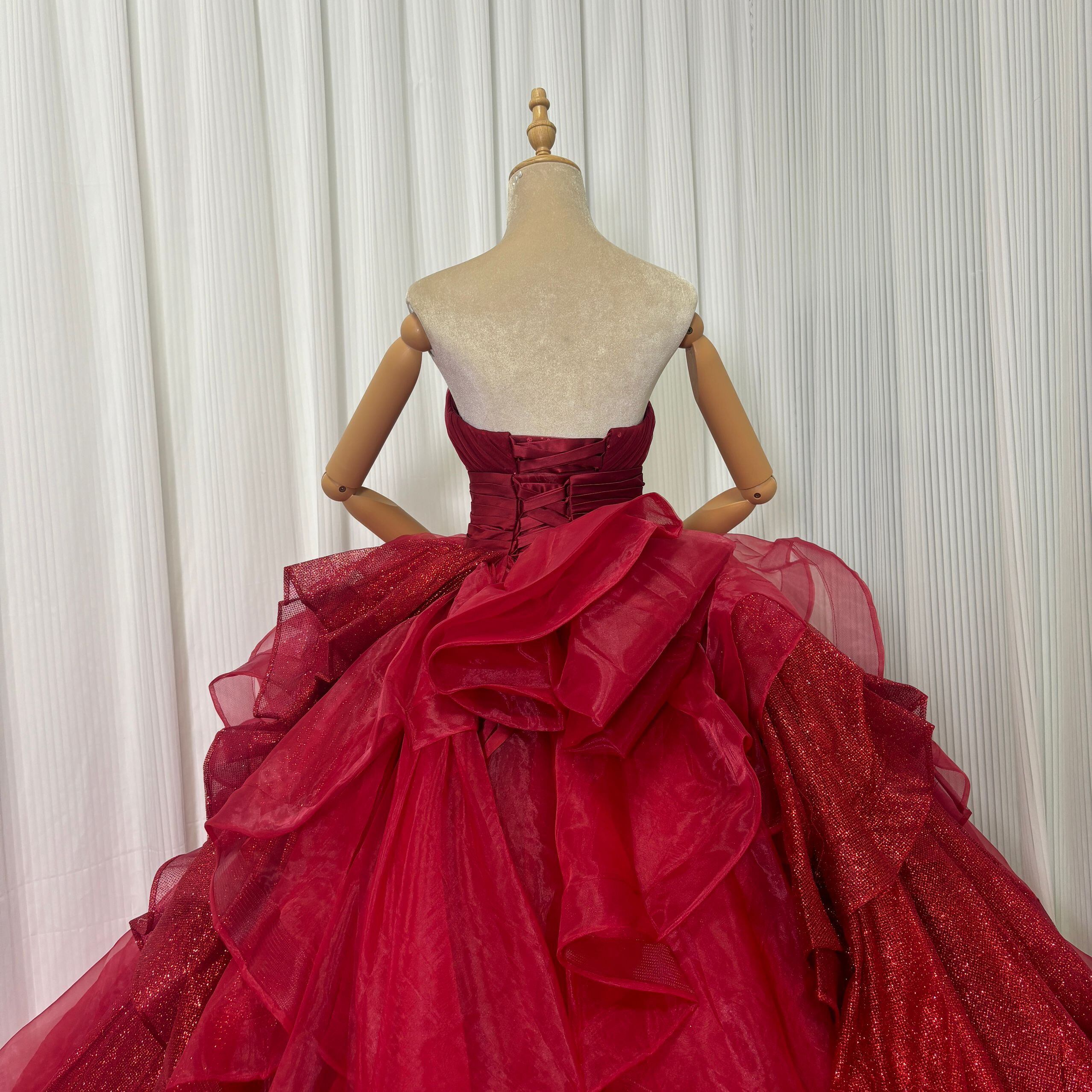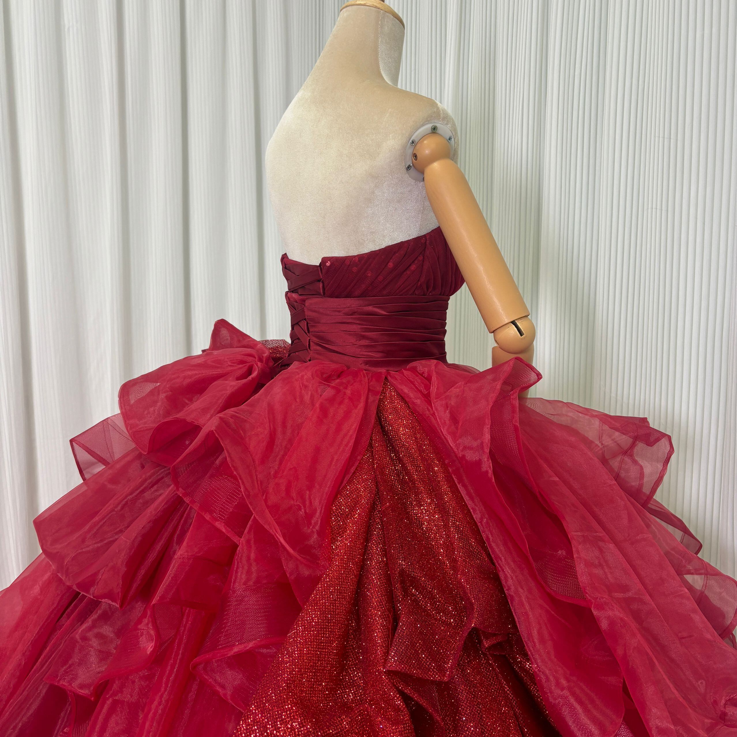 豪華!カラードレス ボルドー色 ベアトップ キラキラスパンコール ラッフルフリル ボリュームドレス 花嫁