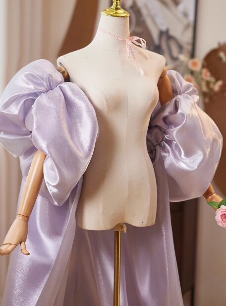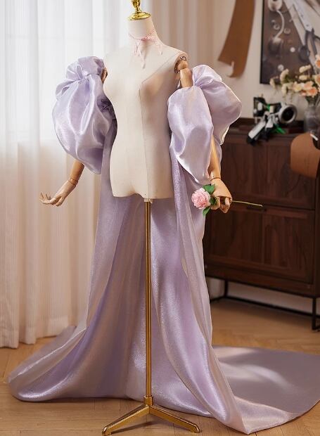 パープル ケープ風ドレス フレア袖 光沢感 背中見せ 優雅なシルエット 音楽会