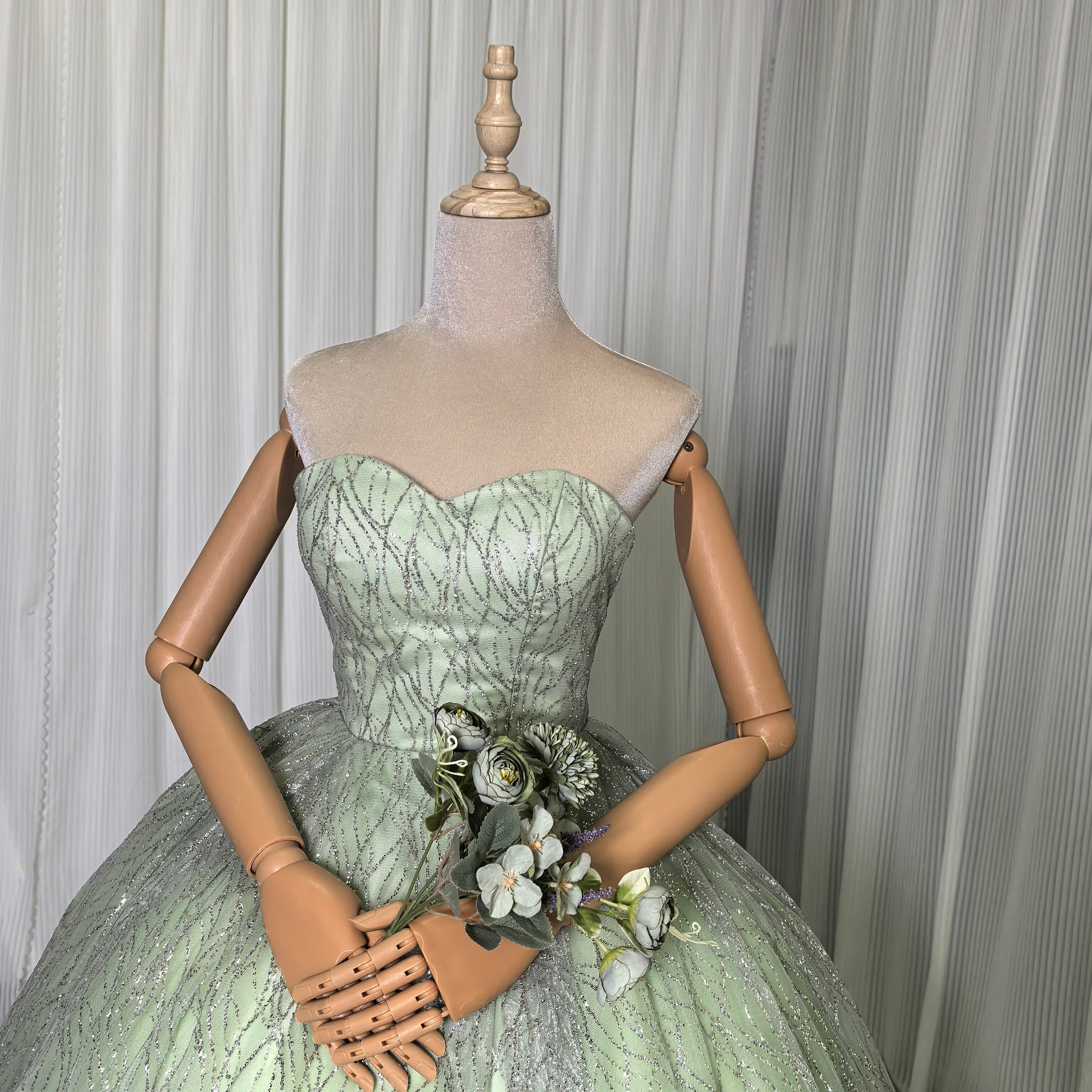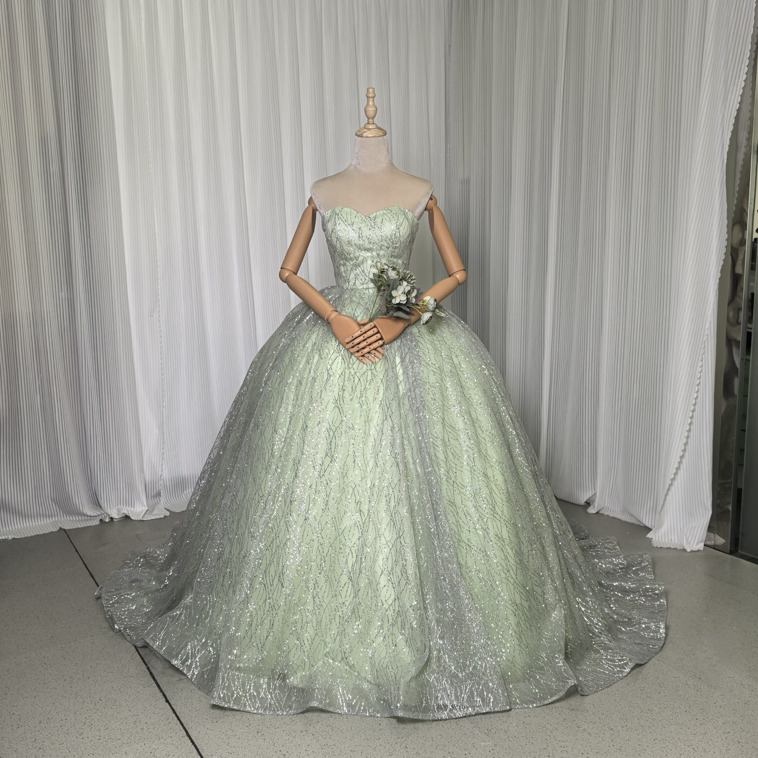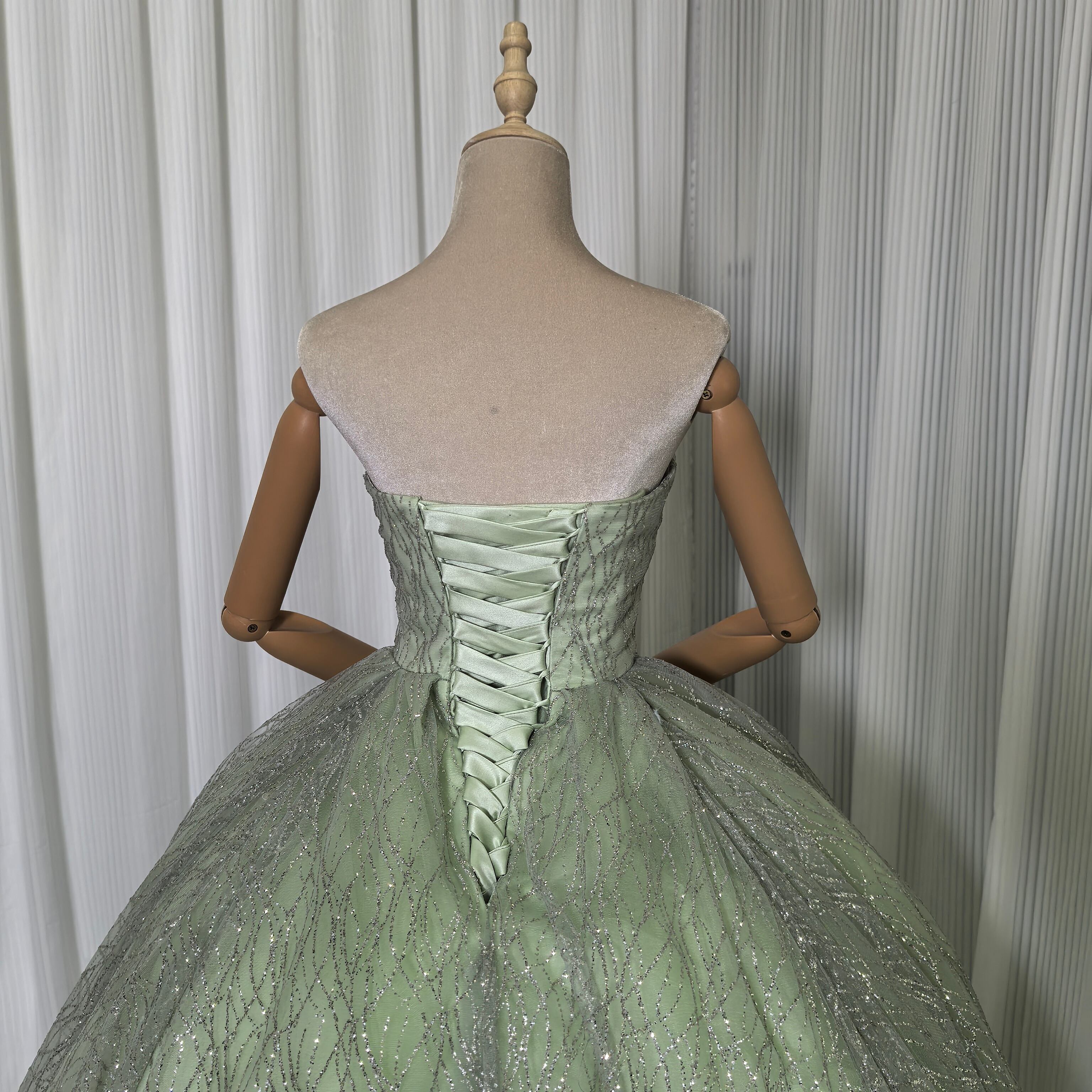 カラードレス ライトグリーン ベアトップ キラキラグリッターチュール プリンセスライン 編み上げ 花嫁