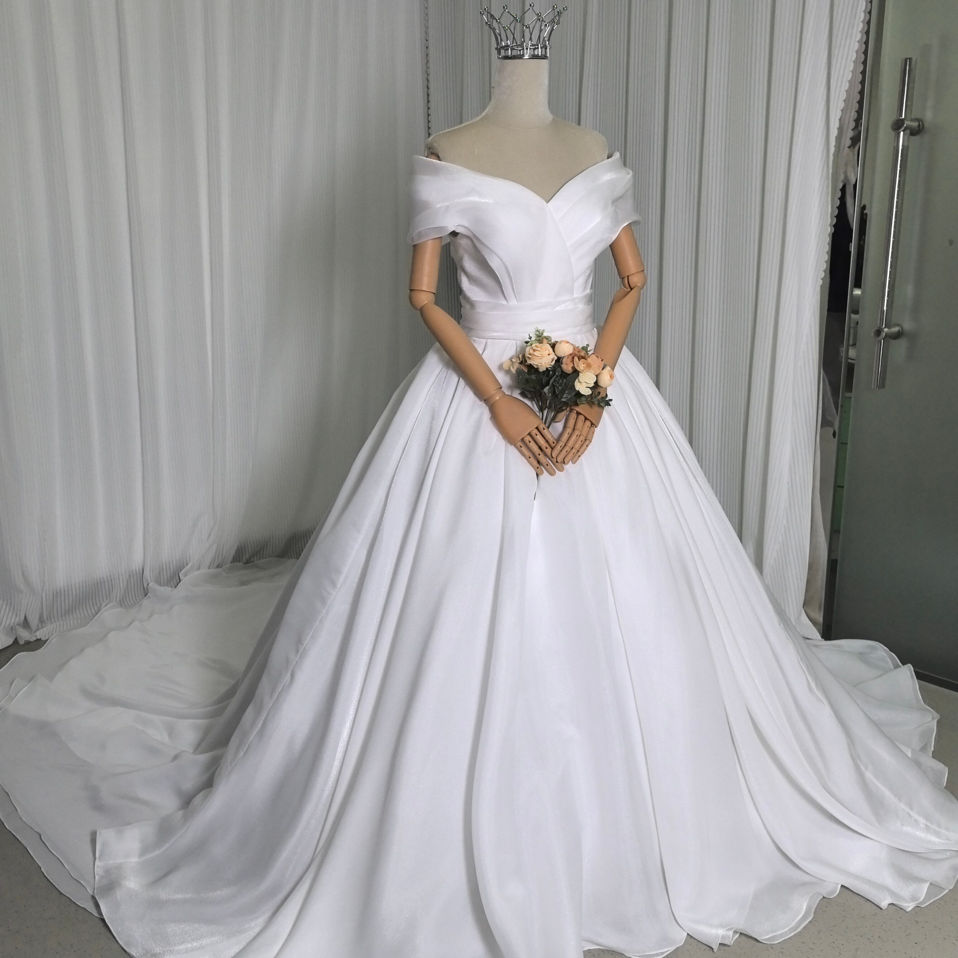ウェディングドレス オフショルダー 編み上げ Aライン 披露宴/結婚式 エレガント ロングトレーン