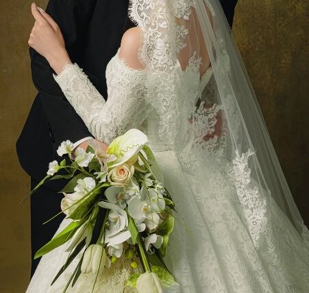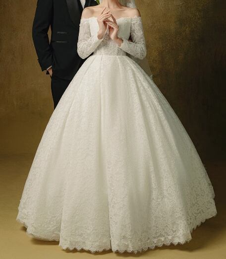 ウエディングドレス オフショルダー 長袖 贅沢な小花総レース プリンセスライン 拳式