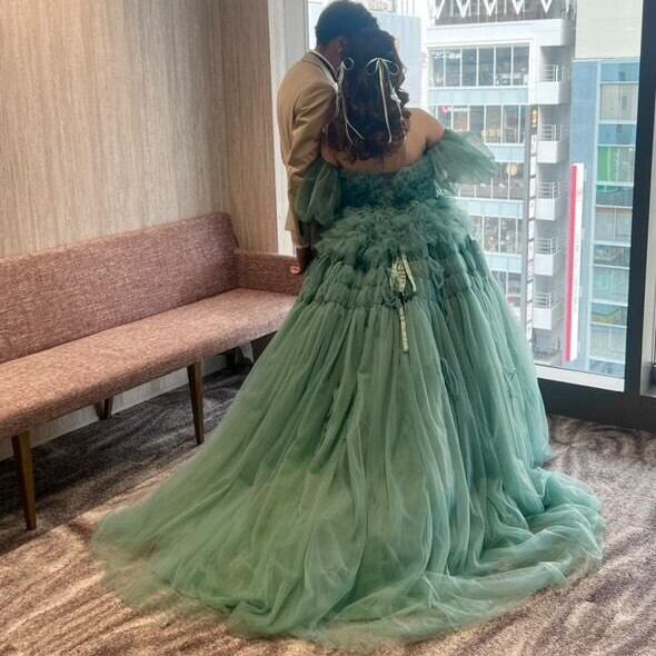 実例写真!カラードレス ブルー パーティードレス パフスリーブ 柔らかく重ねたチュールスカート リボン 結婚式