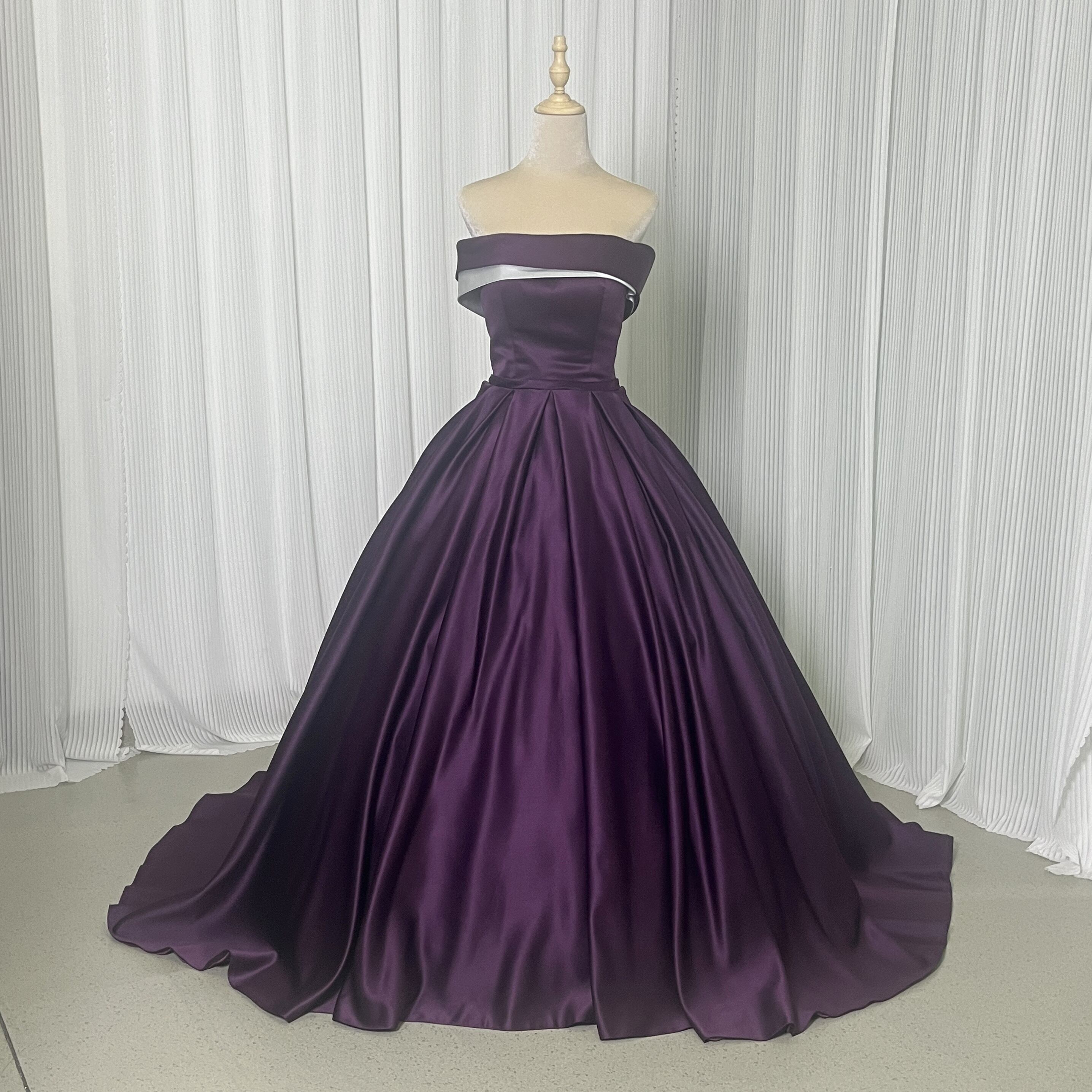 カラードレス パープル オフショルダー 光沢サテン Aライン ファスナー 披露宴 二次会