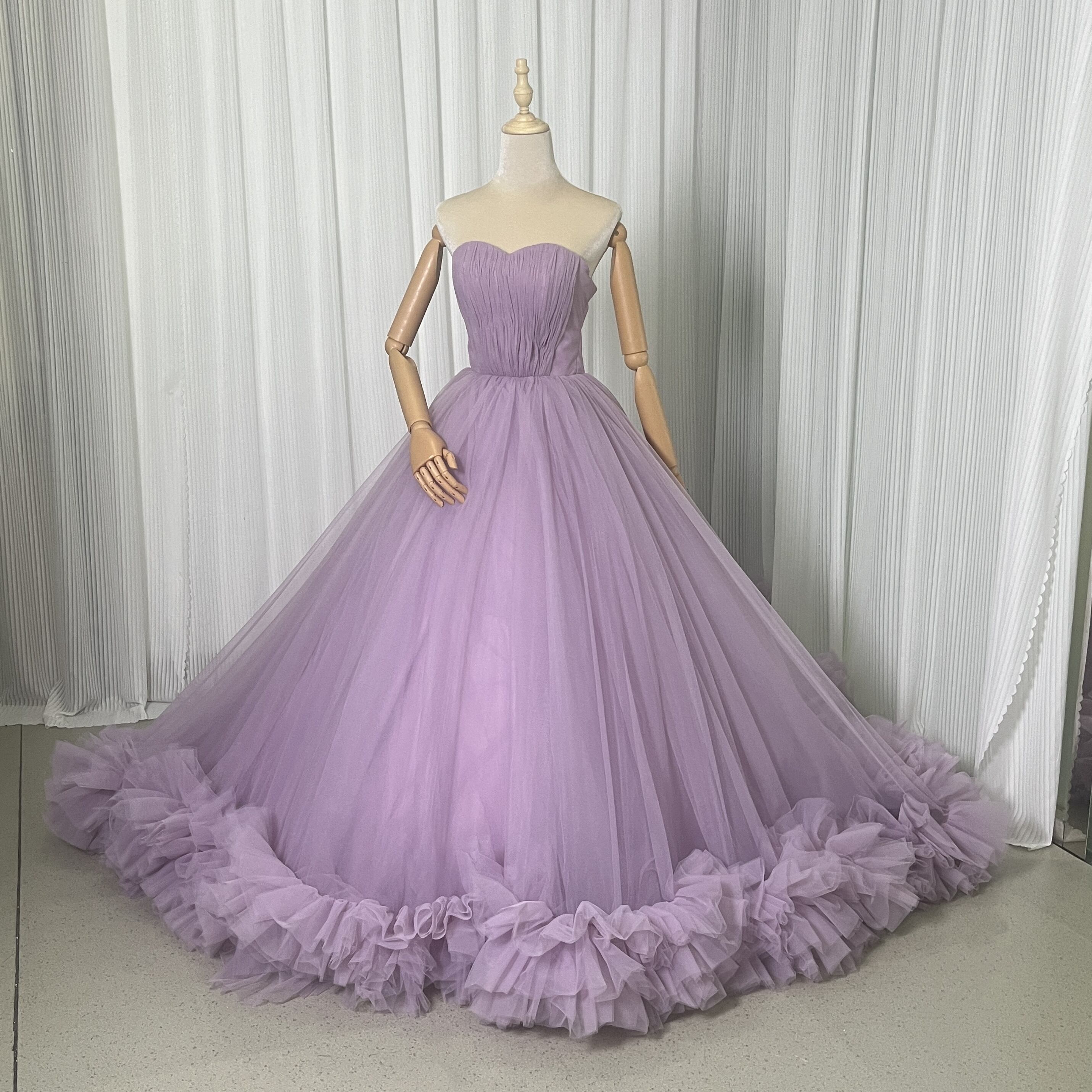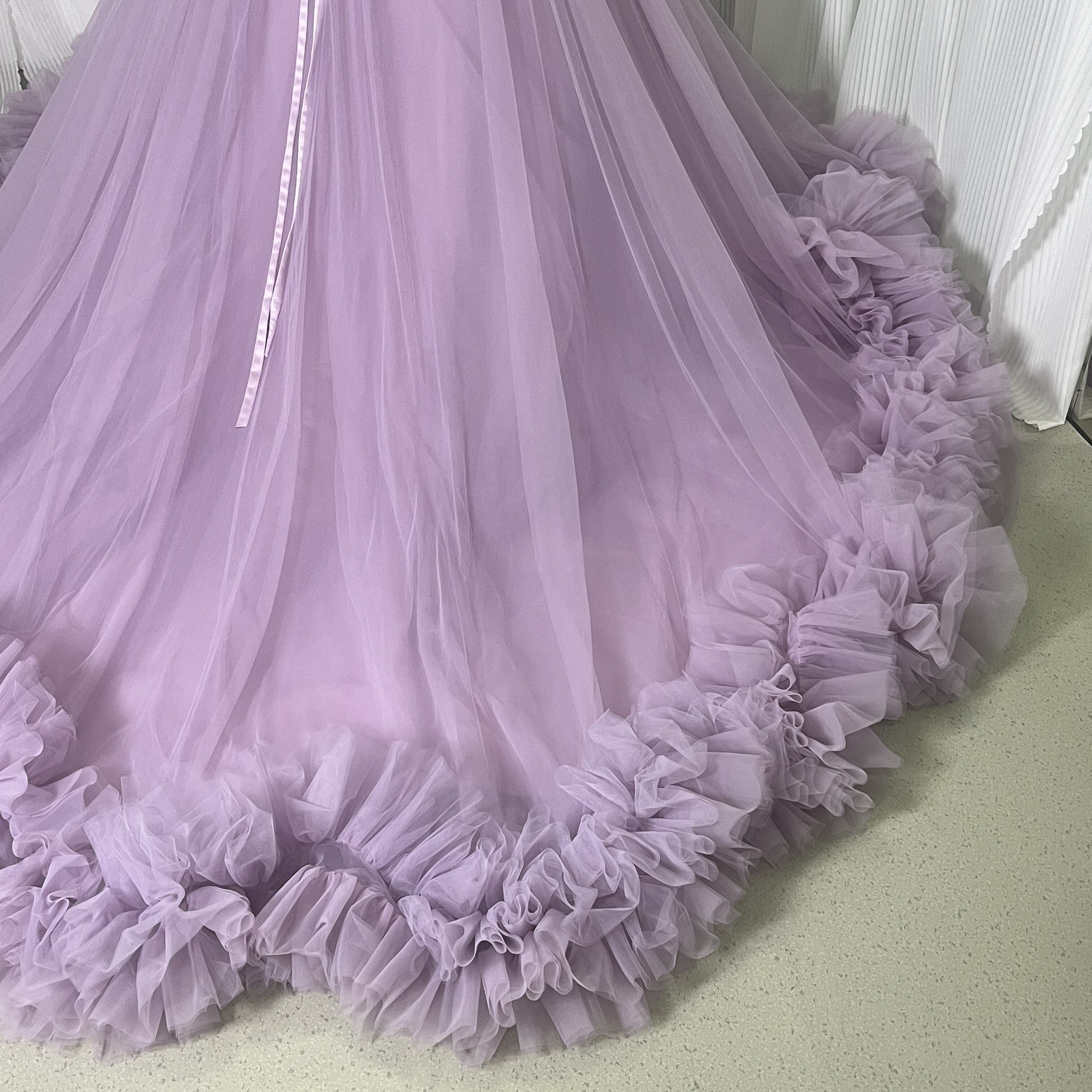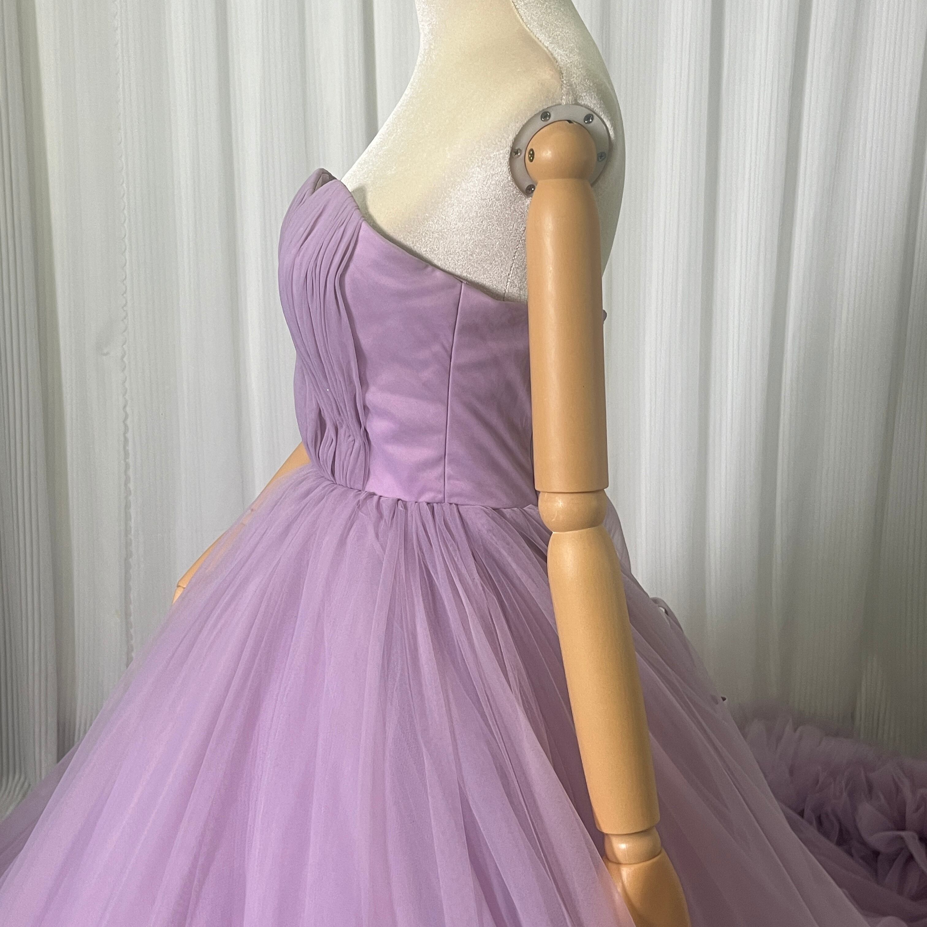 人気上昇!カラードレス パープル ベアトップ ラッフルフリル 華やかなトレーン 花嫁